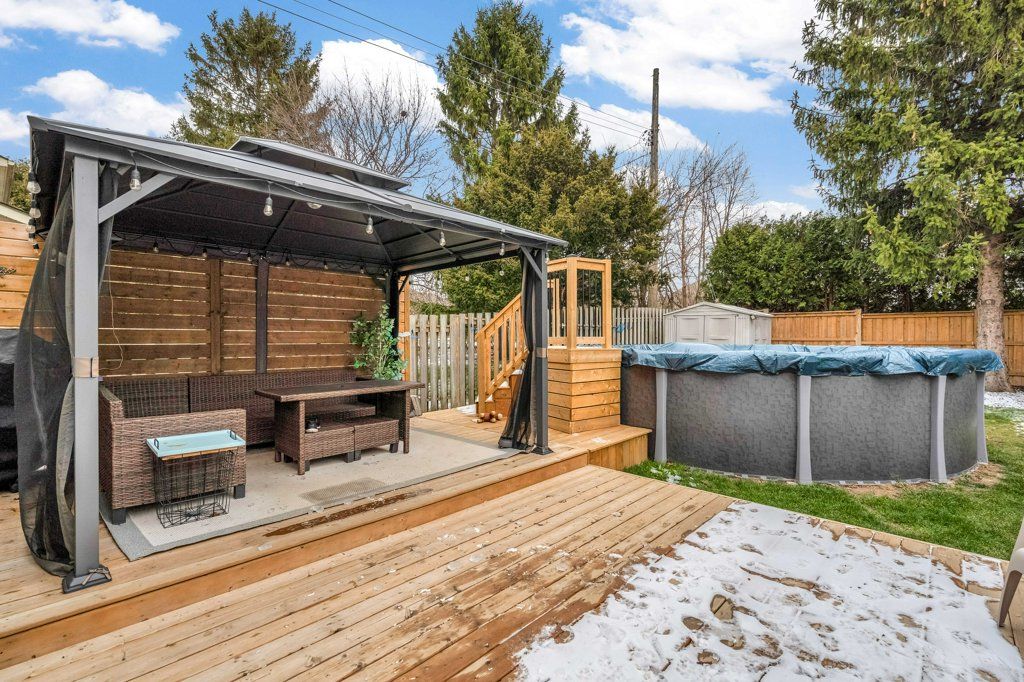 Welcome to 14 penhale! This beautiful move-in ready home is located in the desired mitchell hepburn school district. The living room features large windows with lots of natural light and hardwood floor. Flow from the living room into the open concept ceramic tiled kitchen/dining area with loads of cupboard space, tiled backsplash, quartz countertop, island and upgraded lighting, sink and fixtures. Off of the kitchen is a new deck off the 18 foot above ground gas-heated pool. The backyard is a rare gem featuring oversized mature pine trees adding loads of privacy. Also located on the main level is a powder room and laundry room. Also off the kitchen is the entry to the garage - perfect placement to bring in the groceries. Upstairs you'll find a large primary bedroom with 4 piece ensuite, walk-in closet, and balcony overlooking the front of the property. The upper level includes 2 additional generously sized bedrooms, a 4pc bathroom, and linen closet. Downstairs you will find plenty of additional living space with a large family room, another 4 pc bathroom and loads of storage. This home, lot and location are a rare find. Don't hesitate and make 14 penhale your new home today!
