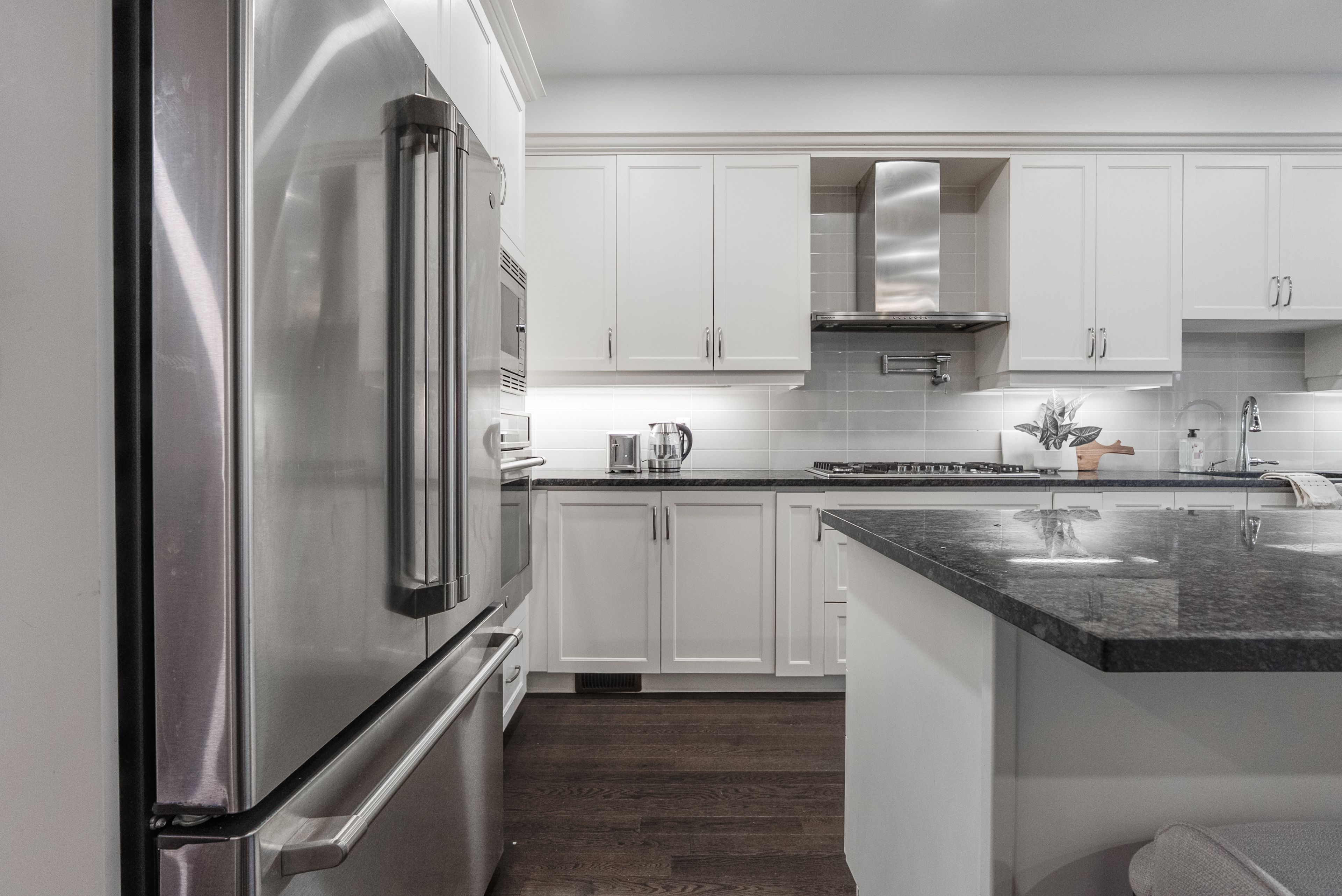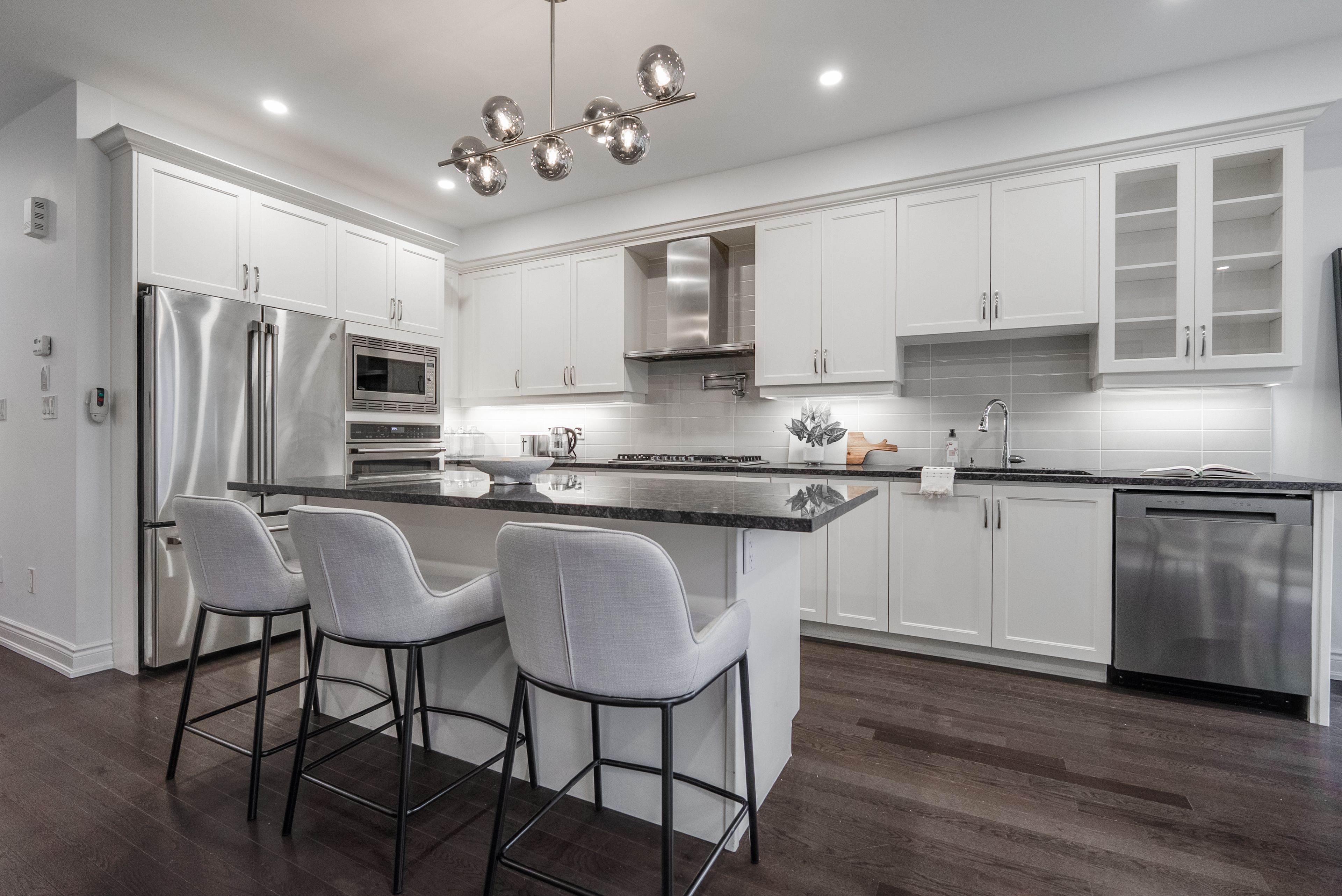 • Bright, open-concept second floor features a chef's kitchen and electric fireplace.