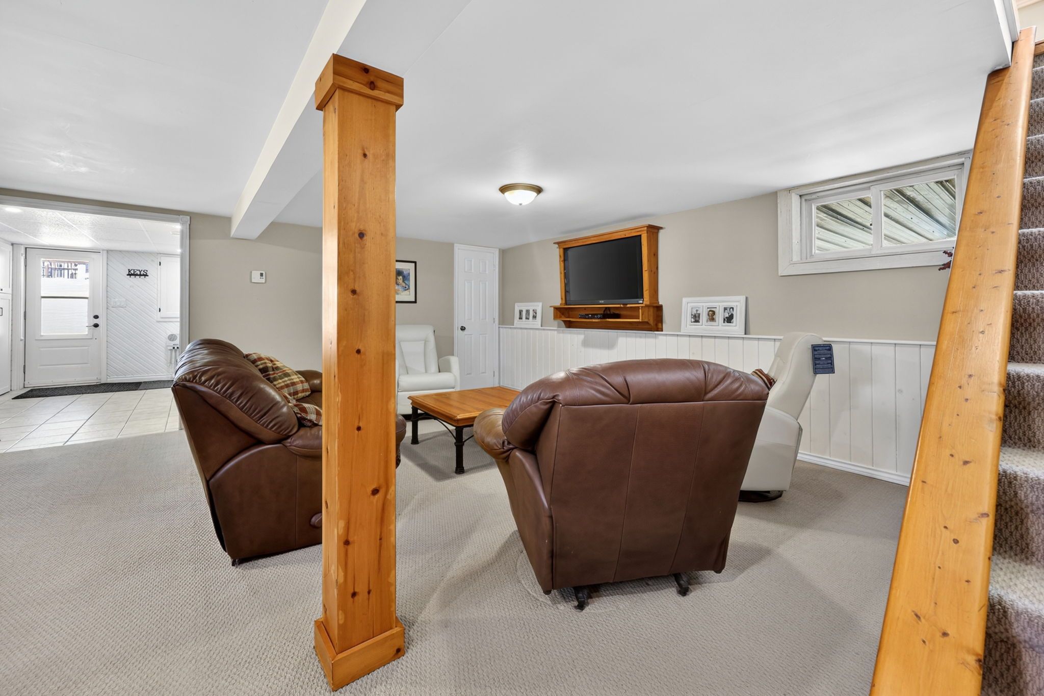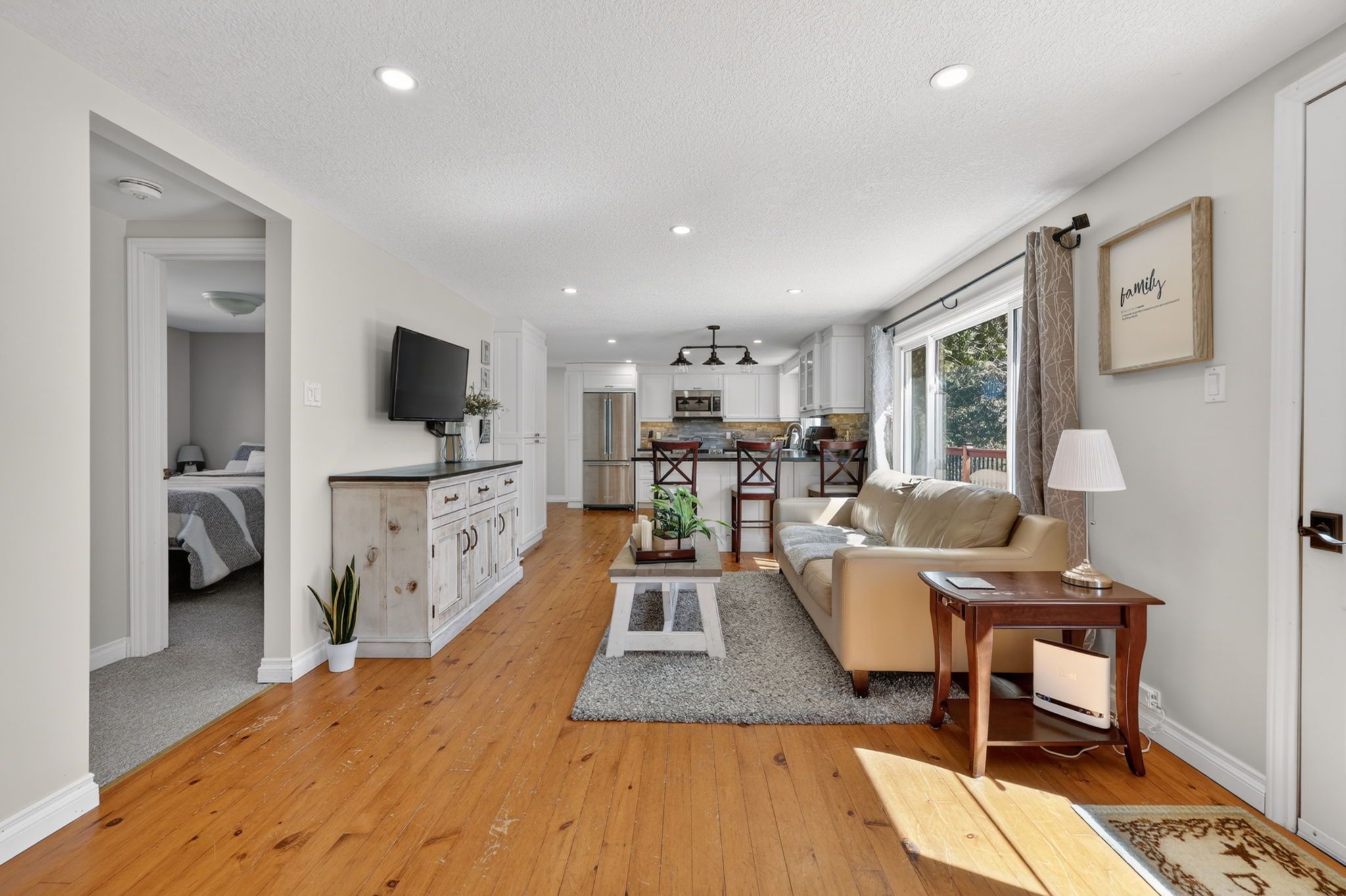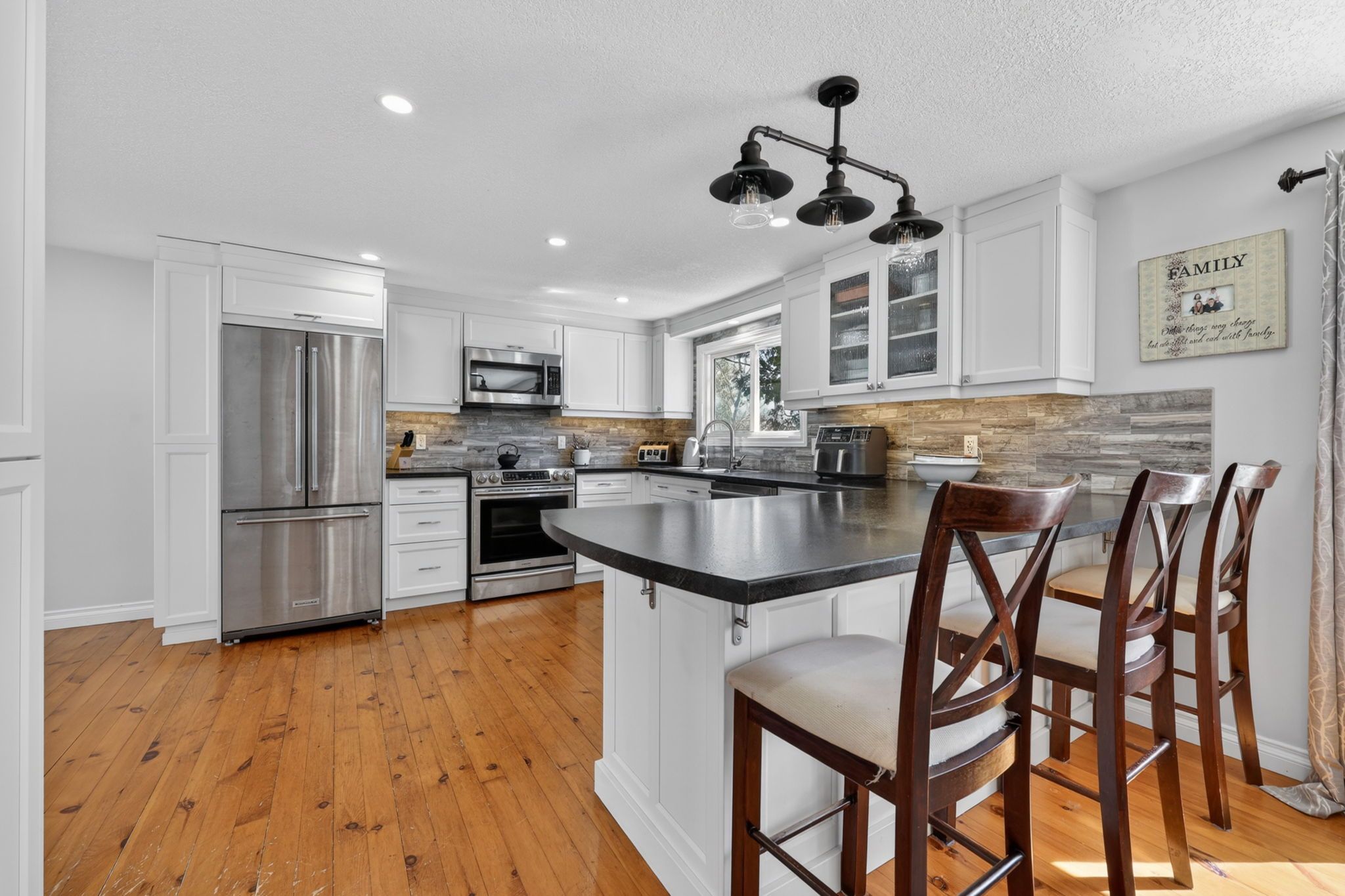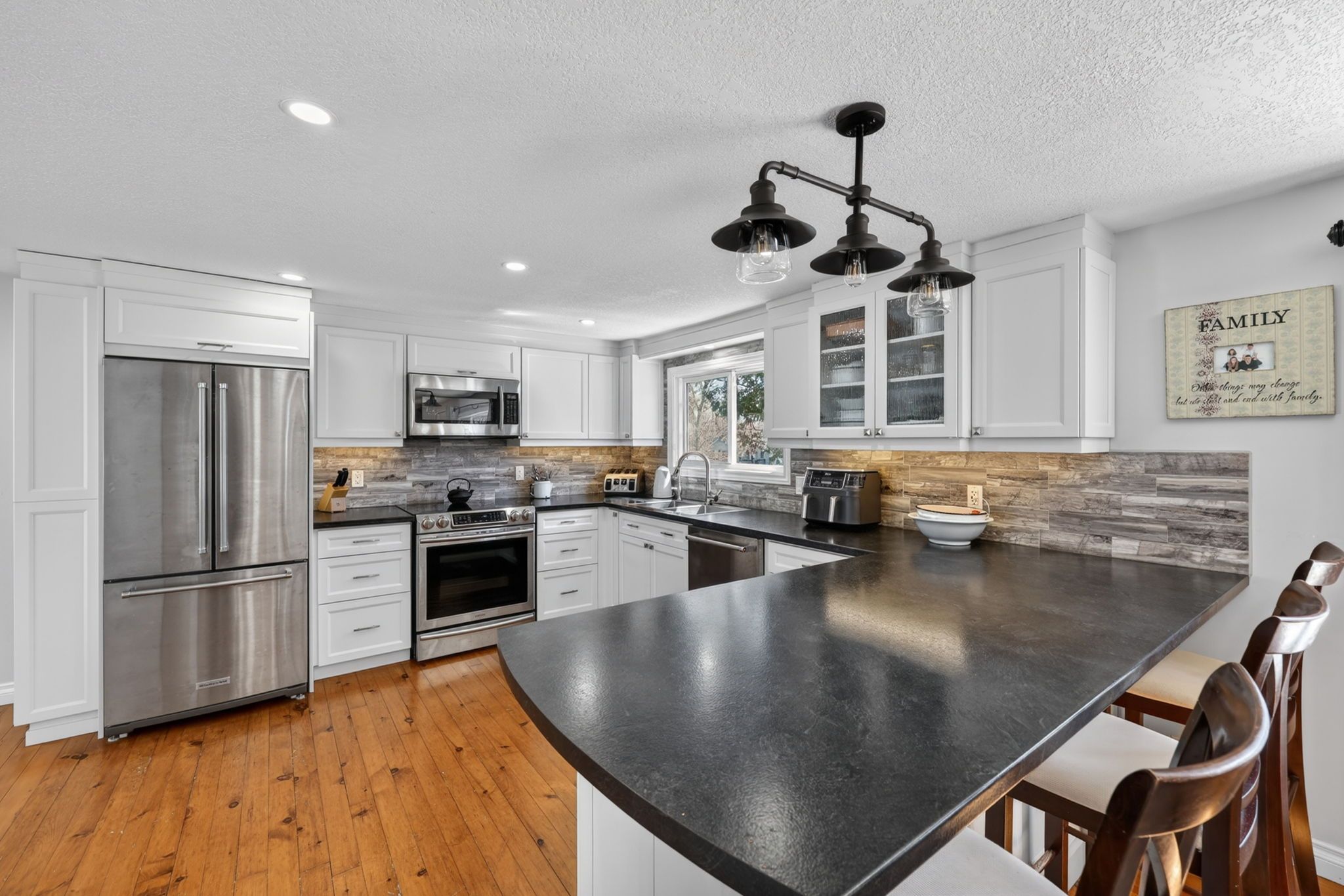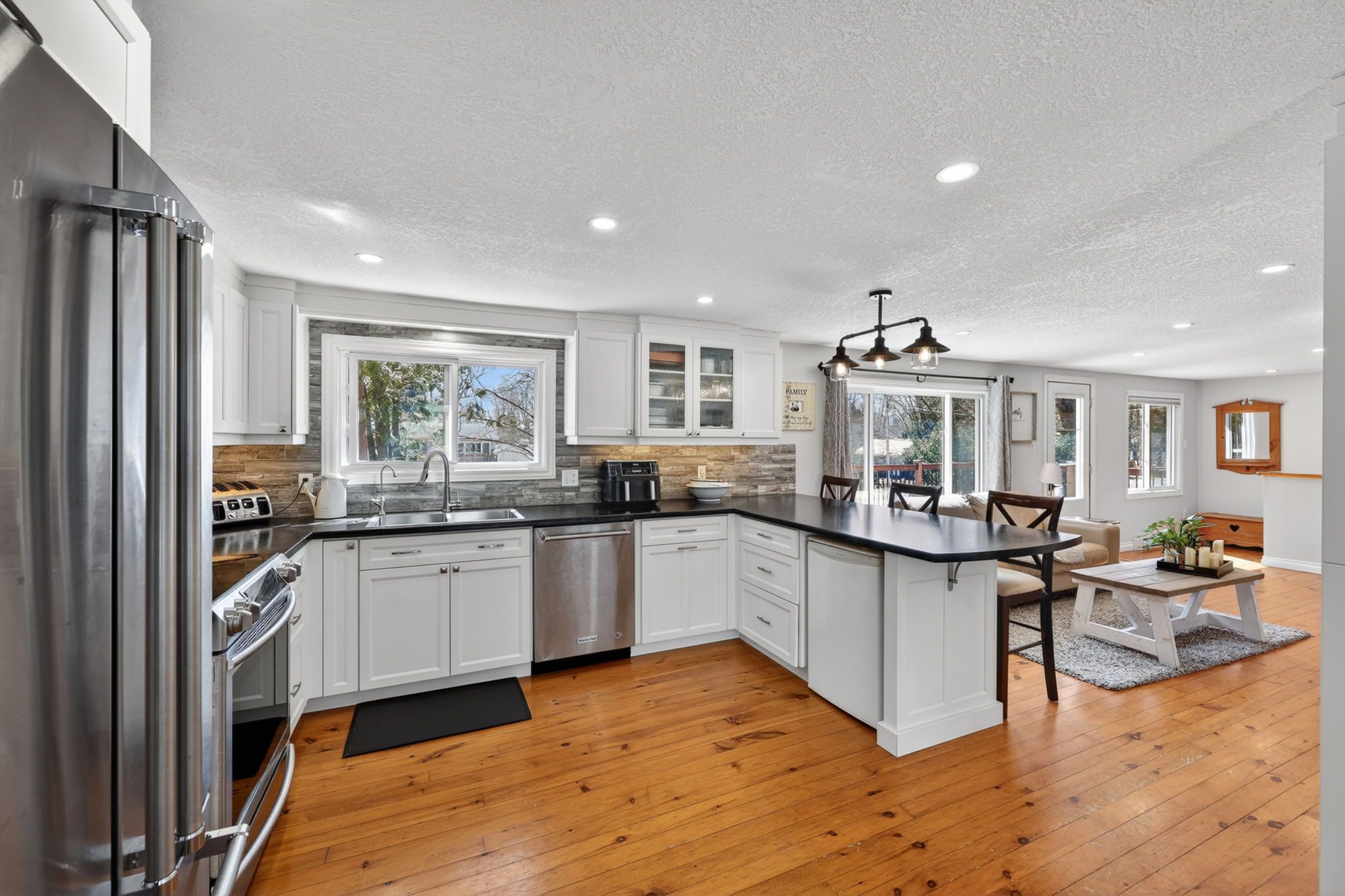 Detached shop... This charming updated home and immaculate 28' x 30' detached shop is located in desirable family friendly waterfront community. The main floor of the home boasts 2 bedrooms, newly updated 4 piece bath with in floor heating (keith lortie kitchens), updated kitchen (keith lortie kitchens) featuring island peninsula, pot lighting, all newer stainless steel appliances, an abundance of natural light and walk out to private deck, hot tub and partially fenced yard. In addition, is a cozy living room with walk out to front deck with new railing and stairs. The lower level is ground level walk out and features a 3rd bedroom, 2nd bath, spacious family room with wood burning fireplace and mud room/laundry entrance all allowing for in law potential. The amazing bonus is the immaculate detached shop with concrete flooring, radiant heat, water, a/c, independent electrical panel, and 10' wide x 9. 8 ft high garage door. Extra features include: kinetico water system, new privacy wood fencing, up to 10 car parking, and all within minutes walk to private waterfront parkette. ++++