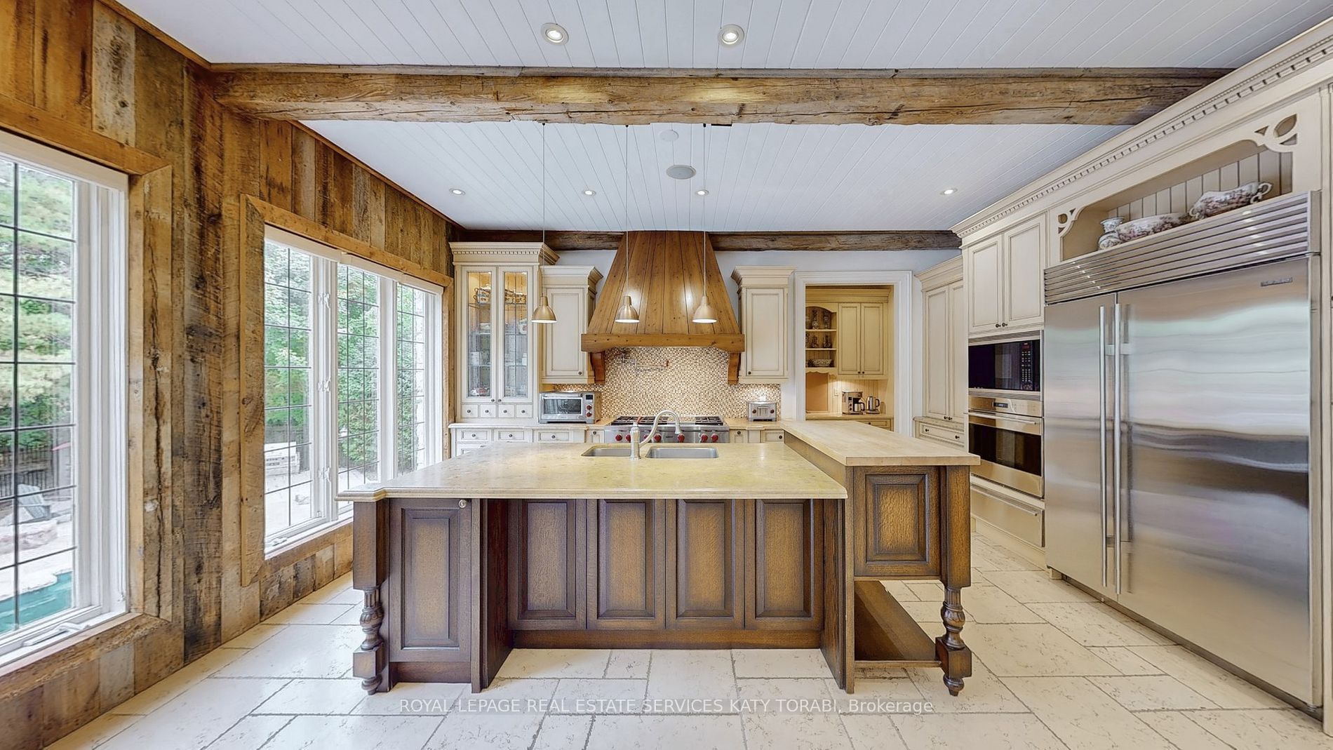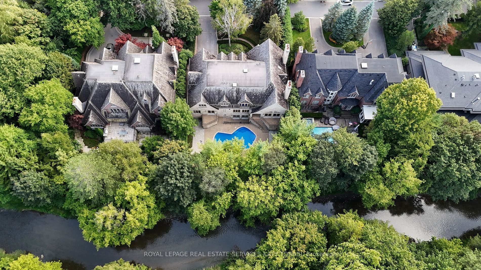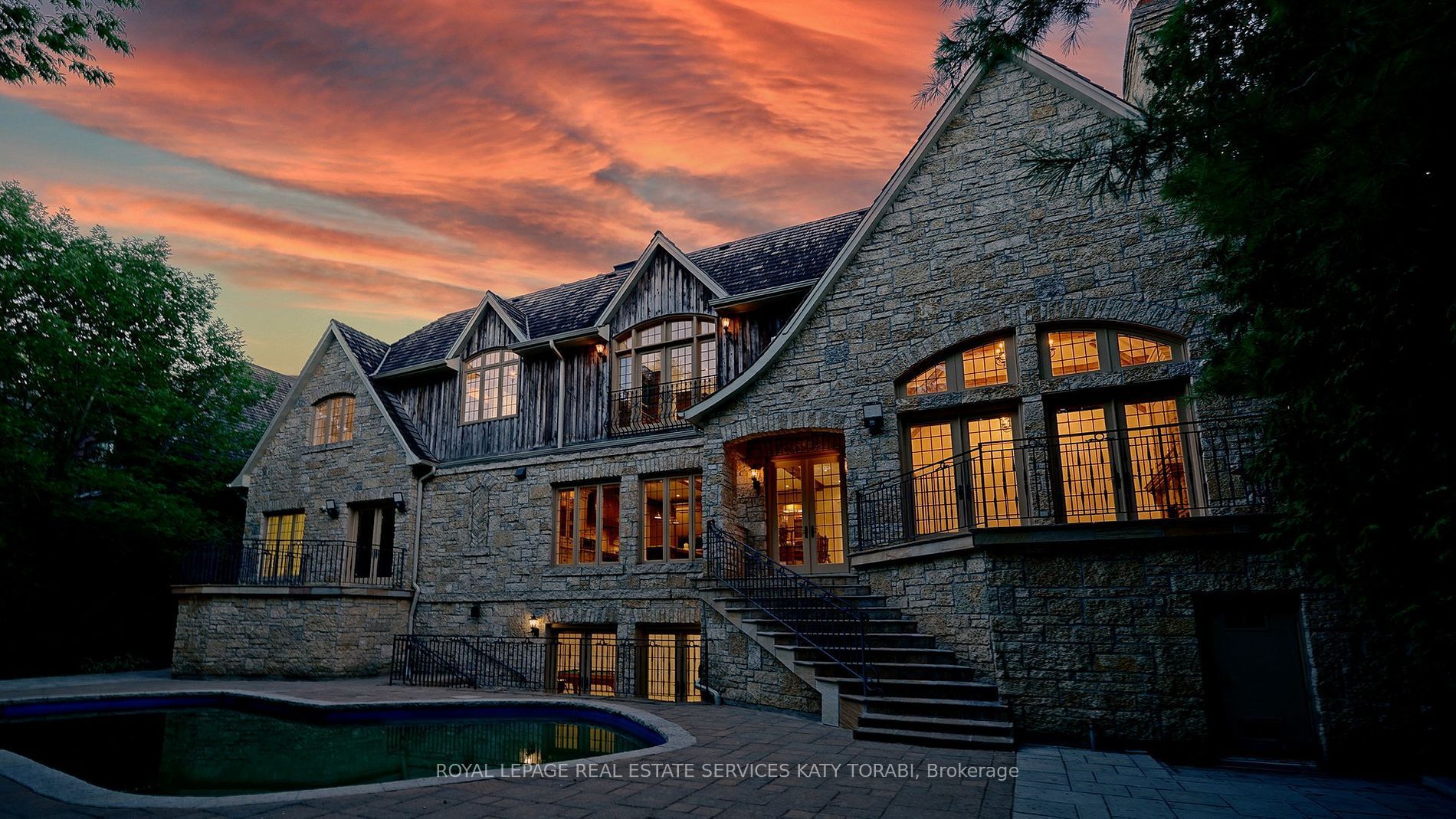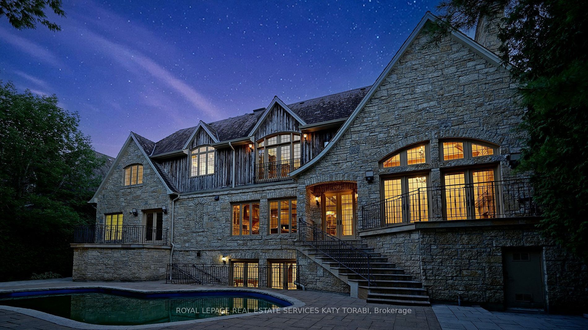 Welcome to 14 saint margarets drive, a european-inspired limestone and tyndall stone masterpiece nestled on one of the most picturesque and prestigious streets in hoggs hollow. This estate showcases a rare tyndall stone exterior prized for its distinctive rich patterns combining architectural prestige with natural elegance. Its unique textures lend an air of exclusivity and sophistication rarely found in a private residence, complemented by a cedar shake roof. Majestically sited on a premium 90 by 150 ft lot backing onto the river, this residence offers over 9,000 sq. Ft. Of luxurious living space where timeless craftsmanship meets modern comfort. A grand foyer with stained glass and domed ceiling introduces interiors of remarkable scale and craftsmanship. The vaulted great room, with vintage beams, soaring windows, and a stone fireplace, serves as a dramatic centerpiece. A formal dining room with serving area, a richly panelled office with patio walkout, and a chefs kitchen with walk-in pantry, oversized island, butlers pantry, and adjoining breakfast area complete the main level. From the kitchen, great room, and office, walk out to three patios overlooking the river, manicured grounds, and pool. The upper level hosts six bedrooms, each with its own newly renovated bathroom. The serene primary suite offers a private balcony, fireplace, walk-in closet, and spa-inspired ensuite with soaker tub, double vanities, and oversized shower. Most rooms capture sweeping river views, while a bright study nook enhances family comfort. The fully finished lower level extends the living space with a recreation lounge featuring fireplace and bar, glass-walled gym, custom wine cellar, nanny suite, walk-in cedar room, media room, and a second kitchen ideal for entertaining or extended family living. Outdoors, enjoy a resort-style retreat with heated pool, outdoor fireplace, built-in bbq, and wood-fired pizza oven, all set among stone terraces, mature trees, & professional landscaping.