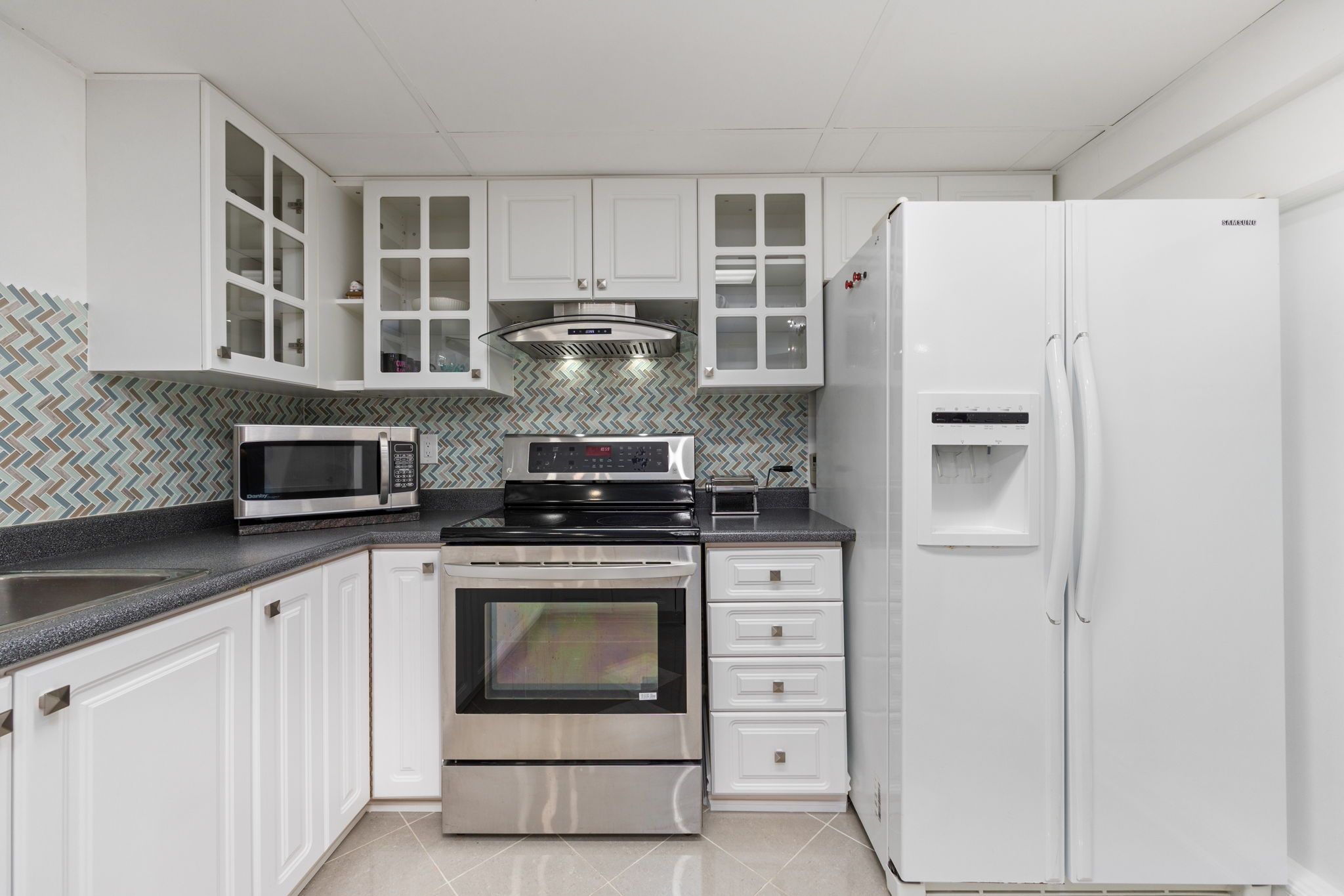 • Open concept living room and kitchen with modern finishes and appliances.