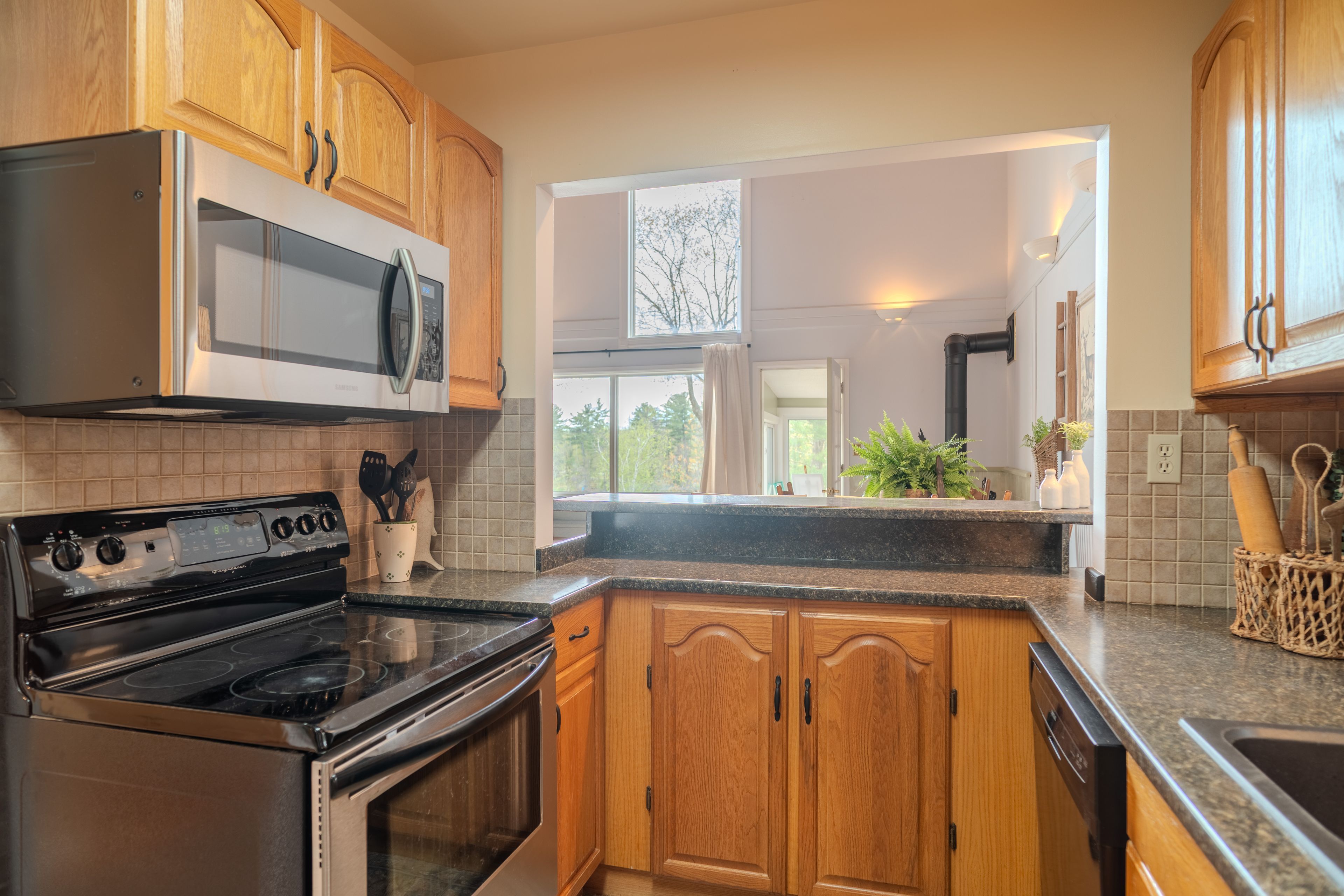 • Open-concept main area with vaulted ceilings and cozy wood stove.