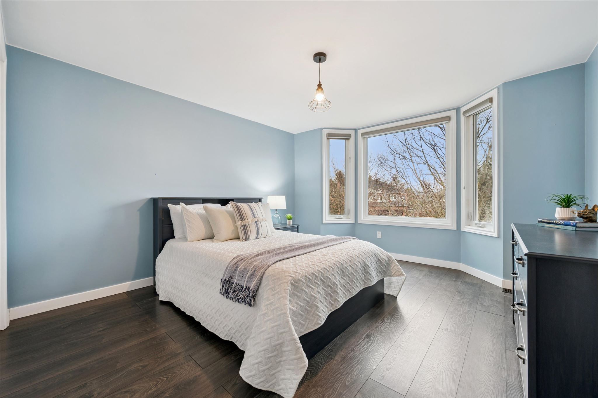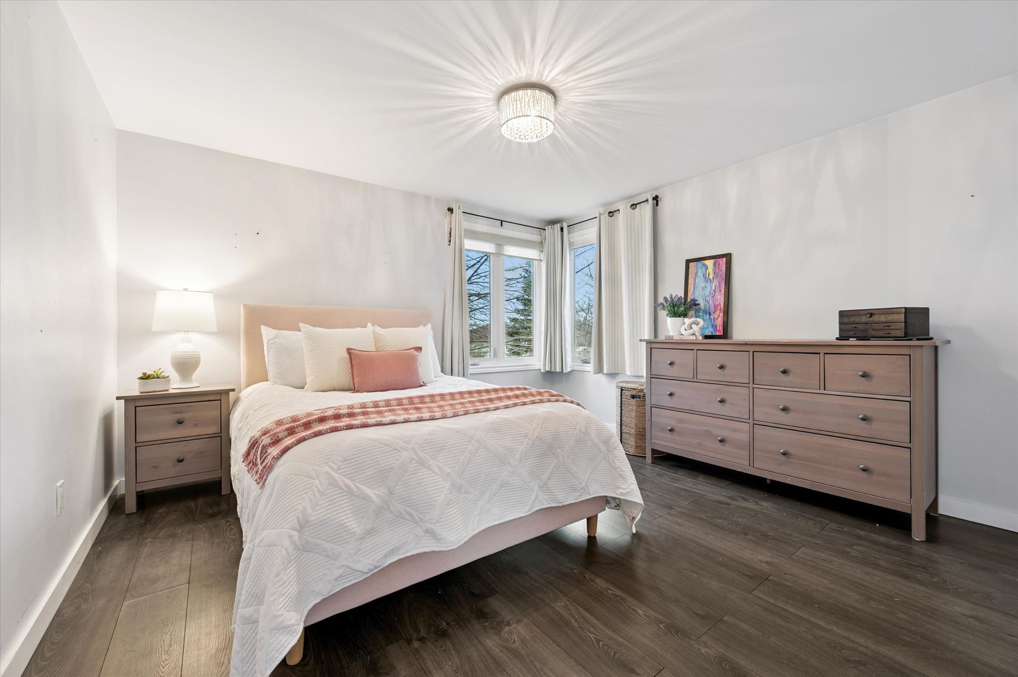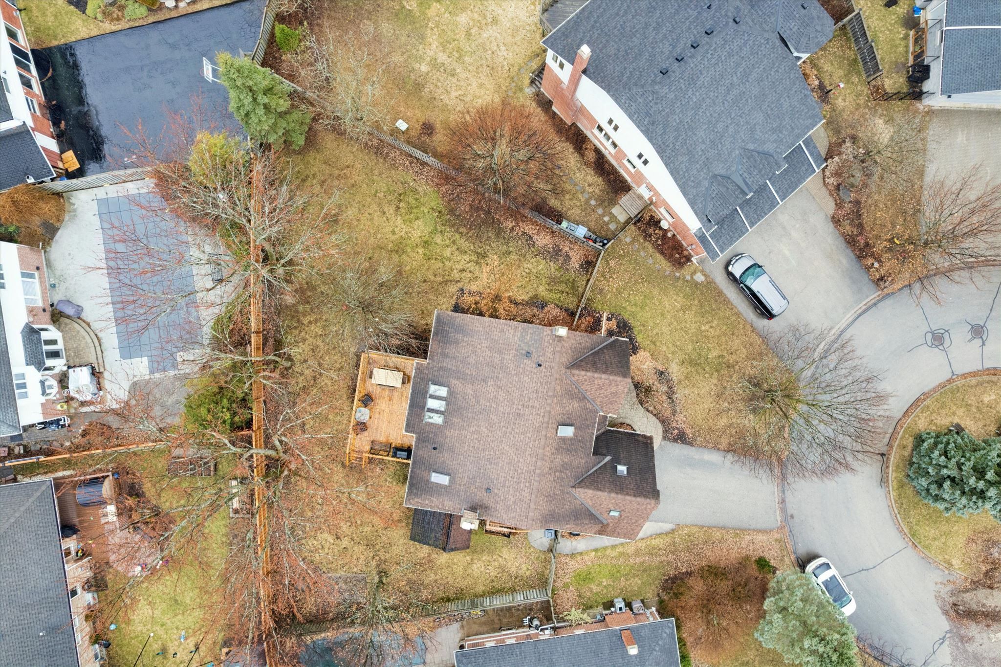 • Spacious pie-shaped lot with mature trees providing privacy and tranquility.