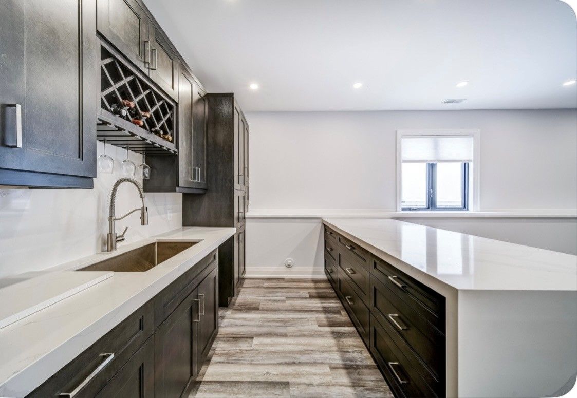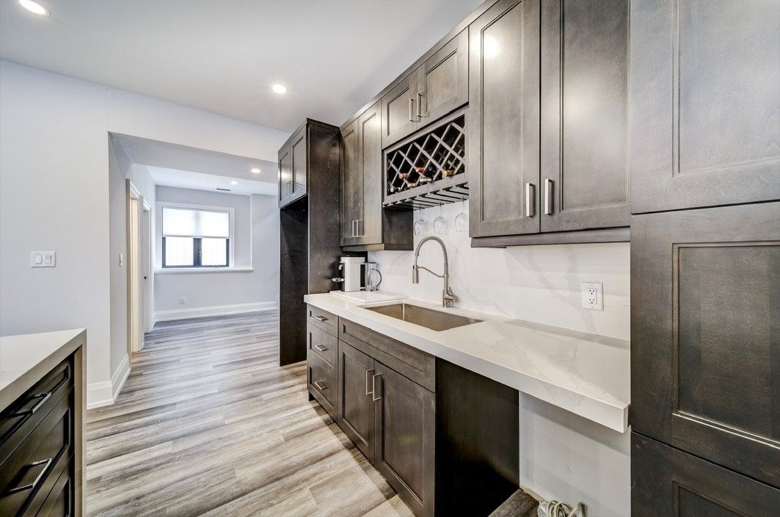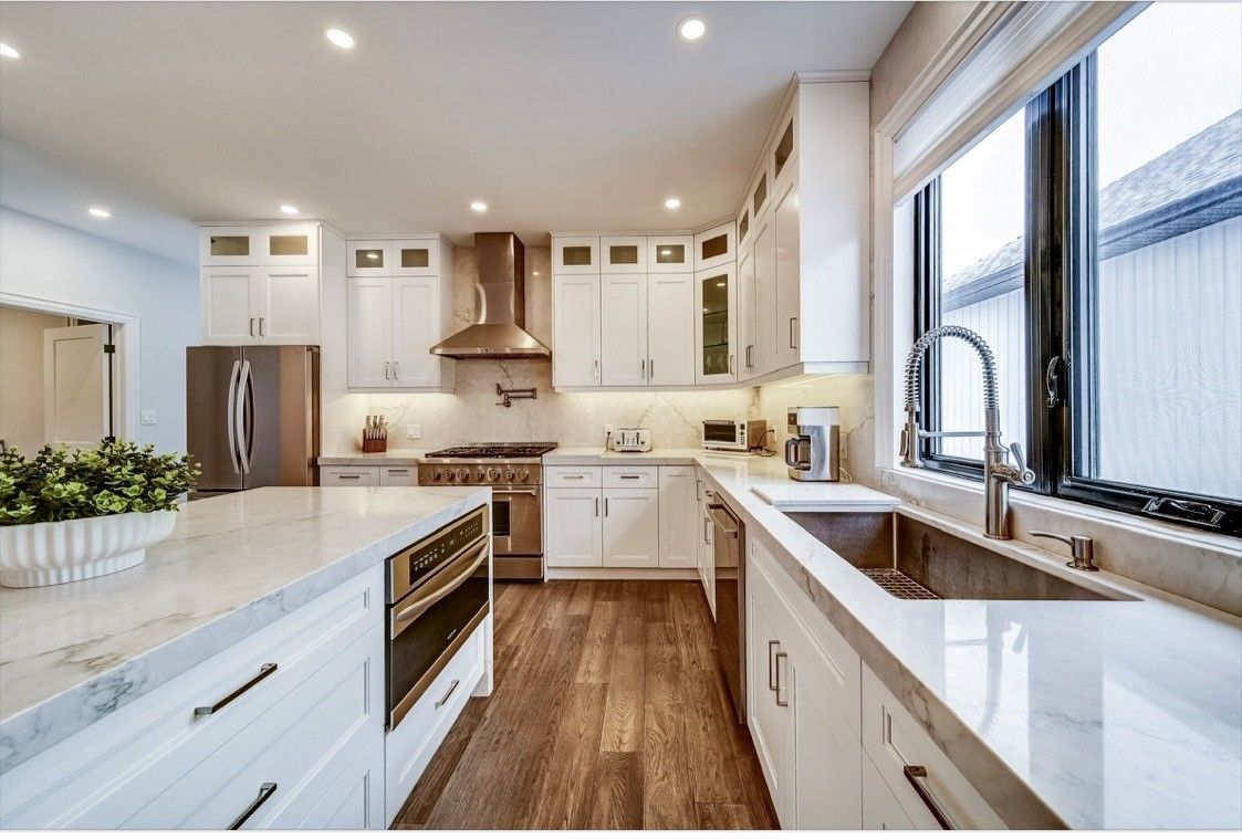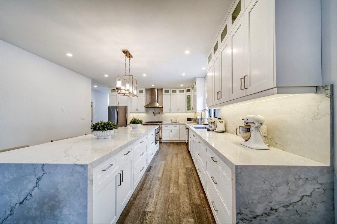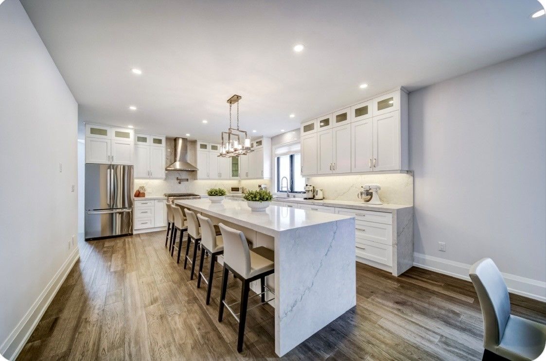 • Open-concept kitchen with custom quartz countertops and premium stainless steel appliances.