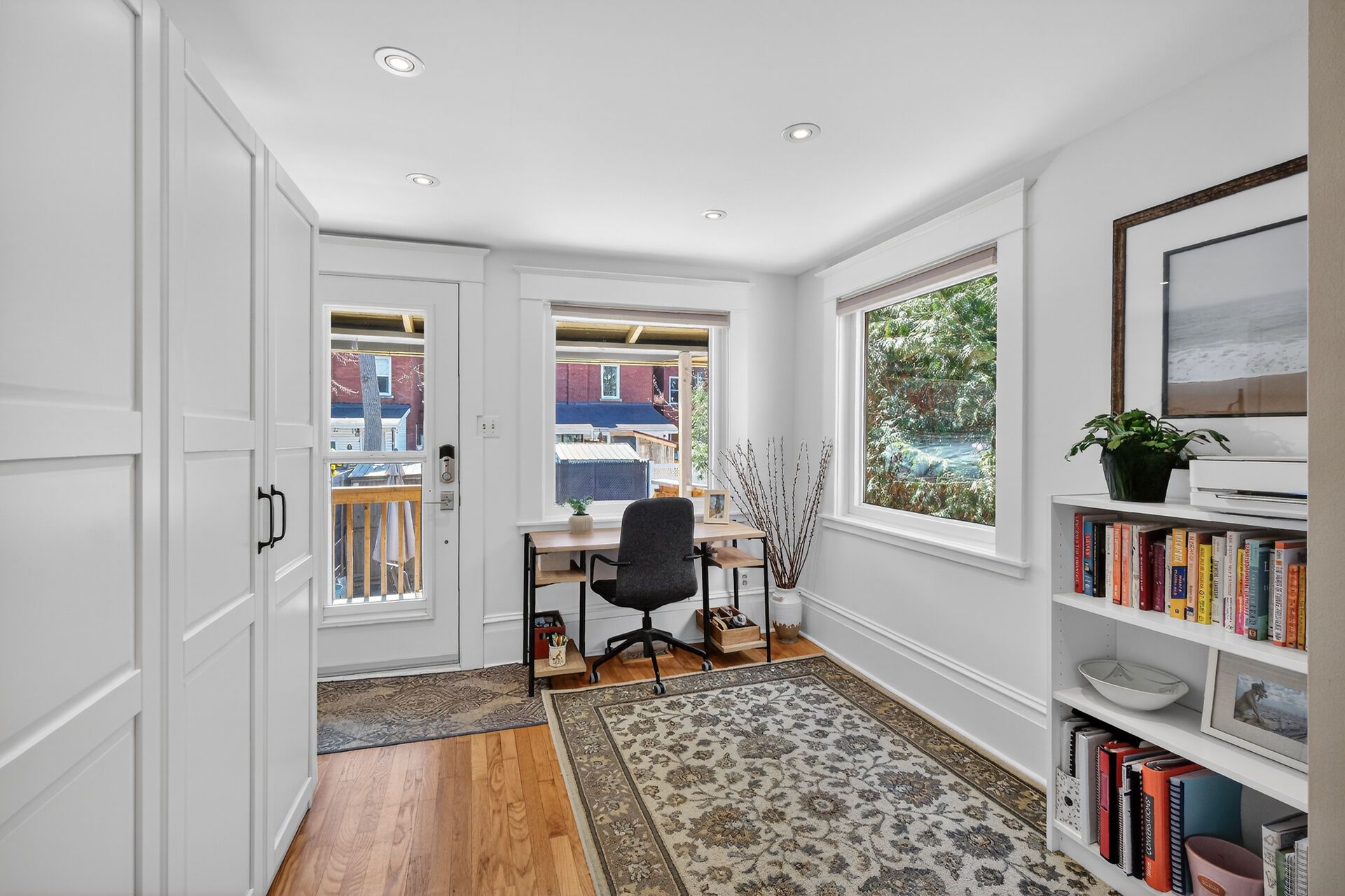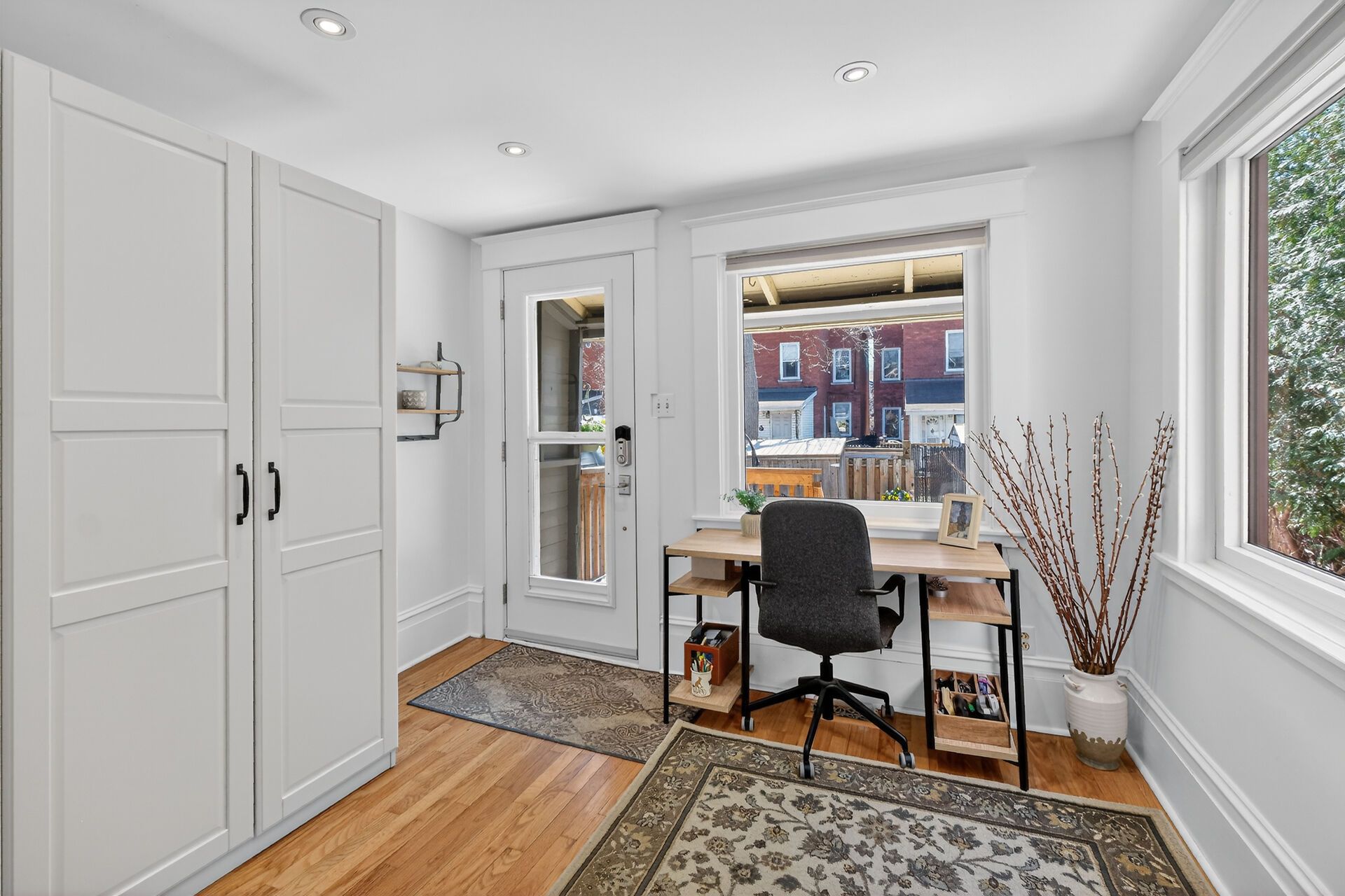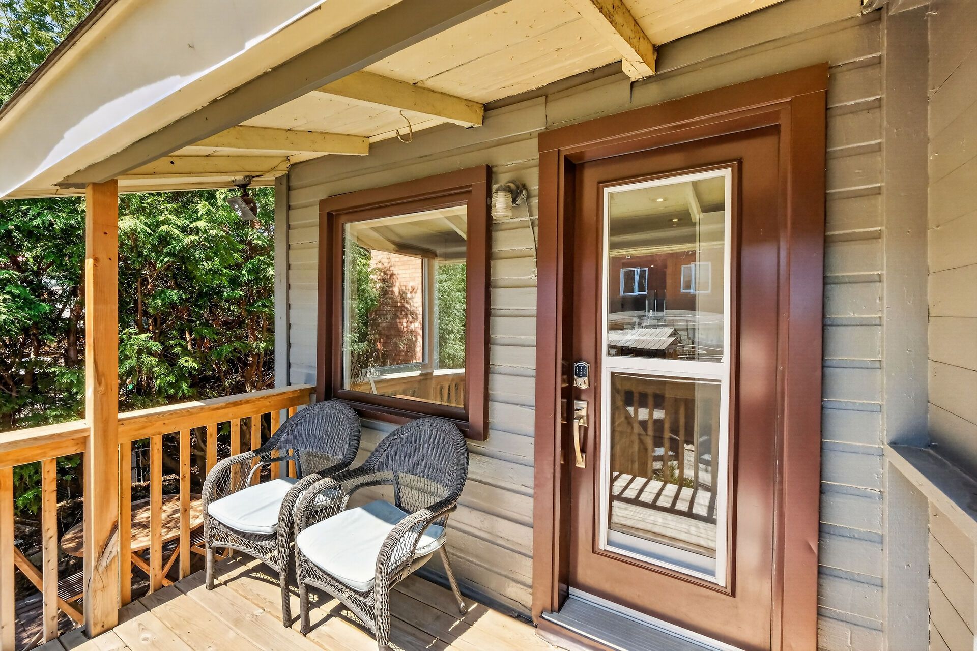 • Versatile mudroom/den with custom storage and access to a covered deck.
