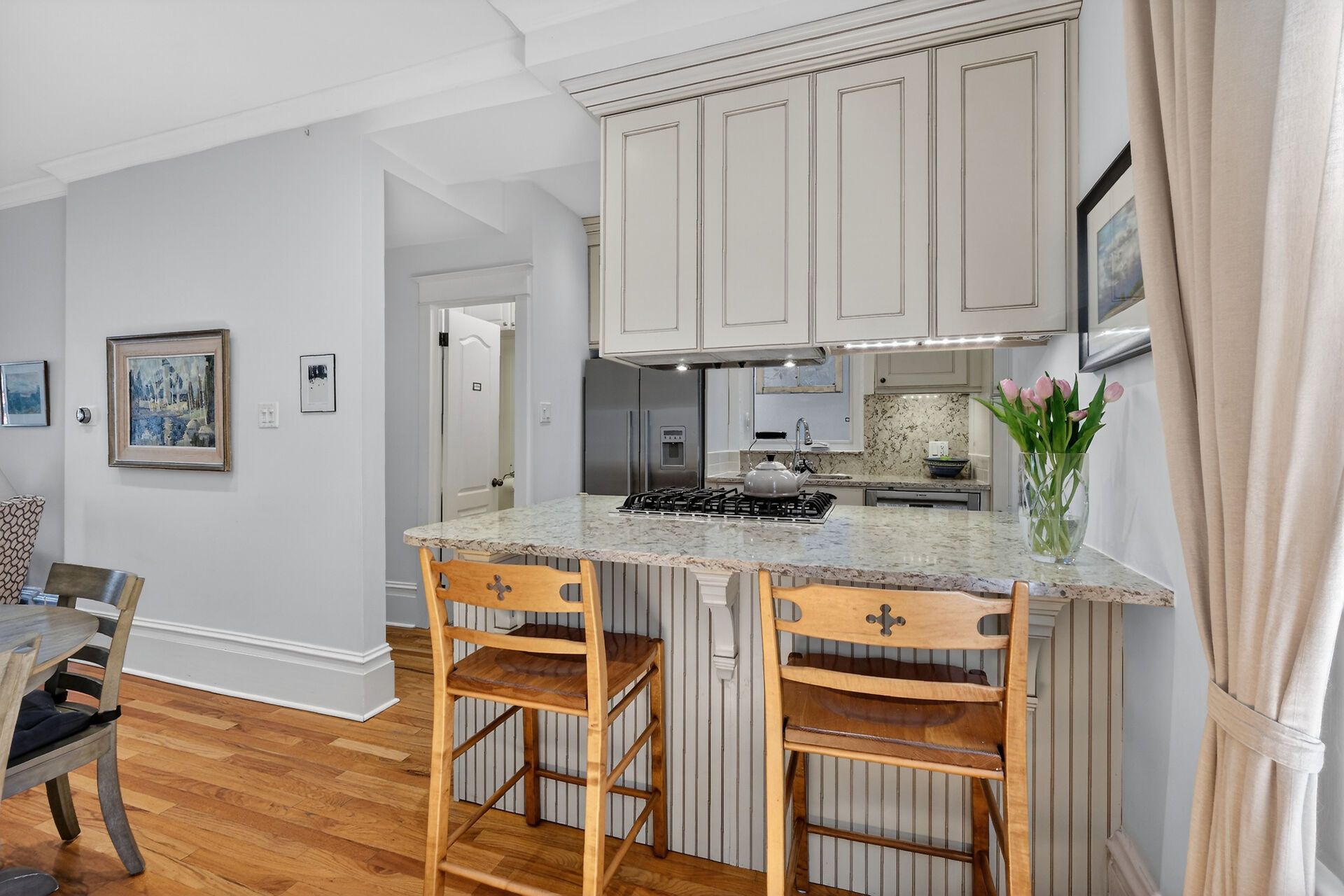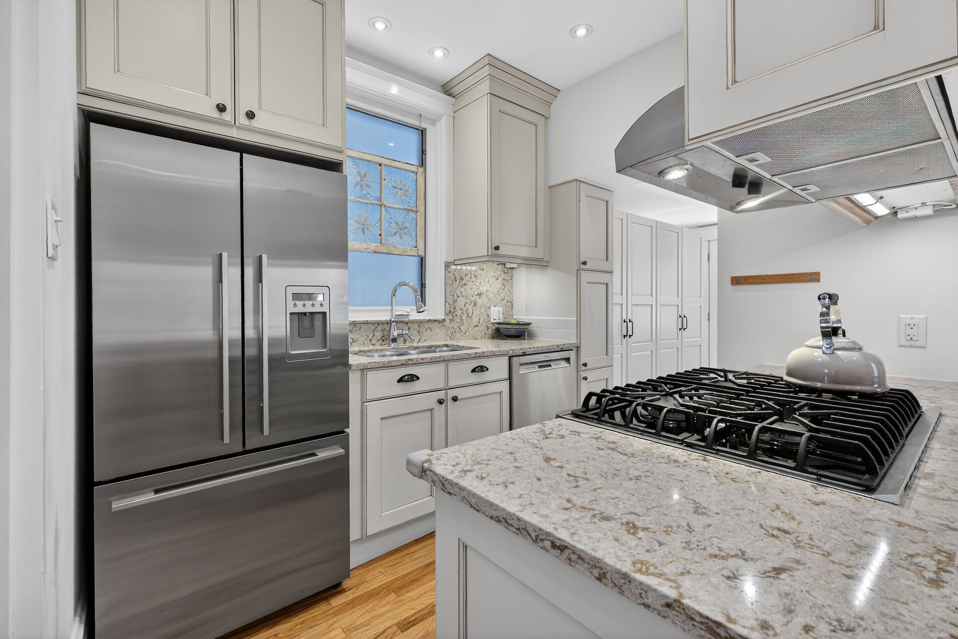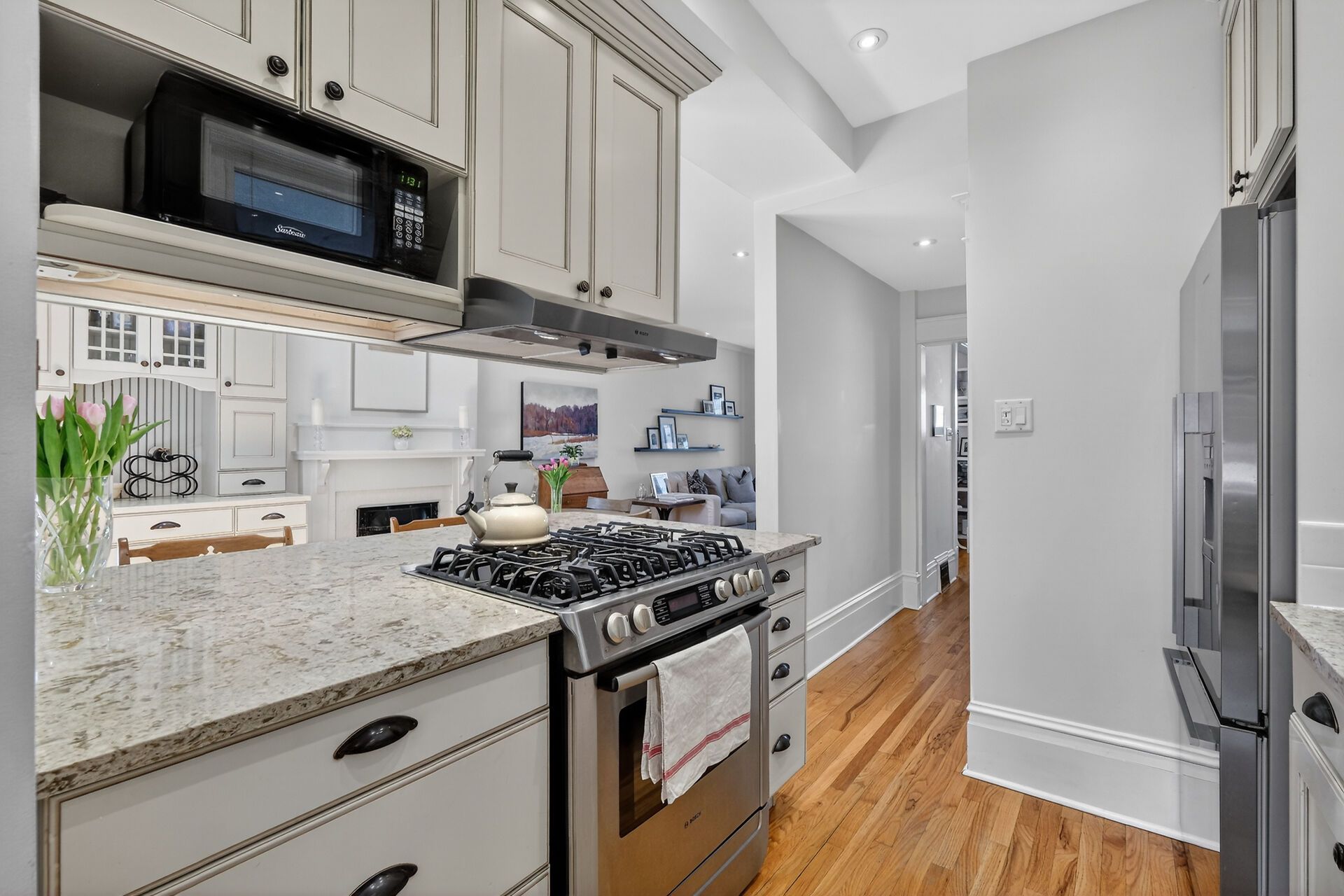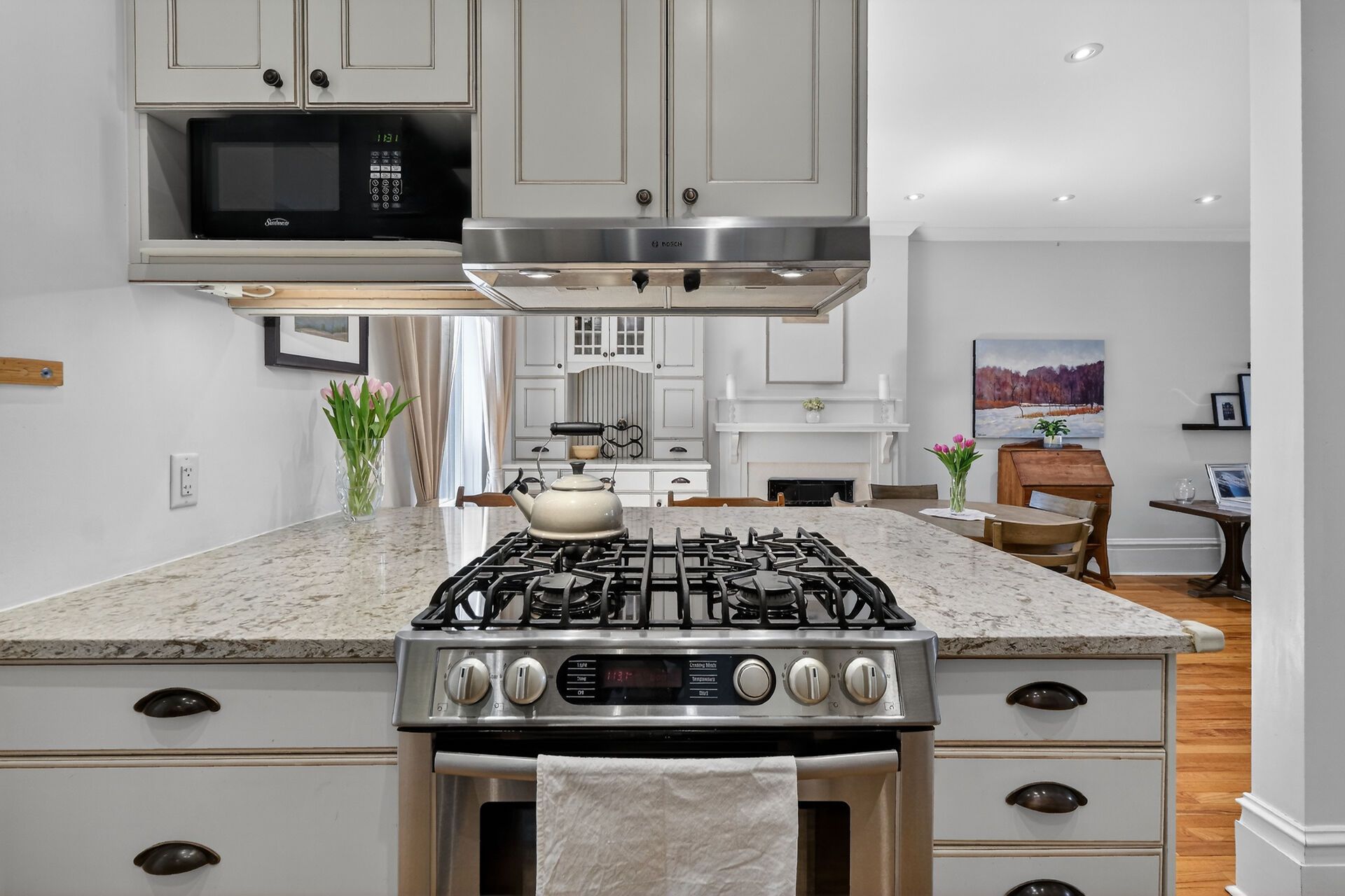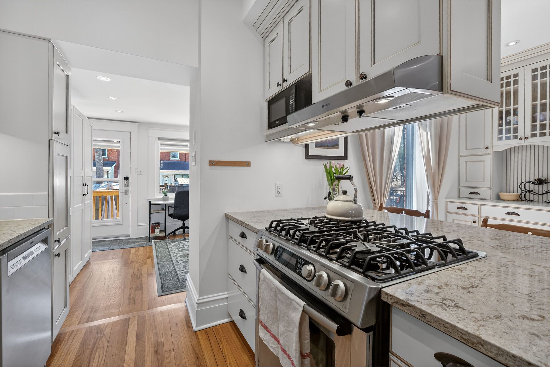 • Gourmet kitchen featuring quartz countertops and a gas stove.