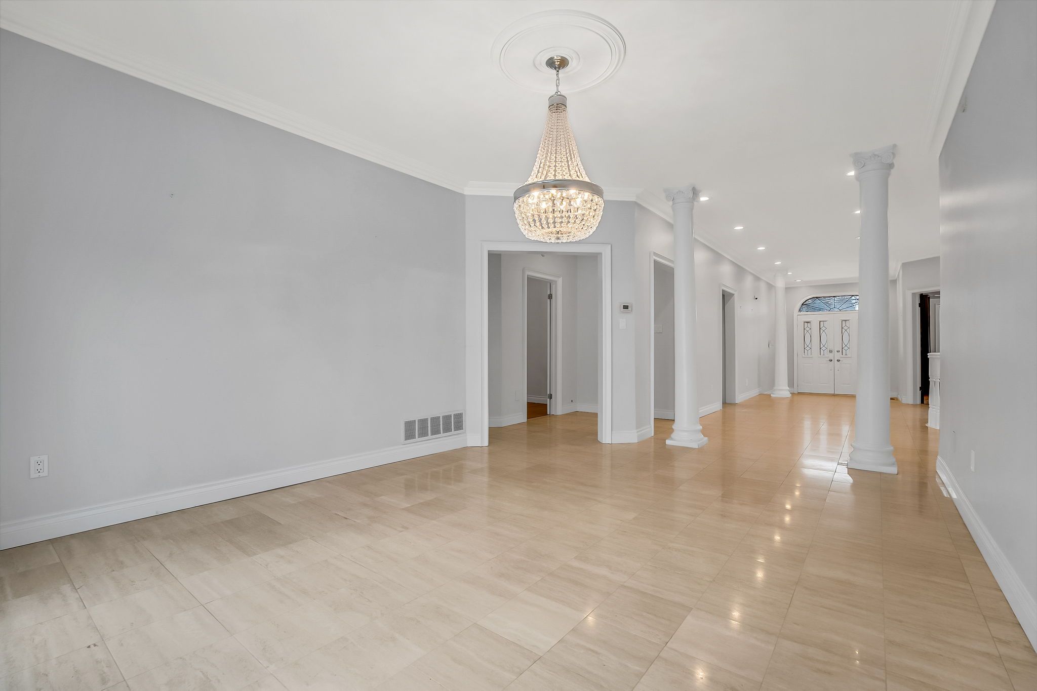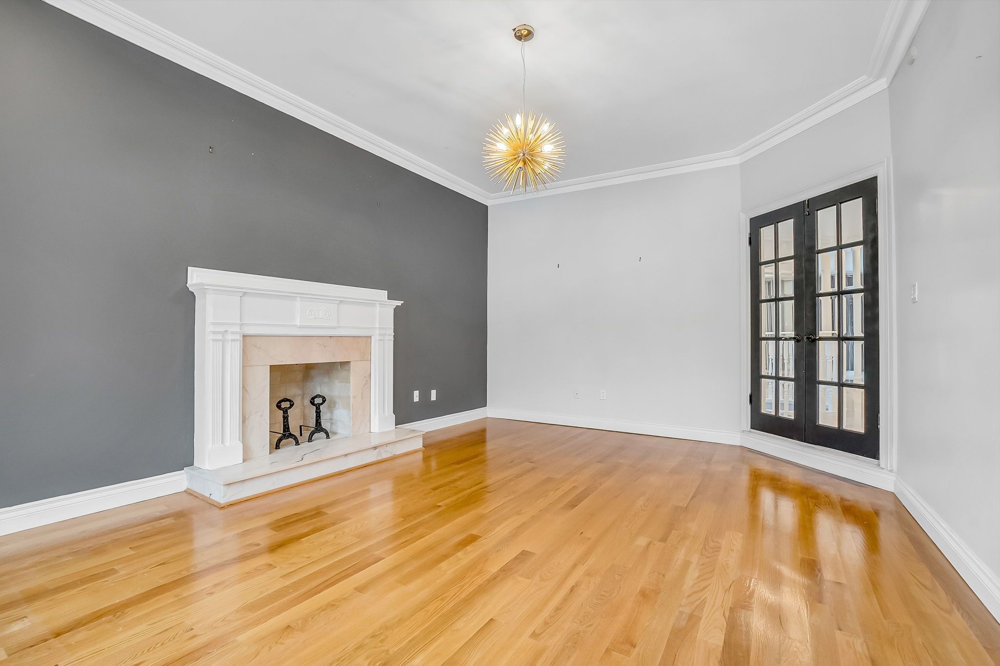 • Family room features hardwood floors, fireplace, and elegant crown moulding.