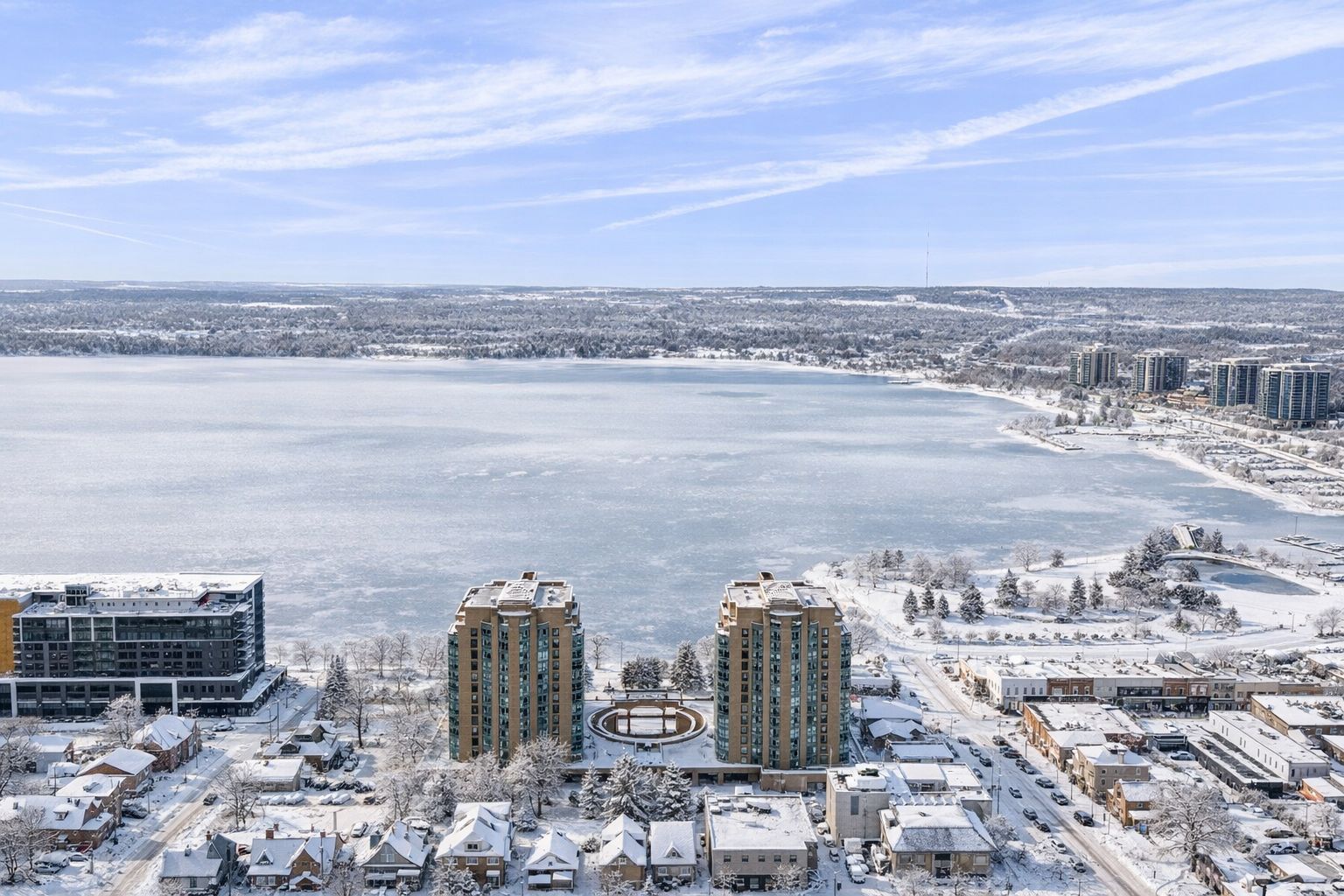 Utilities included in condo fees! This beautifully updated 1-bed + den, 1-bath condo offers south-west exposure with fantastic views of kempenfelt bay, the marina, and downtown barrie. Large windows flood the space with natural light, showcasing stunning sunsets and the city lights at night. The 775-square-foot unit features hardwood floors throughout the living room and den, with vinyl flooring in the spacious bedroom. A newly renovated bathroom elevates the space with a modern tub, toilet, vanity, and gorgeous tile work that seamlessly flows into the foyer. The den is perfect for a home office or hobby space, and the unit also offers convenient in-suite laundry. Included with the unit are one underground parking space and a storage locker. Building amenities feature an indoor pool, sauna, hot tub, gym, and a party/games room with monthly events. Condo fees cover heat/central air, hydro, water, building insurance, parking, and common elements, with on-site management, a superintendent, dual elevators, and visitor parking. Located just steps from waterfront trails, shopping, restaurants, and transit, this is downtown barrie living at its best.