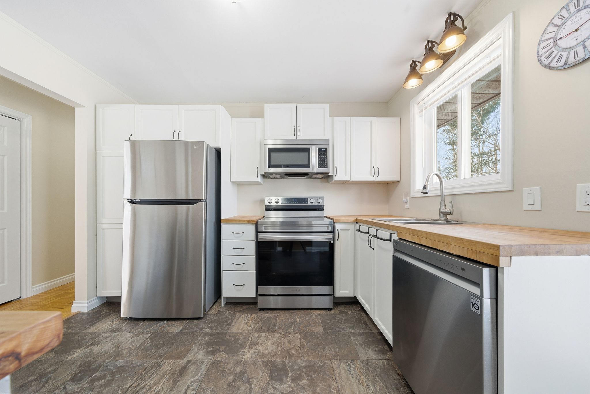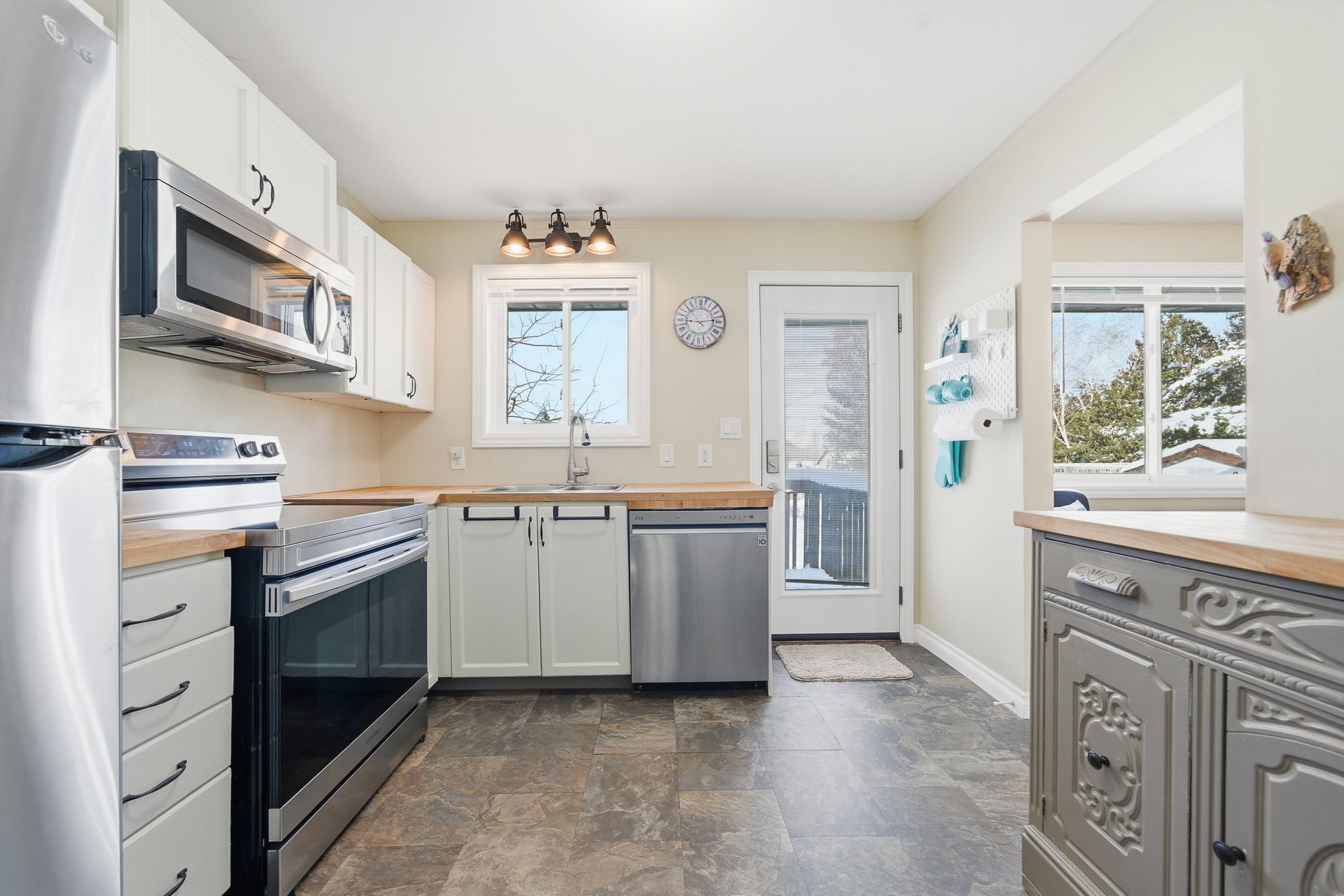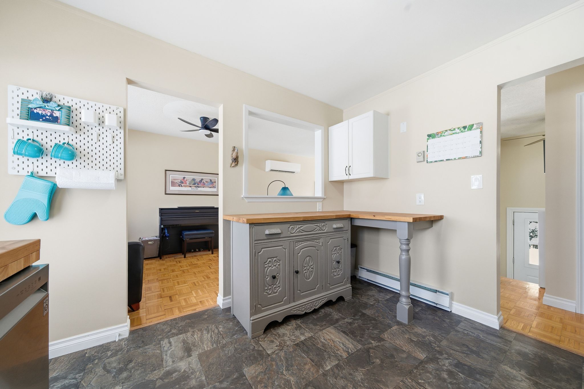• Bright kitchen with butcher block counters and functional pass-through.