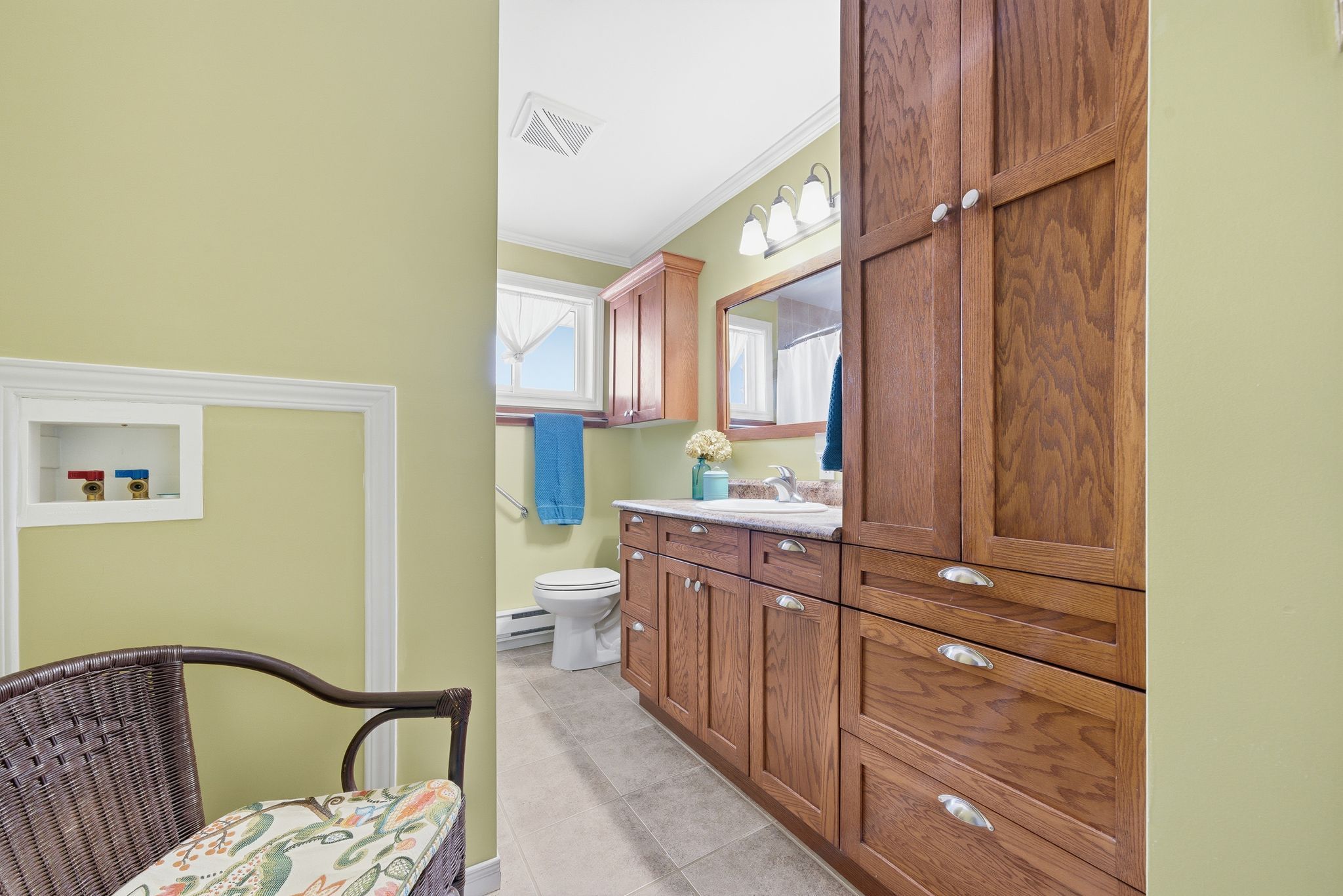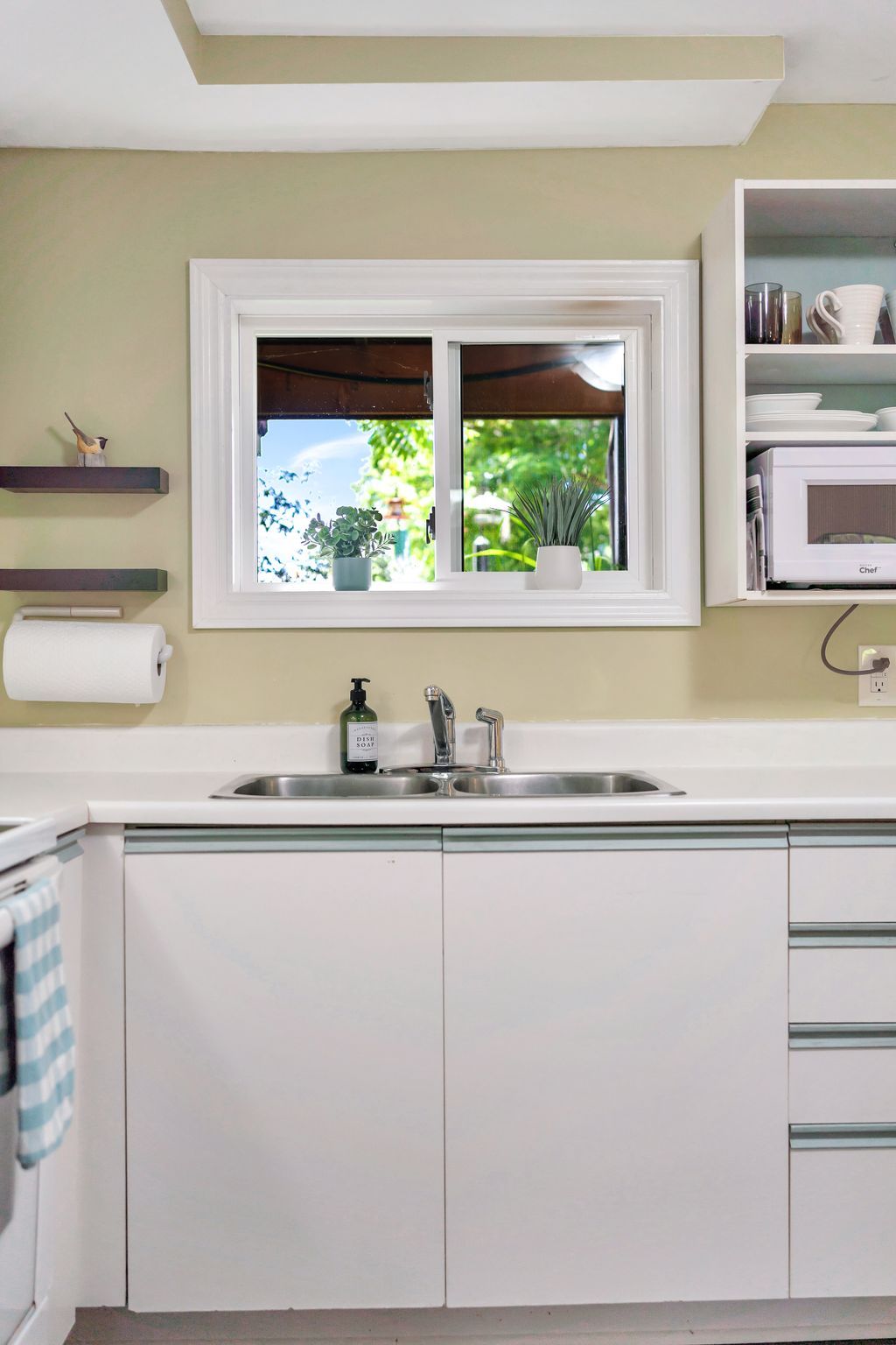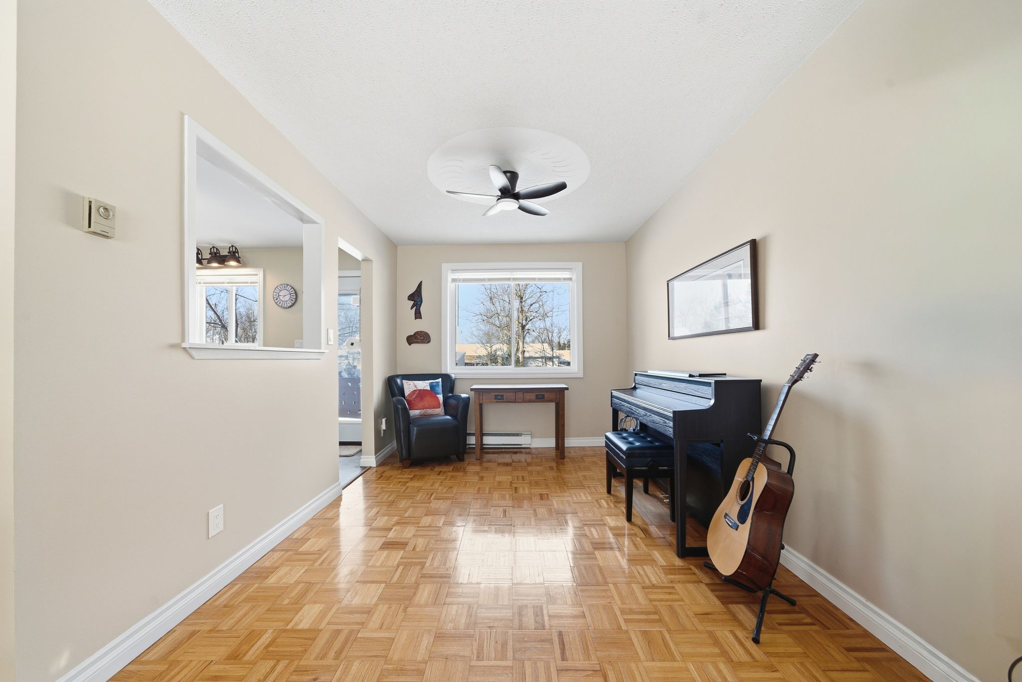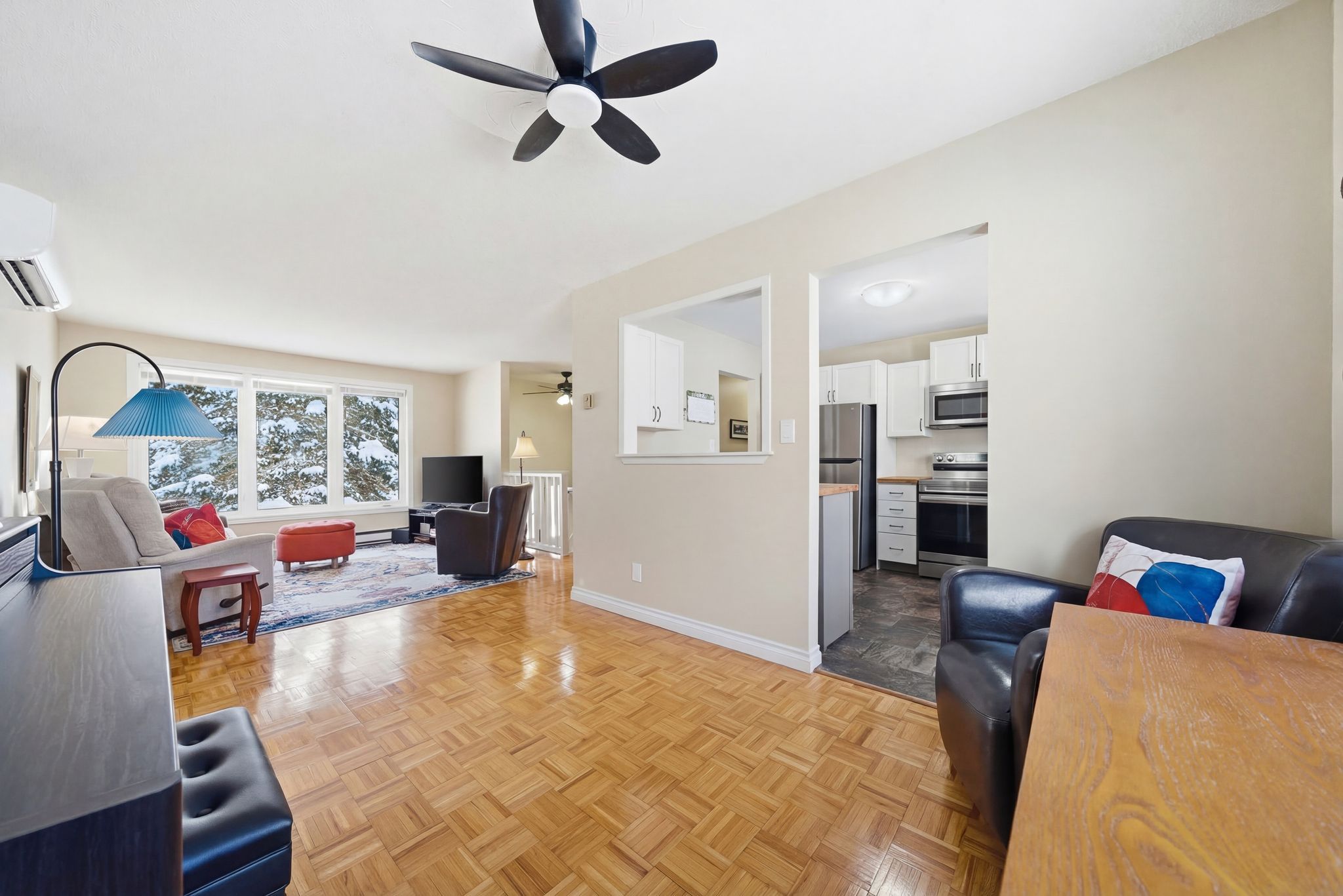 • Bright kitchen with butcher block counters and functional pass-through.