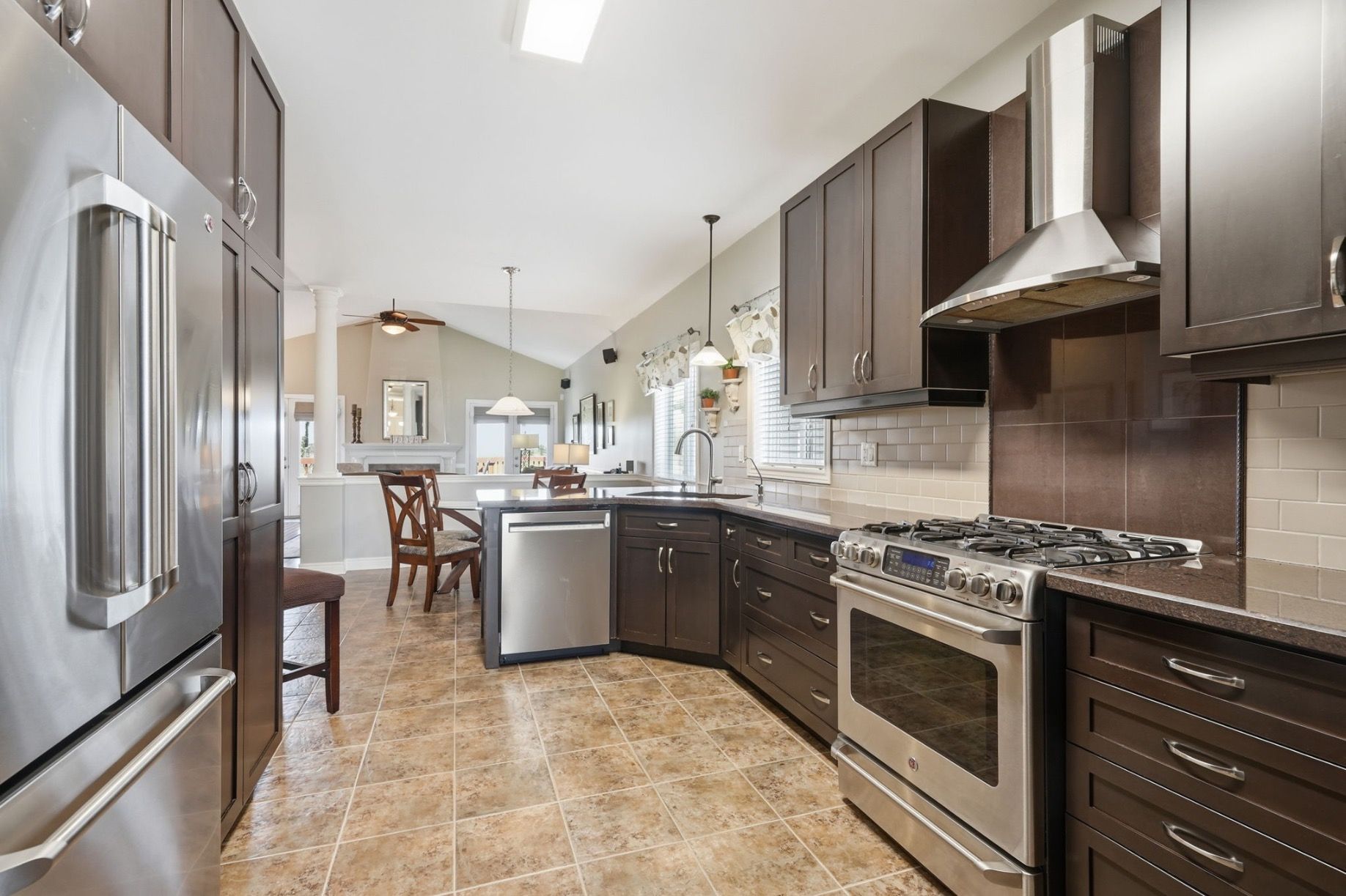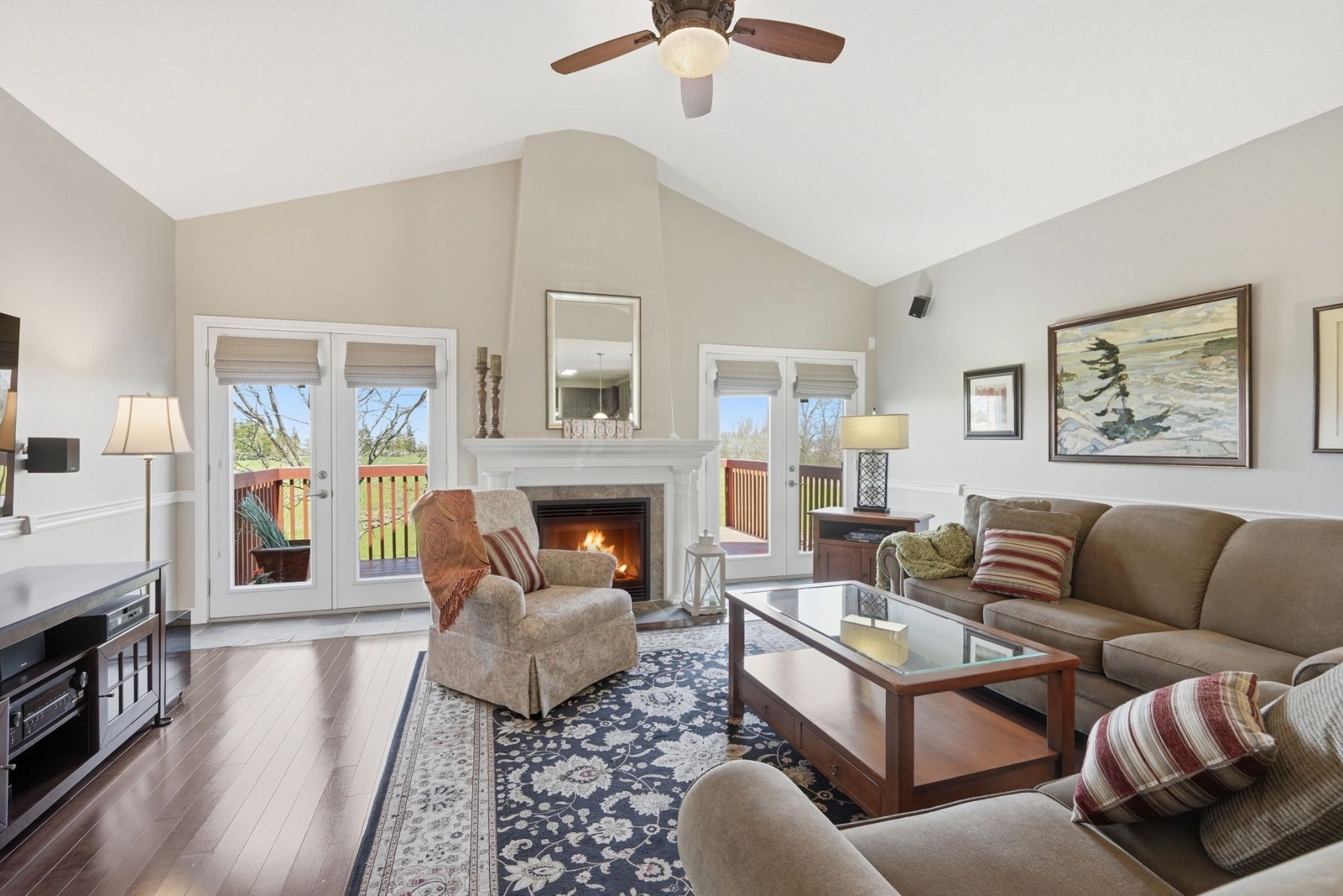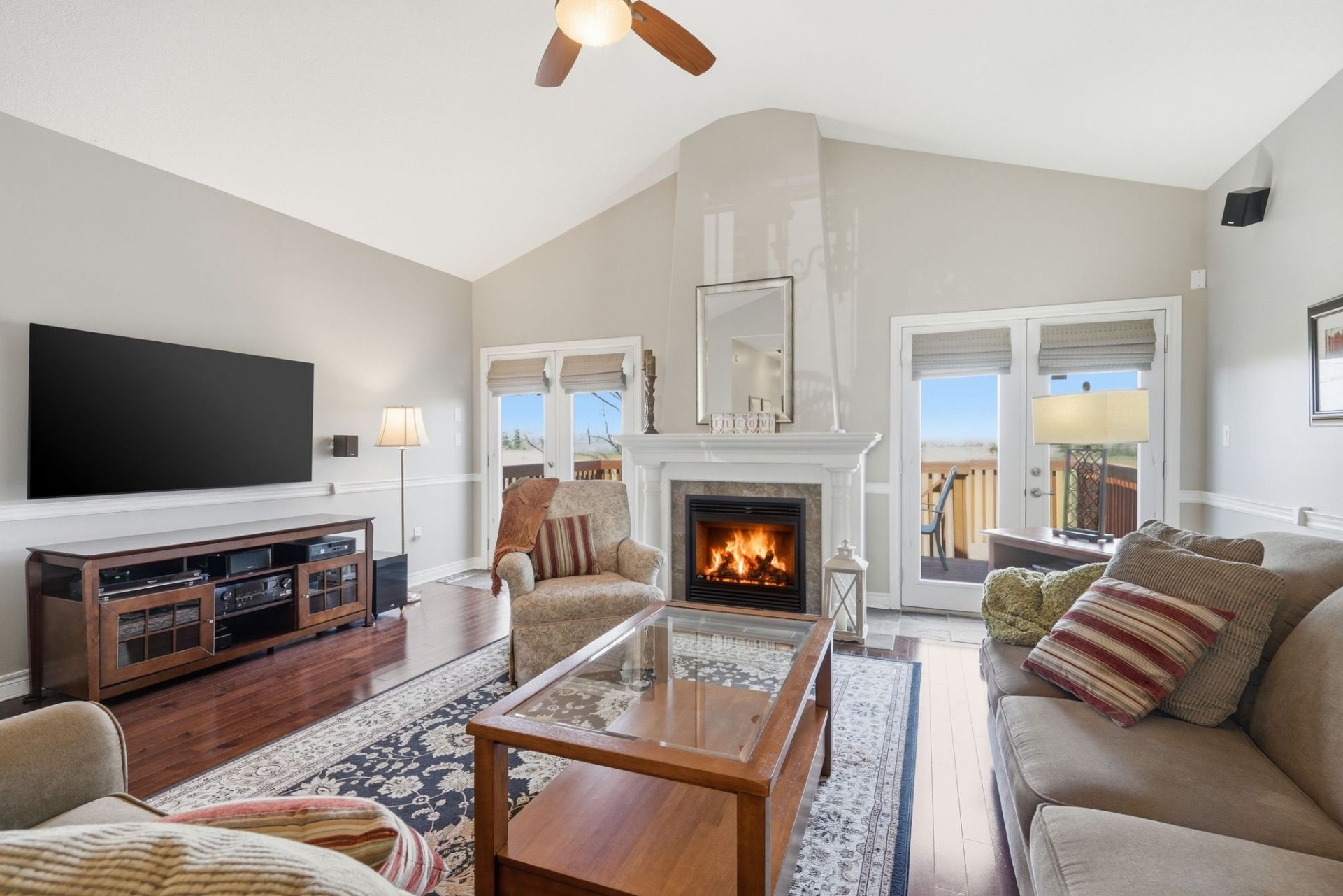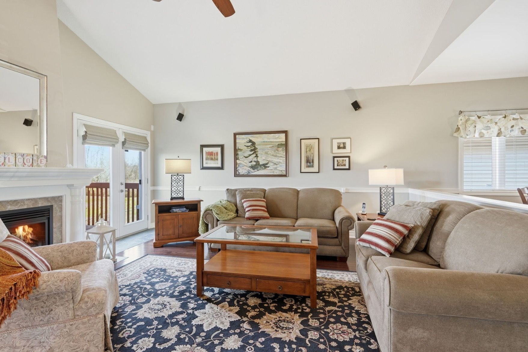 • Bright open concept main level with cathedral ceiling and gas fireplace.