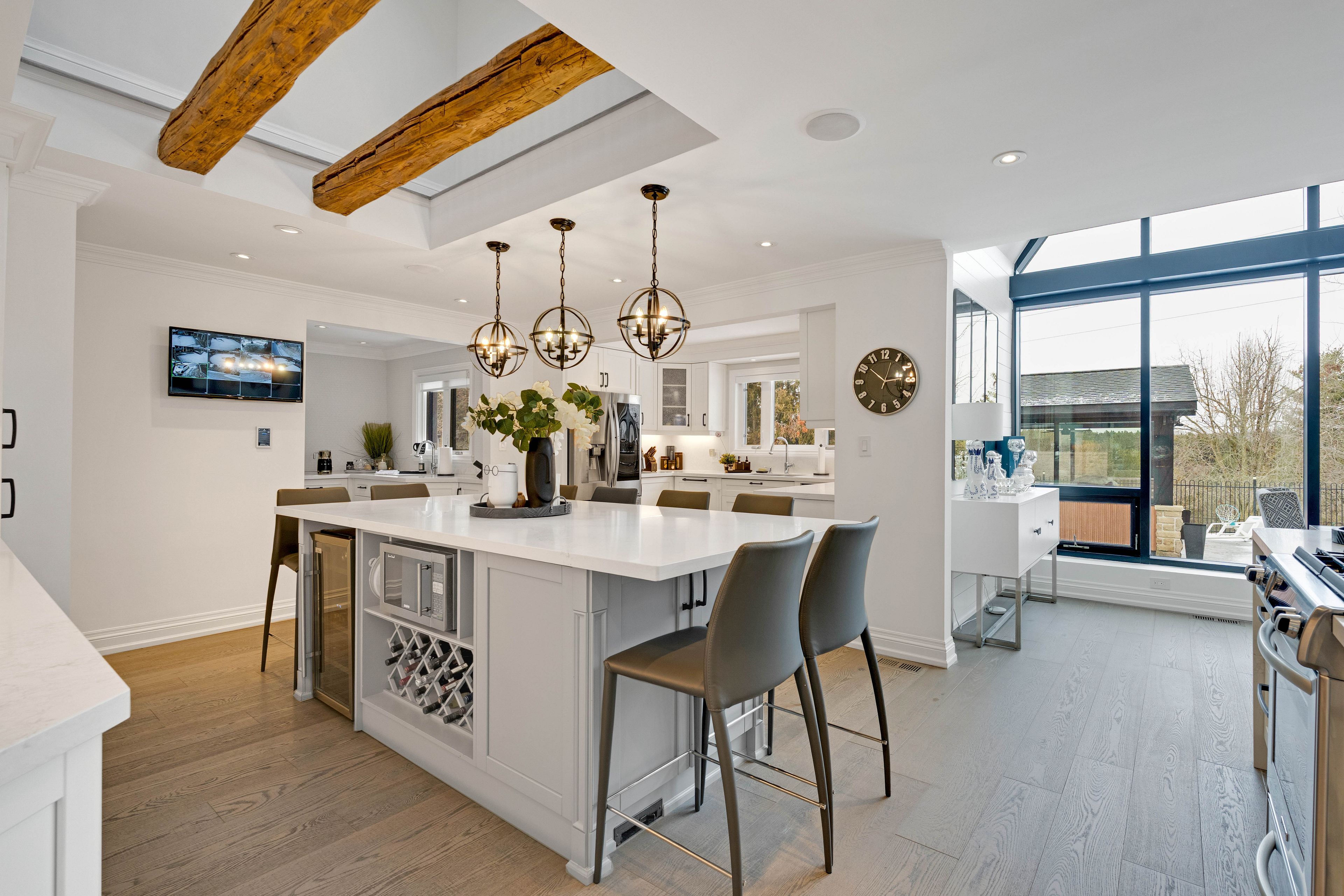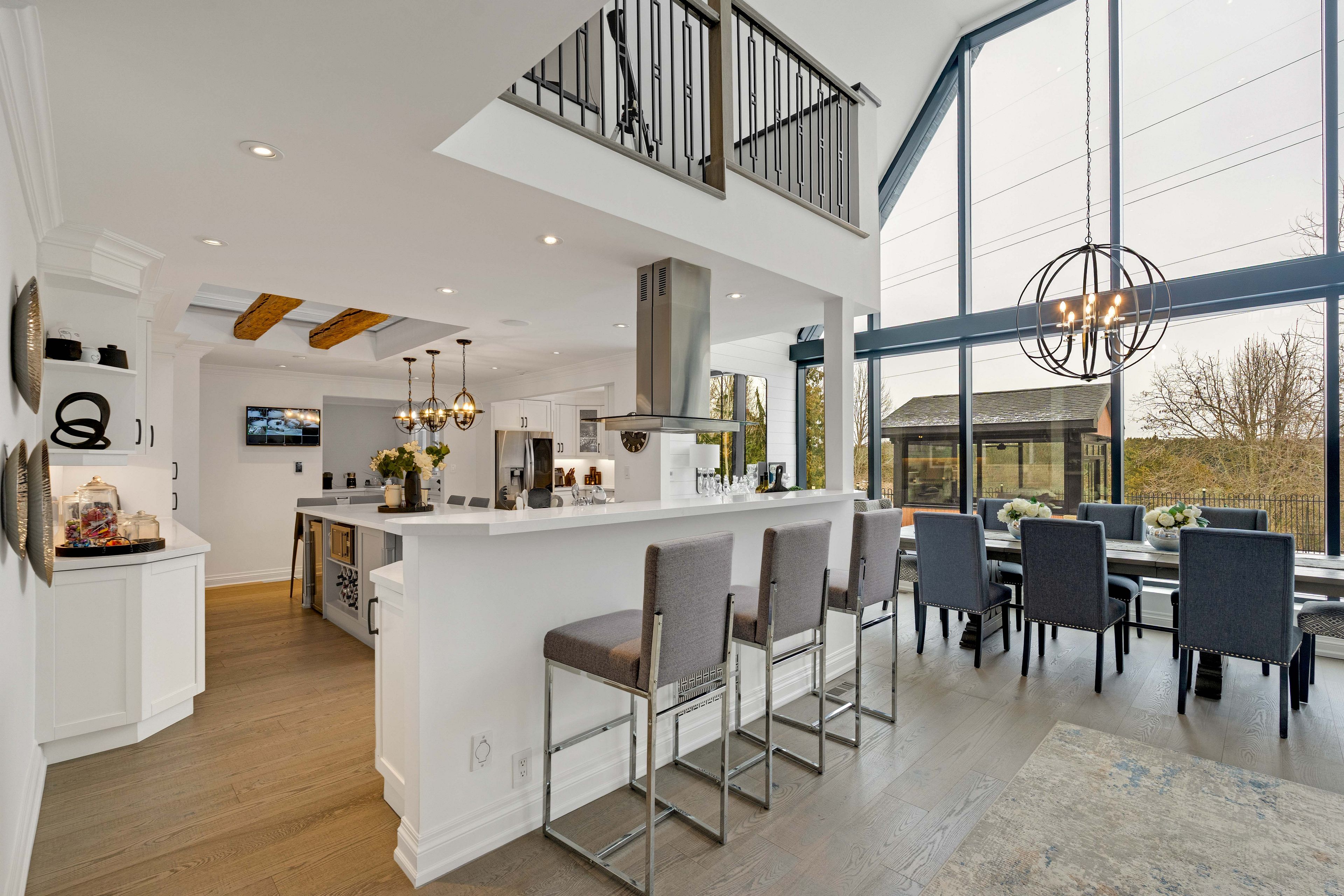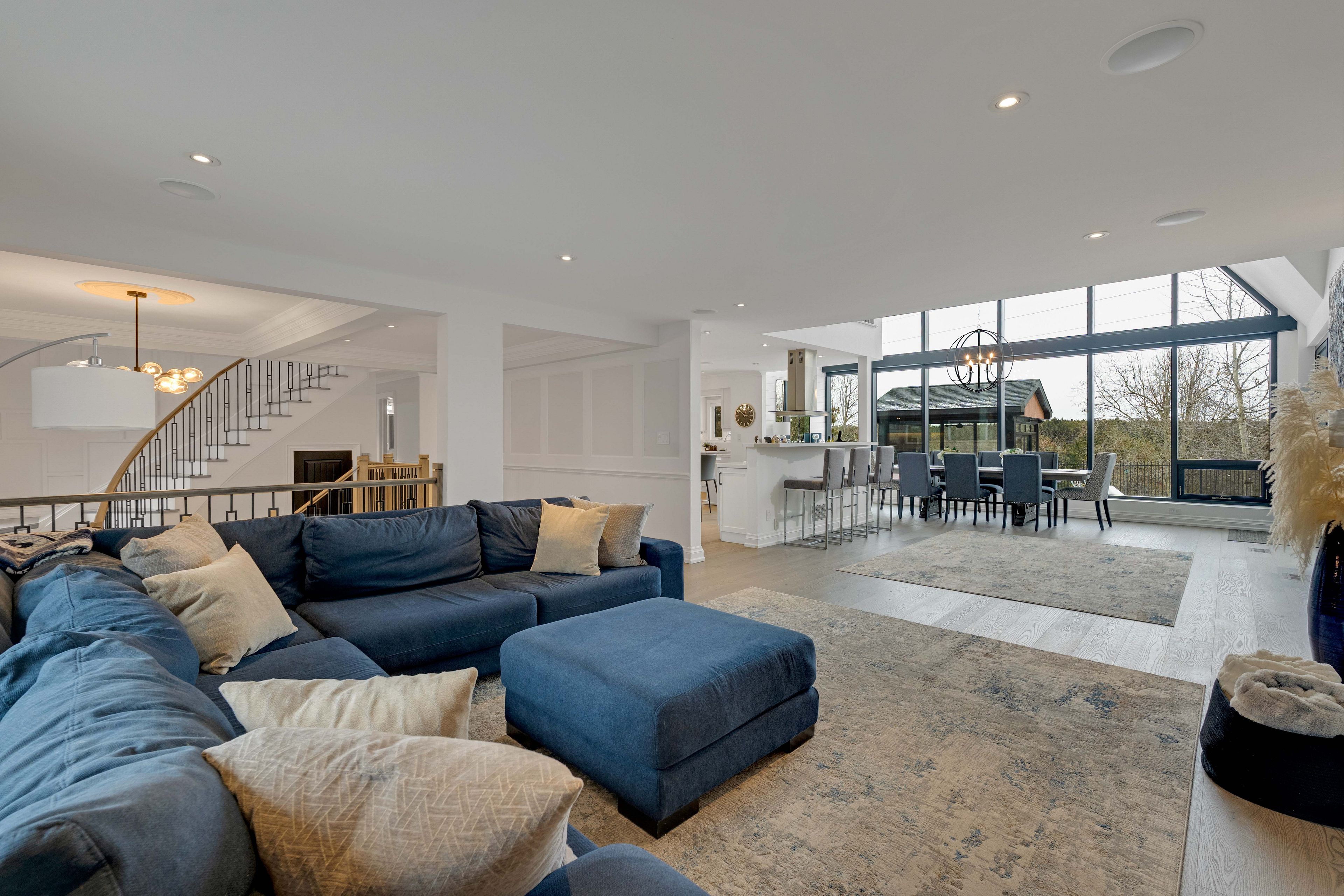 A distinguished kleinburg estate. Welcome to 140 ravendale court, an exceptional luxury residence offering over 5,000 square feet of above grade living space, complemented by a fully finished lower level featuring two expansive rooms and a temperature controlled walk in wine cellar, providing approximately 7,000 square feet of total refined living area. Set on a prestigious ravine lot measuring almost 2 acres and backing onto protected conservation lands, this private estate offers a rare combination of tranquility, exclusivity, and natural surroundings. Thoughtfully designed to accommodate both grand-scale entertaining and multi-generational living, the home features five generously proportioned bedrooms and six spa-inspired bathrooms, including a main floor bedroom and two primary suites on the second level, an exceptionally rare and desirable layout. The open concept main floor is highlighted by a chef-inspired kitchen and dining area, enhanced by soaring vaulted ceilings, expansive windows, and a seamless flow ideal for elegant entertaining. The outdoor living experience is equally impressive, featuring a resort style backyard with an in-ground pool, private cabanas, outdoor bar, enclosed hot tub spa, and a self contained guest room with an additional bathroom, creating an exceptional setting for both hosting and relaxation. Complete with two oversized garages, ideal for automotive or recreational enthusiasts, this remarkable property represents a rare opportunity to acquire one of kleinburg's most distinguished estate residences, where privacy, luxury, and lifestyle converge.