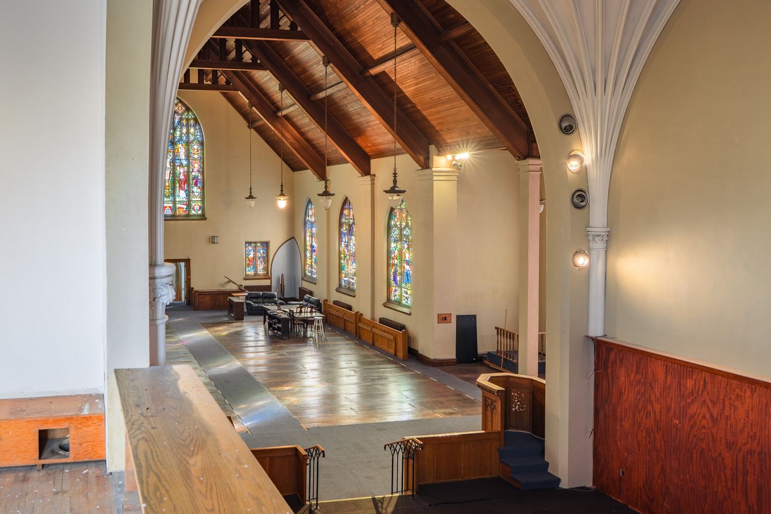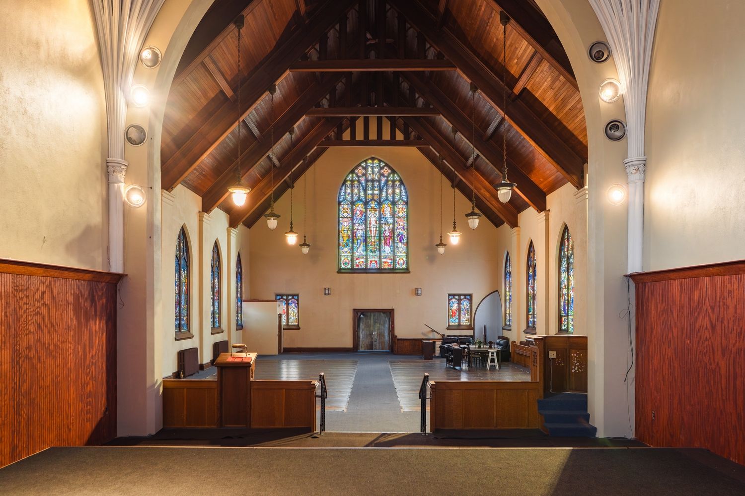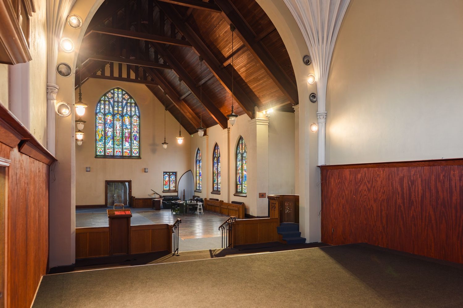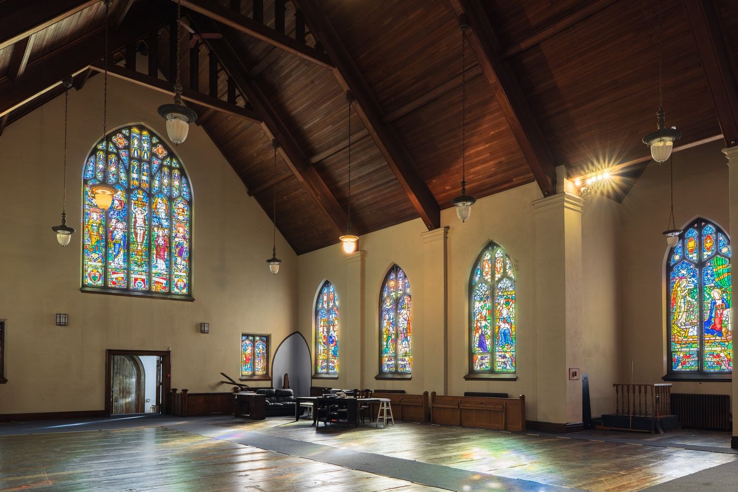 • Beautiful stained-glass windows create a vibrant atmosphere throughout.