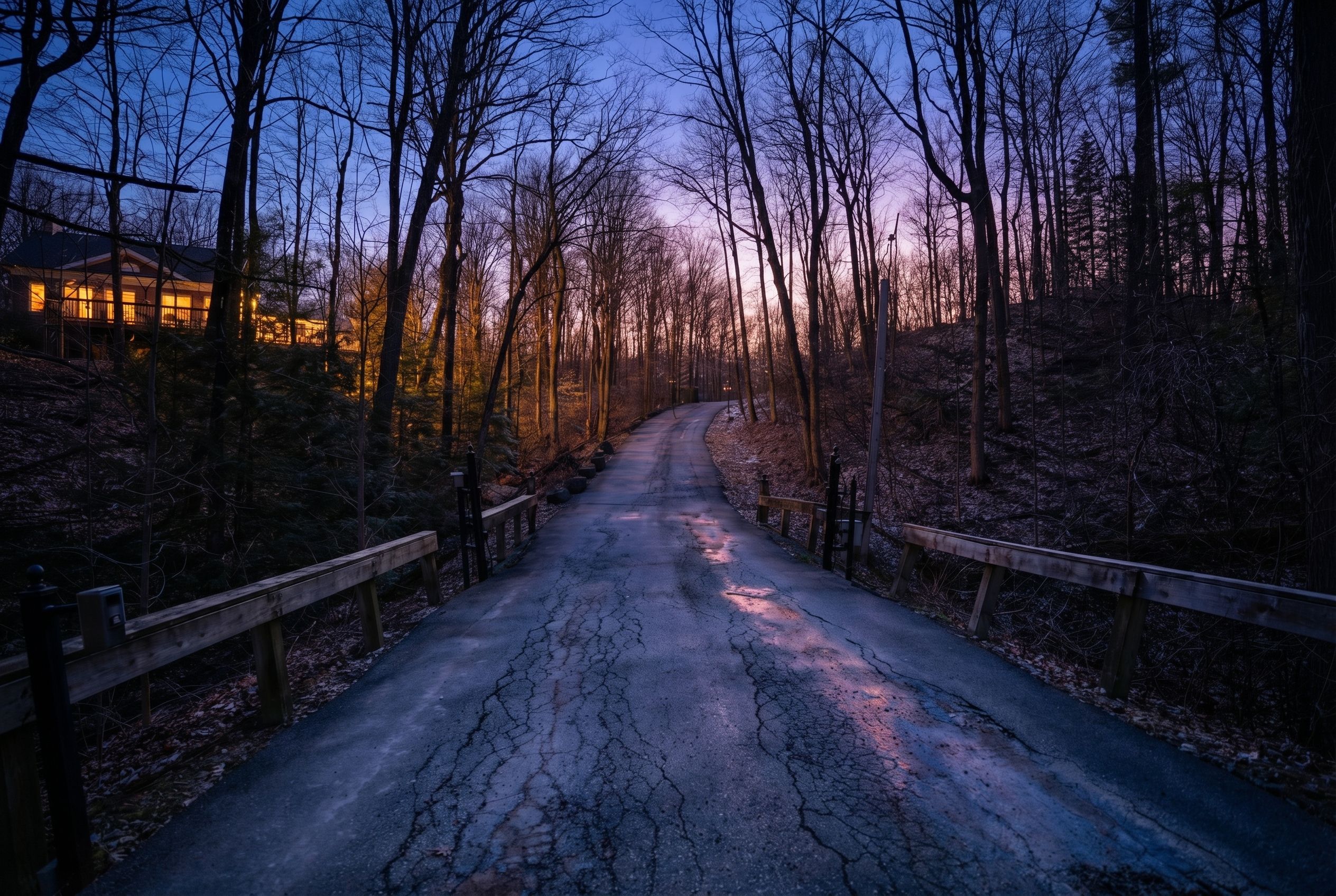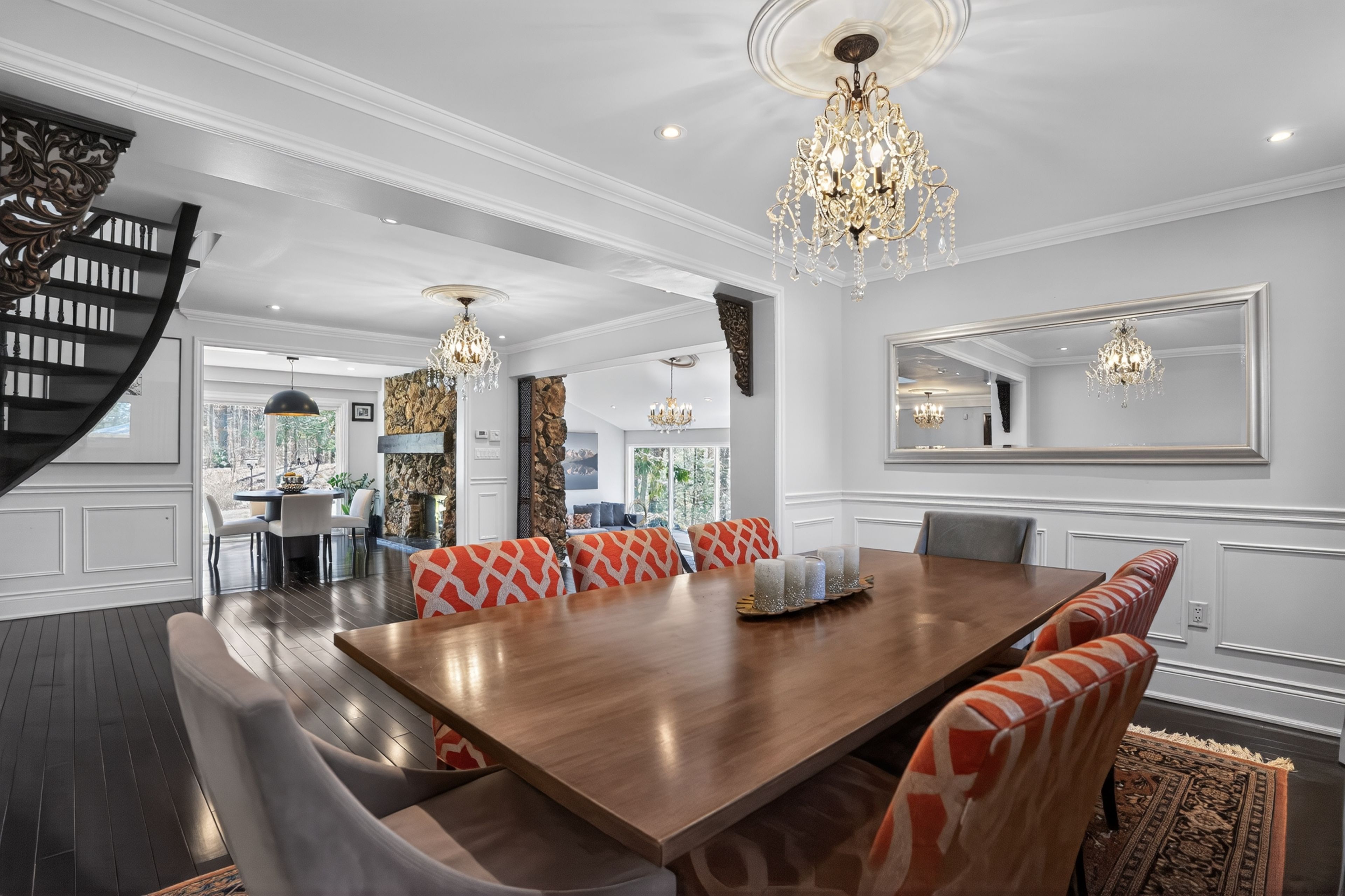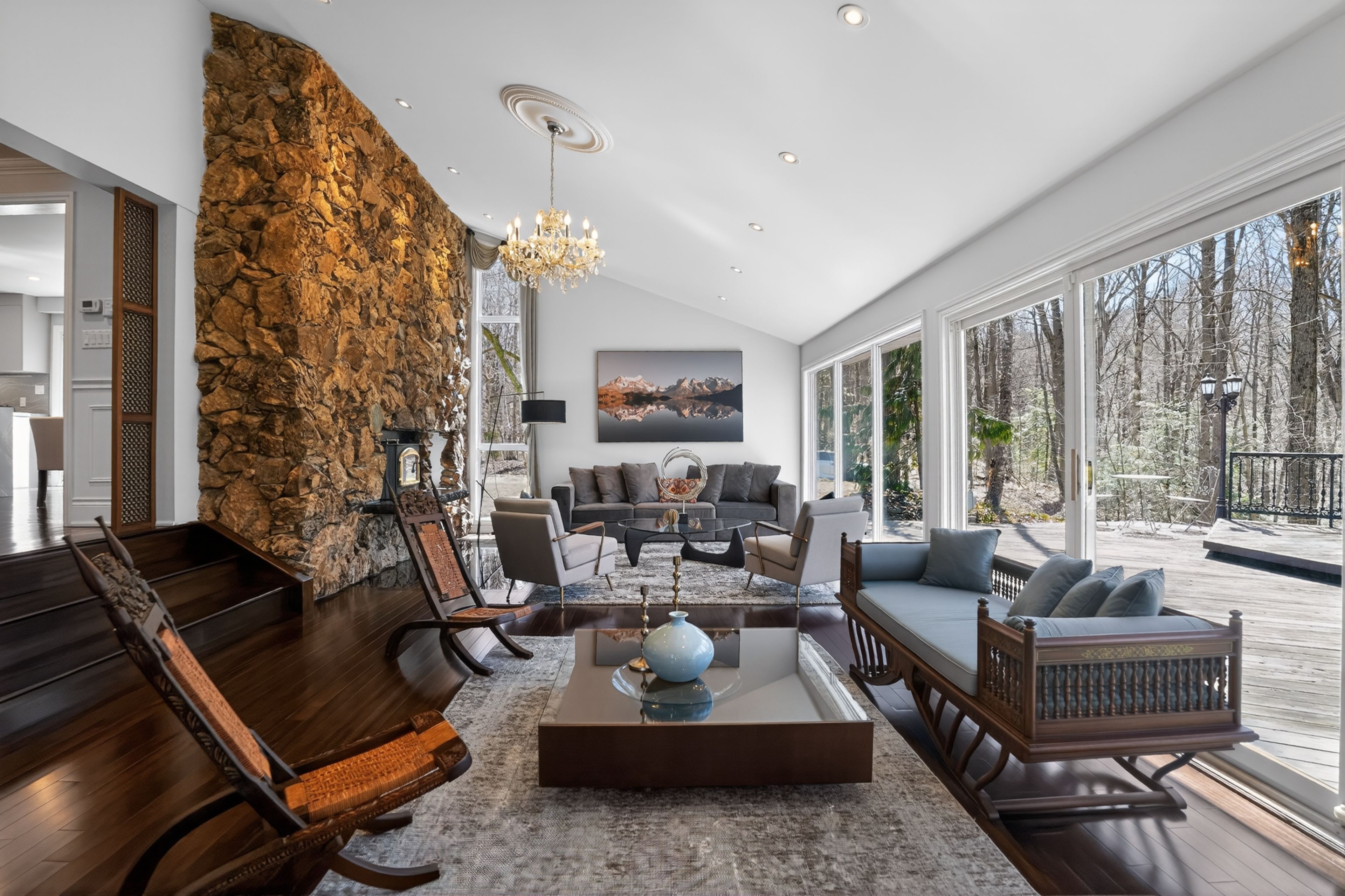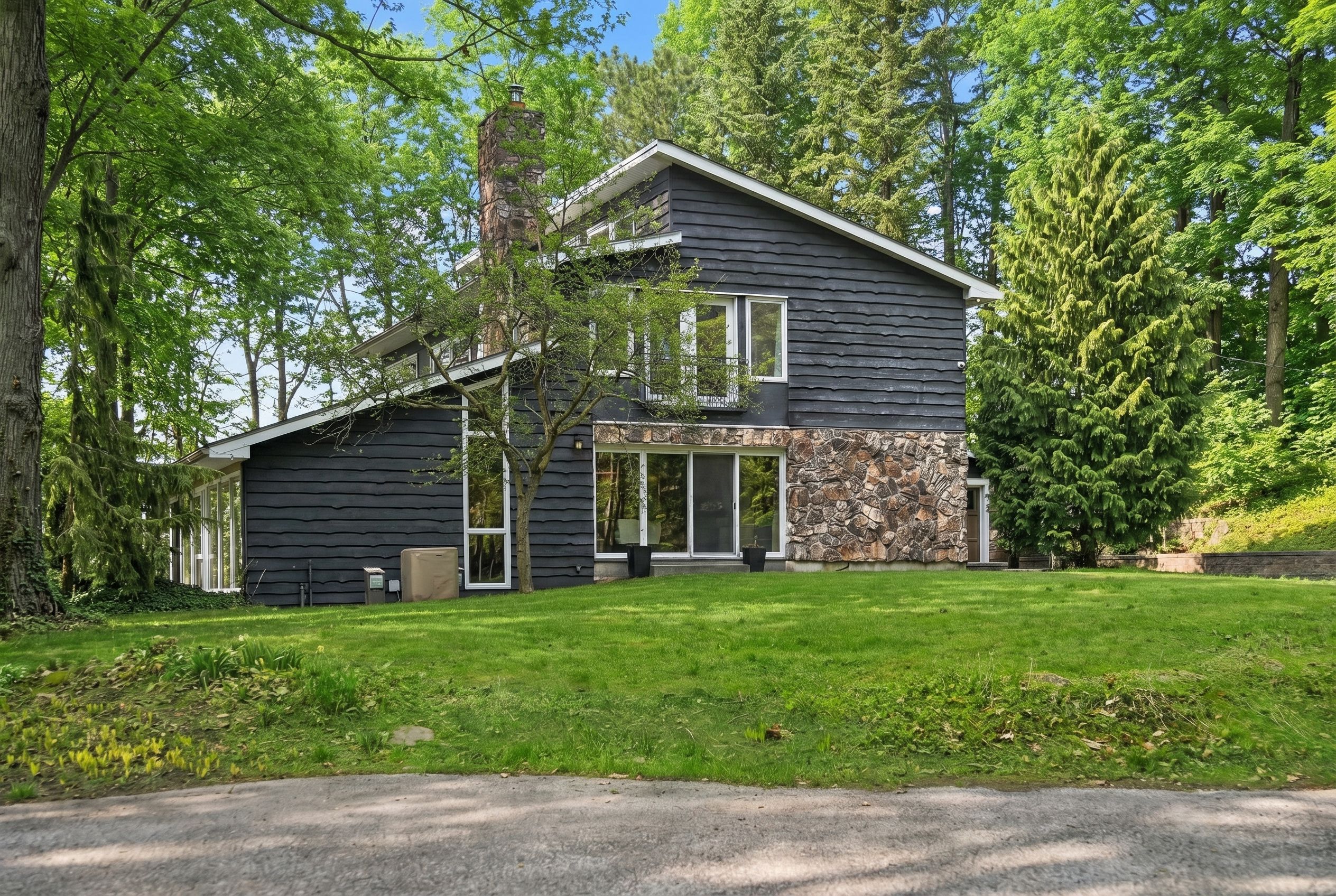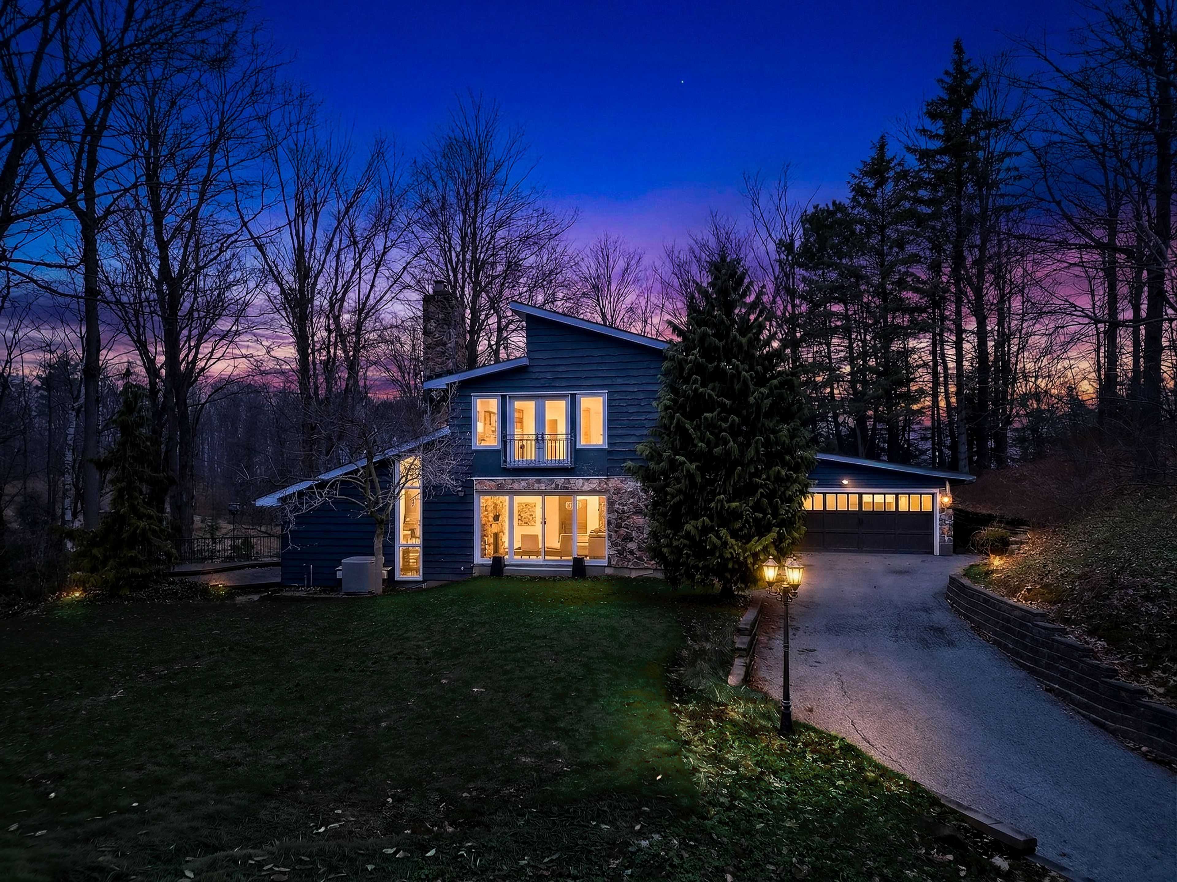 Tucked away within 4. 12 acres of serene, forested landscape, this extraordinary custom residence offers an unparalleled blend of seclusion, sophistication, and contemporary living-just moments from the city. Thoughtfully reimagined, the home seamlessly preserves its original charm while embracing modern elegance. A stunning heritage stone fireplace and dramatic volcanic stone feature wall anchor the living space, where expansive windows invite in breathtaking ravine and woodland views-creating a living canvas that changes with the seasons. At the heart of the home, a fully integrated german-inspired kitchen defined by clean architectural lines, featuring a sculptural waterfall island in premium cambria quartz with marble-inspired veining and architectural concrete-style cabinetry. A seamless cooking wall with integrated miele cooking surface and teppanyaki grill is complemented by a curated miele appliance suite, including built-in oven, microwave, steam oven, coffee system, warming drawer, and integrated dishwasher. A dedicated home office overlooks the tranquil backyard, offering an inspiring setting immersed in nature. Upstairs, the primary suite is a private sanctuary, complete with a sleek electric fireplace, a relaxing sitting area, and a spa-inspired ensuite featuring heated floors for year-round comfort. Additional bedrooms are beautifully appointed with custom built-ins, generous closet space, and sweeping panoramic views. The finished lower level provides versatile space for recreation, wellness, or entertainment. Recent upgrades include a 200-amp electrical panel, updated mechanical systems, and a comprehensive security system for peace of mind. An automated gated entrance and winding private drive guide you through peaceful woodlands to this remarkable residence-where luxury and nature exist in perfect harmony. An exceptional opportunity also awaits to design and build your own infinity pool, further elevating this already breathtaking retreat.