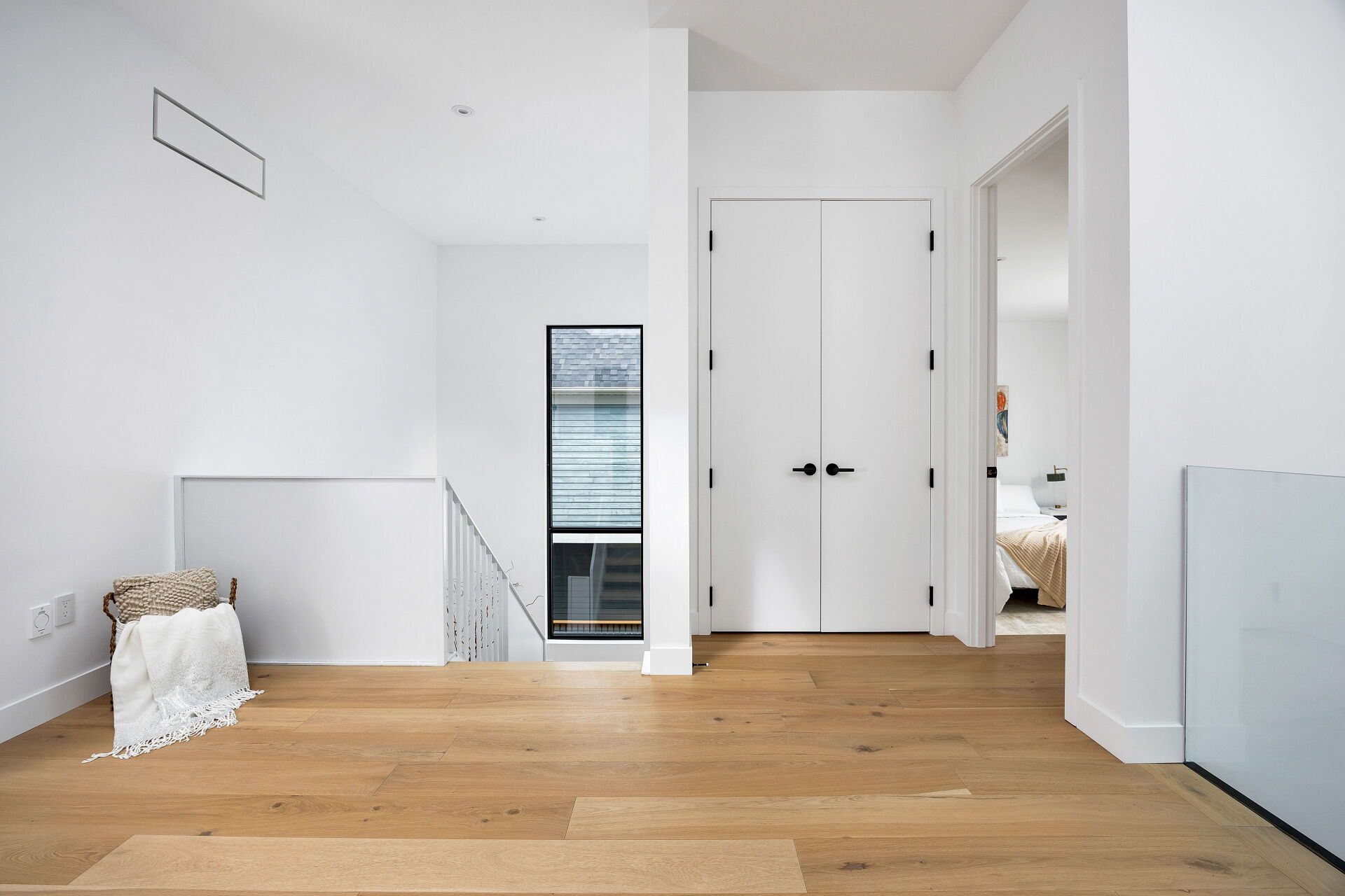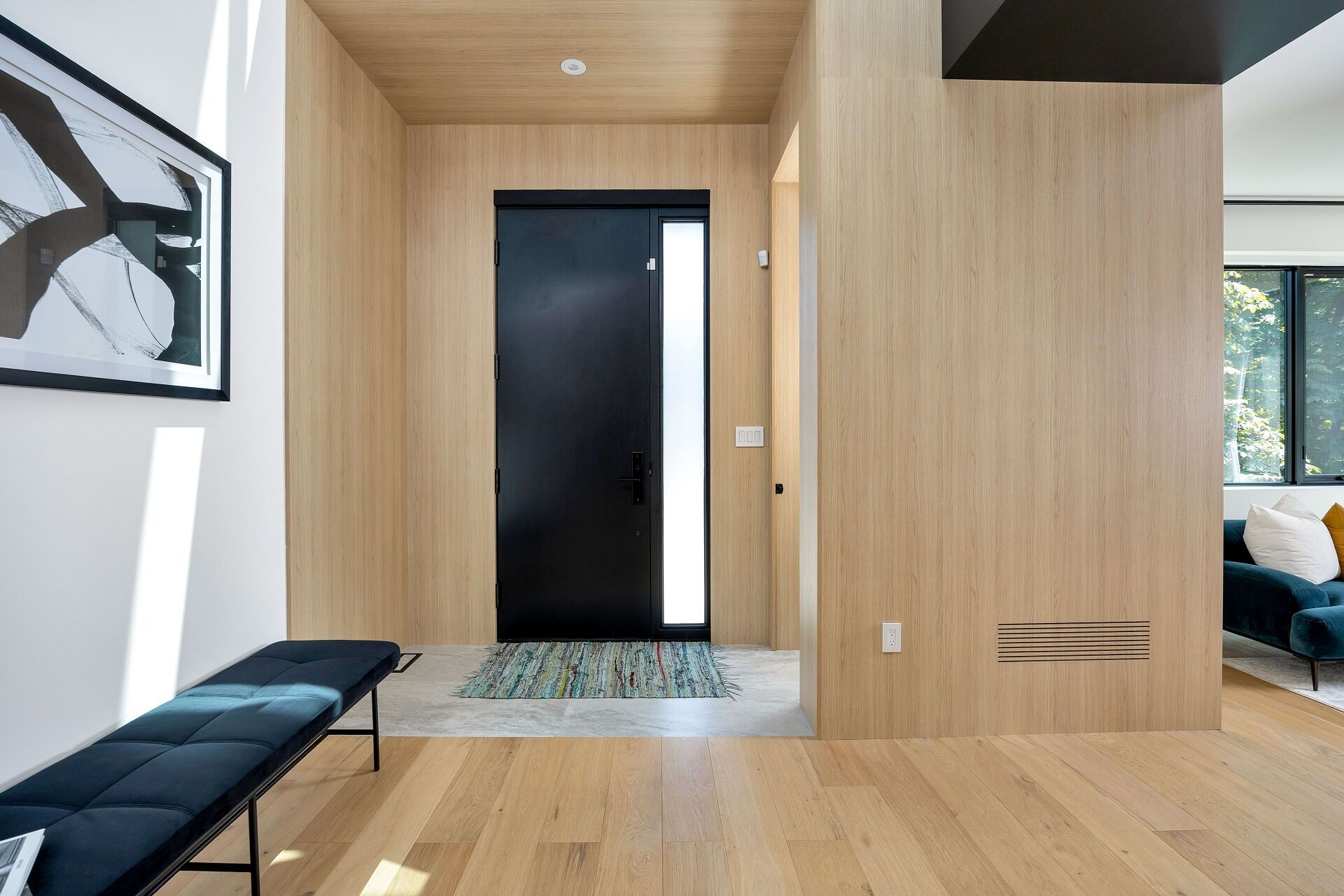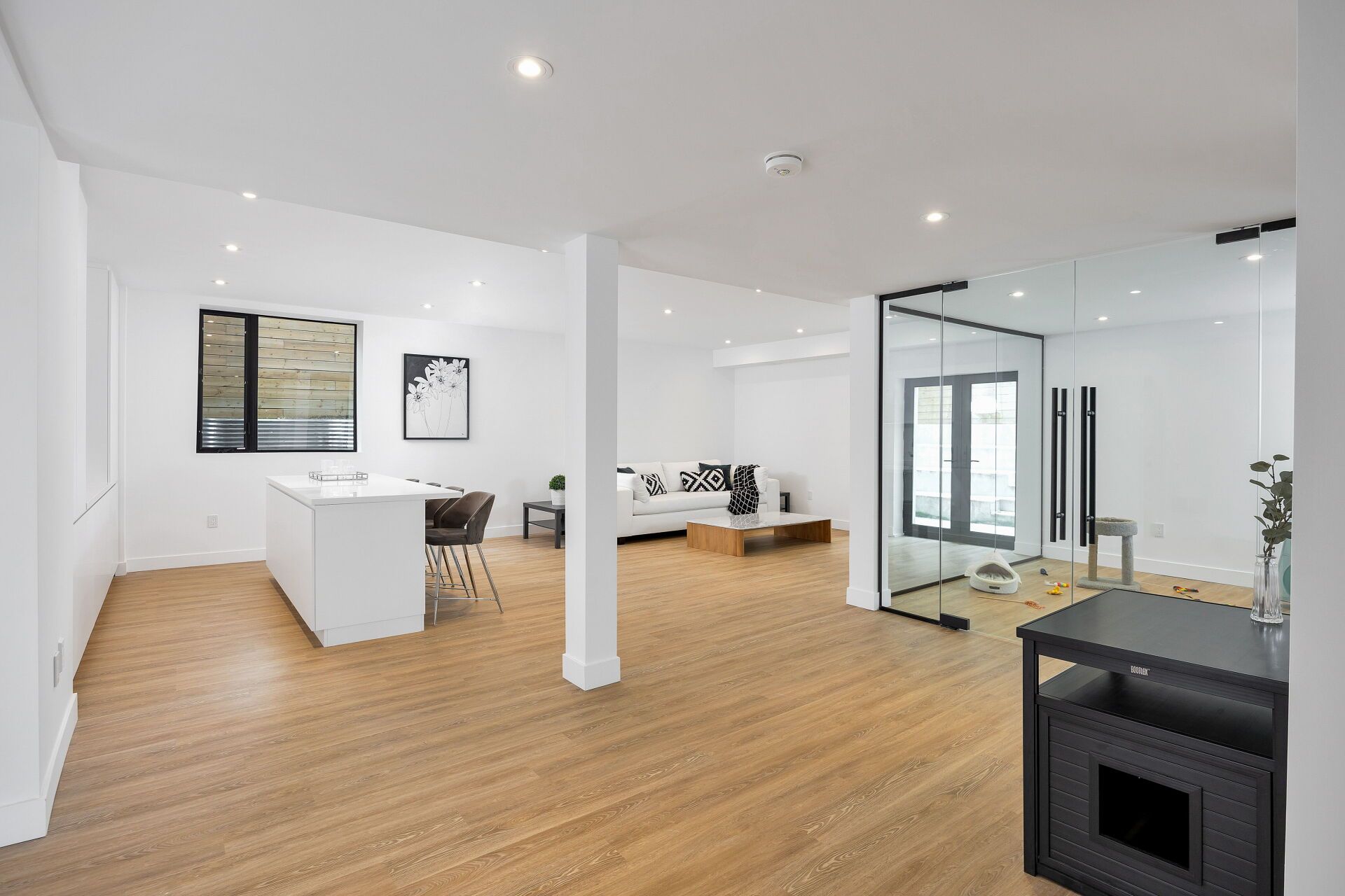 • Open concept main level with natural light and custom wood paneling.
