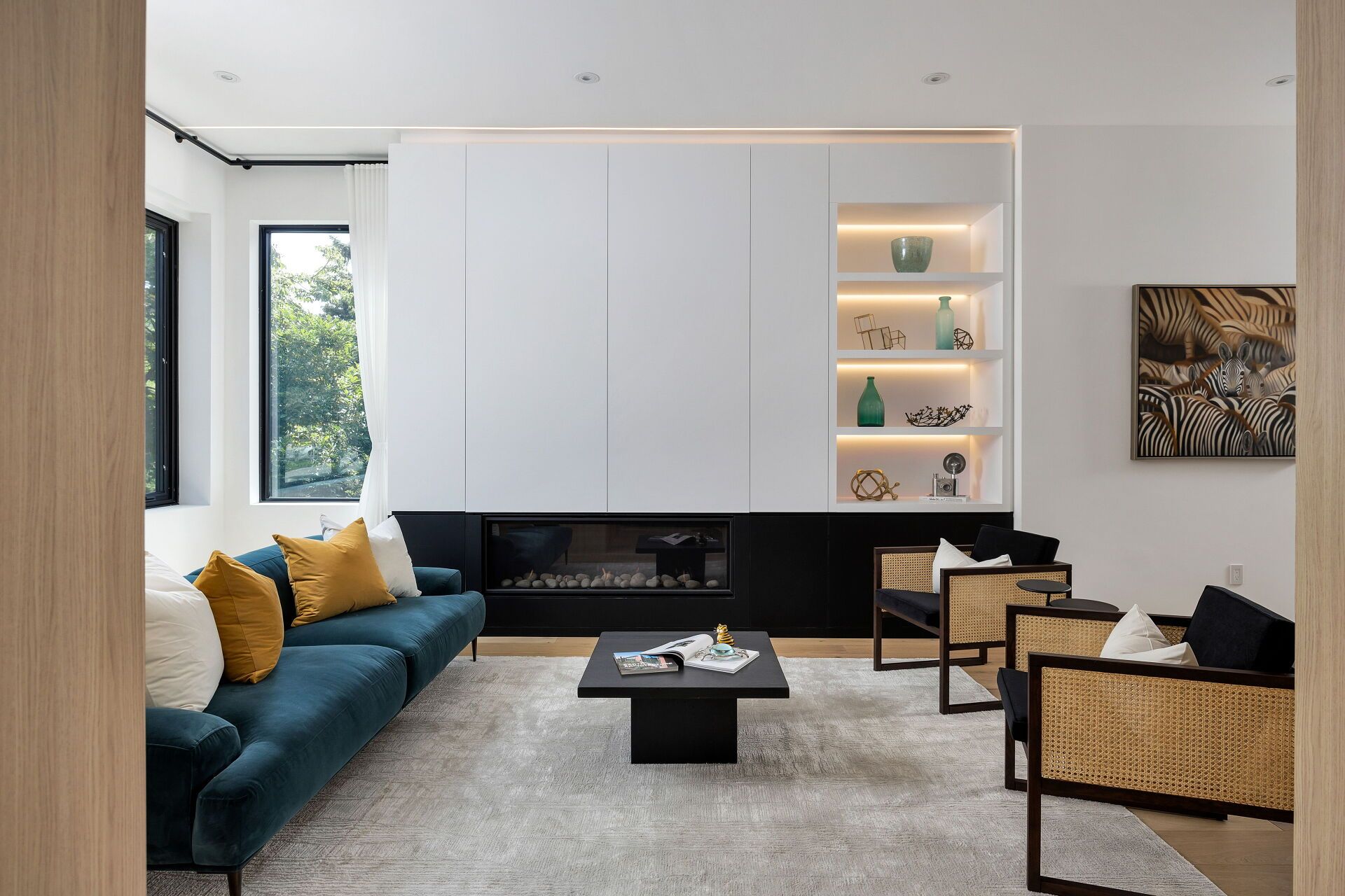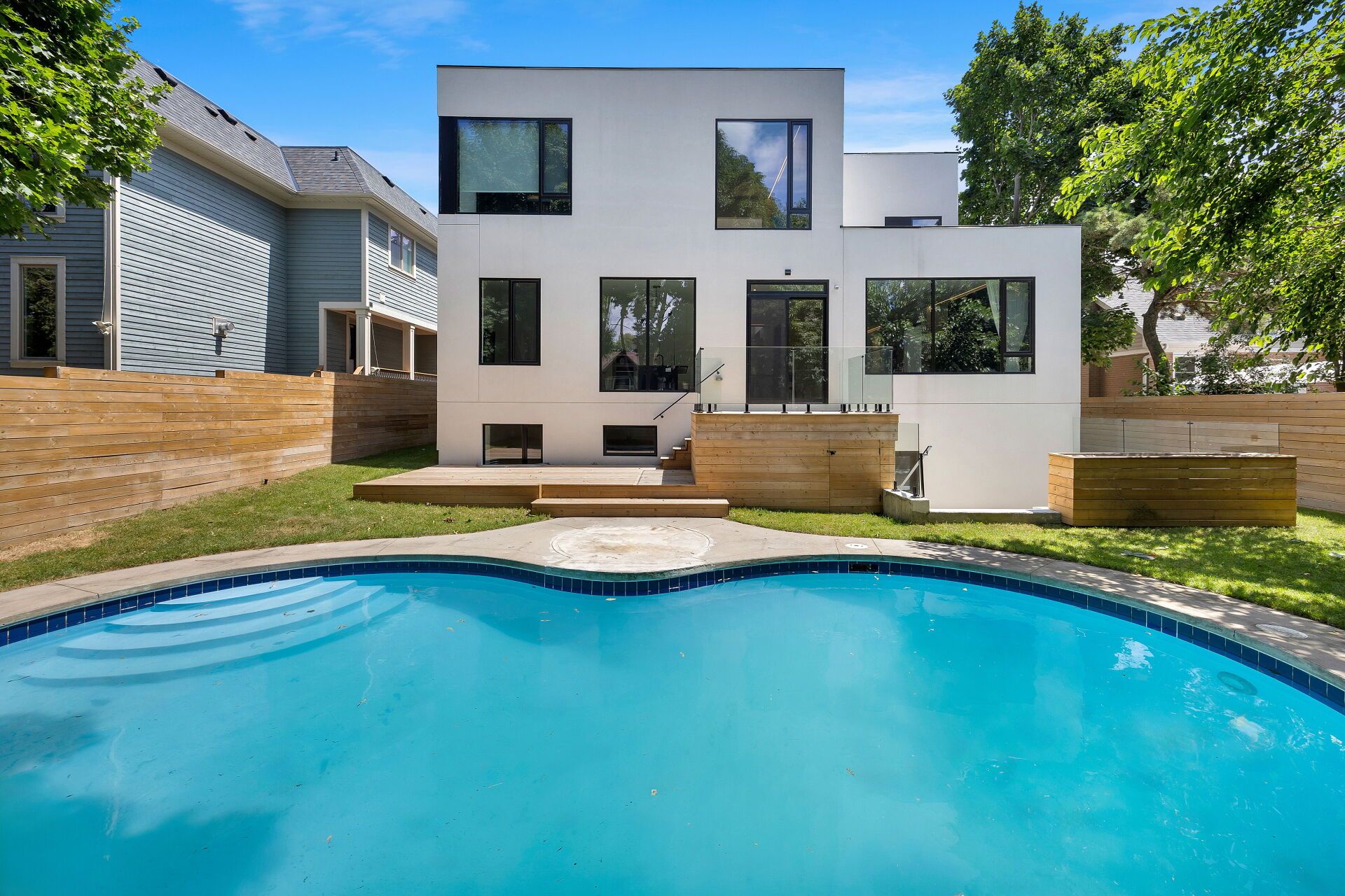 Exquisite modern house with blends of form, light, and emotion. This architectural marvel is designed by atelier sun, published on archello & toronto interiors. Completed in 2023, with over 5,300 sqft of total living space, offering luxury living at its finest. The open concept main level is anchored by custom wood wall paneling that creates inviting atmosphere upon entering. Expansive window openings acting as picture frames, and flooded with natural lights throughout the house. Soaring 10ft ceilings on the main and upper levels, highlighted by floating staircase & custom metal railing that elevate the modern elegance. The chef's kitchen features miele appliances, caesar stone countertops and sleek cabinetry. Flows seamlessly into the family room with a stunning granite slab surrounds the gas fireplace. Custom designed lighting is for both relaxation and entertainment. This home boasts four bedrooms on the upper level, each with its own ensuite and heated floors. The finished basement offers recreation room, wet bar, gym, studio, guest bedroom with ensuite. Walkout to your backyard oasis, a saltwater pool, two tiered deck, concrete patio stairs is the perfect spot for outdoor movie nights. Located in one of oakville's most desirable neighbourhood and steps from top-rated schools. Combines with thoughtful design and smart technology, this artwork offers you an unparalleled living experience.