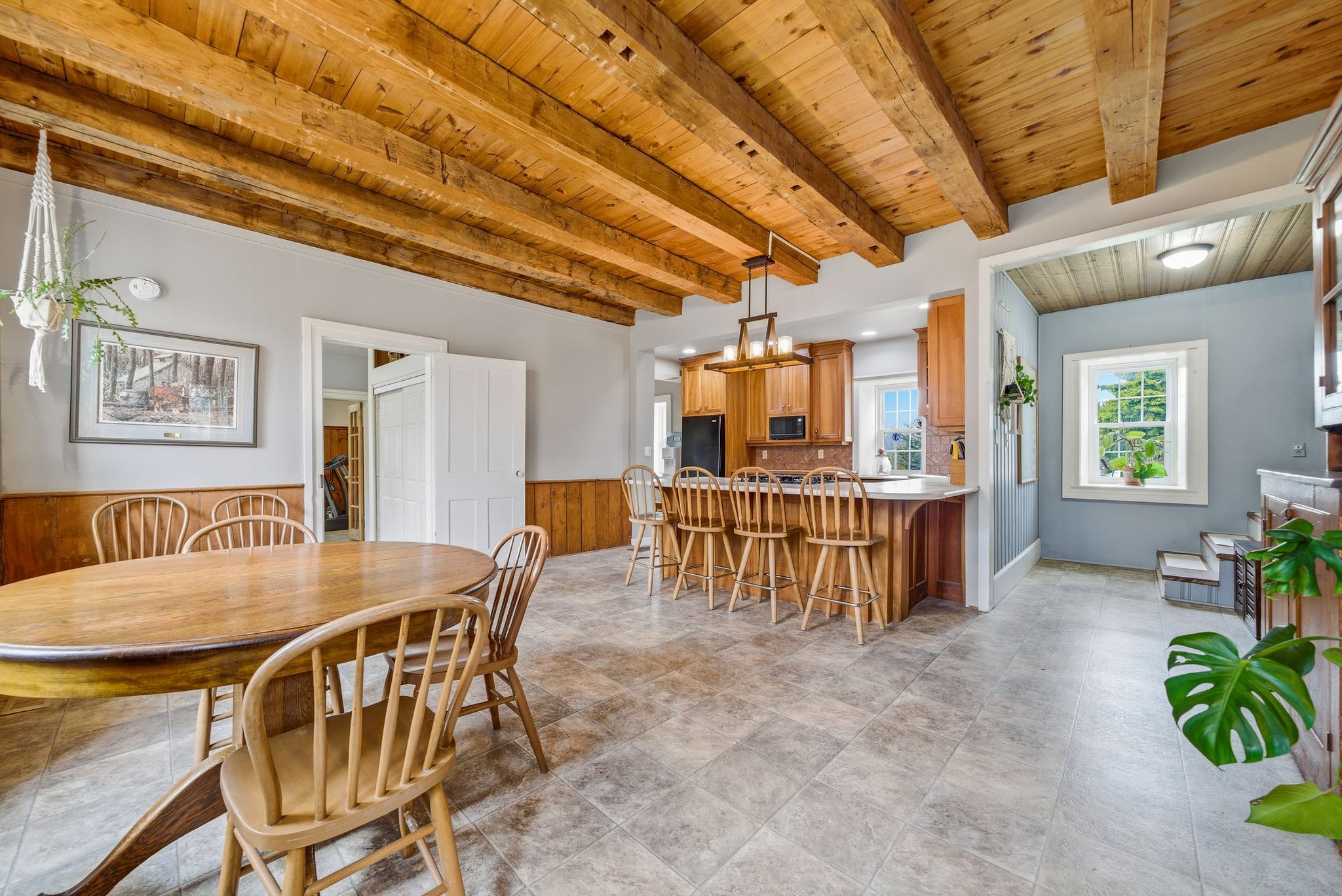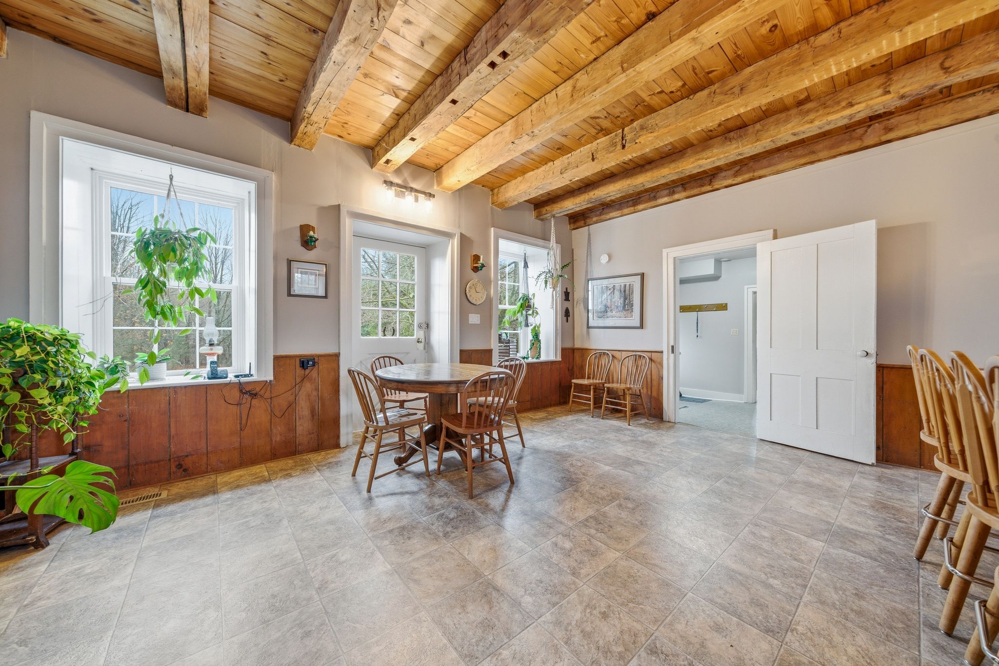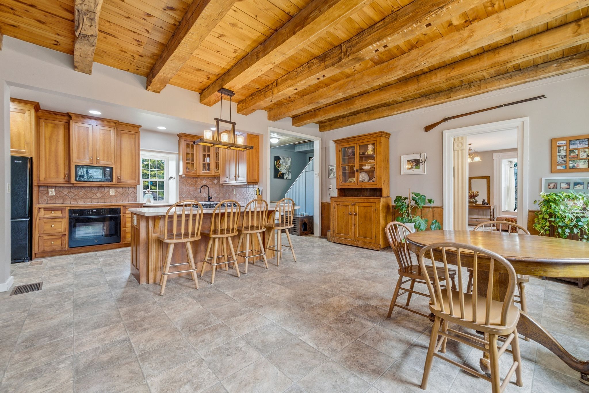 • Authentic features like wide pine floors and exposed beams throughout.