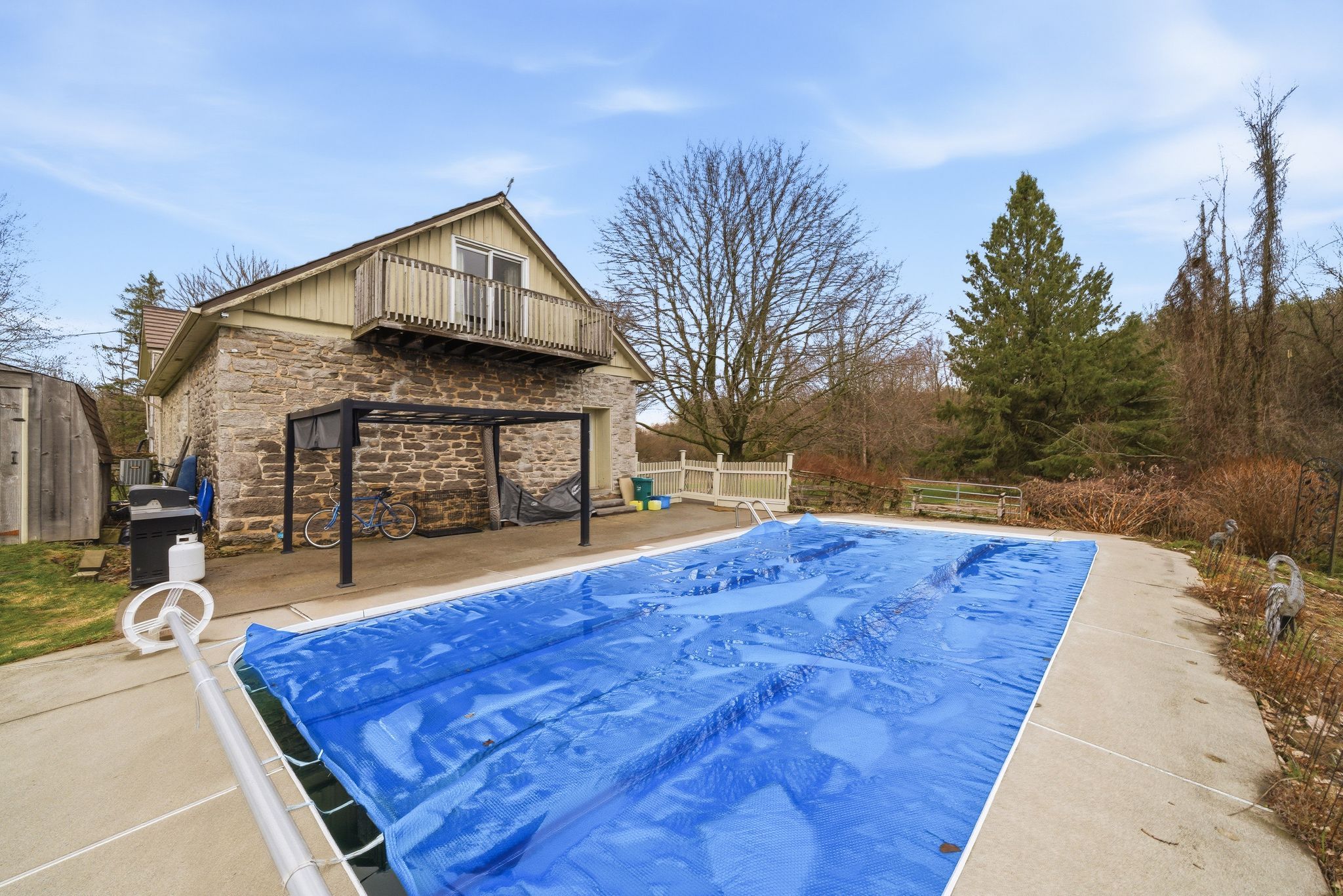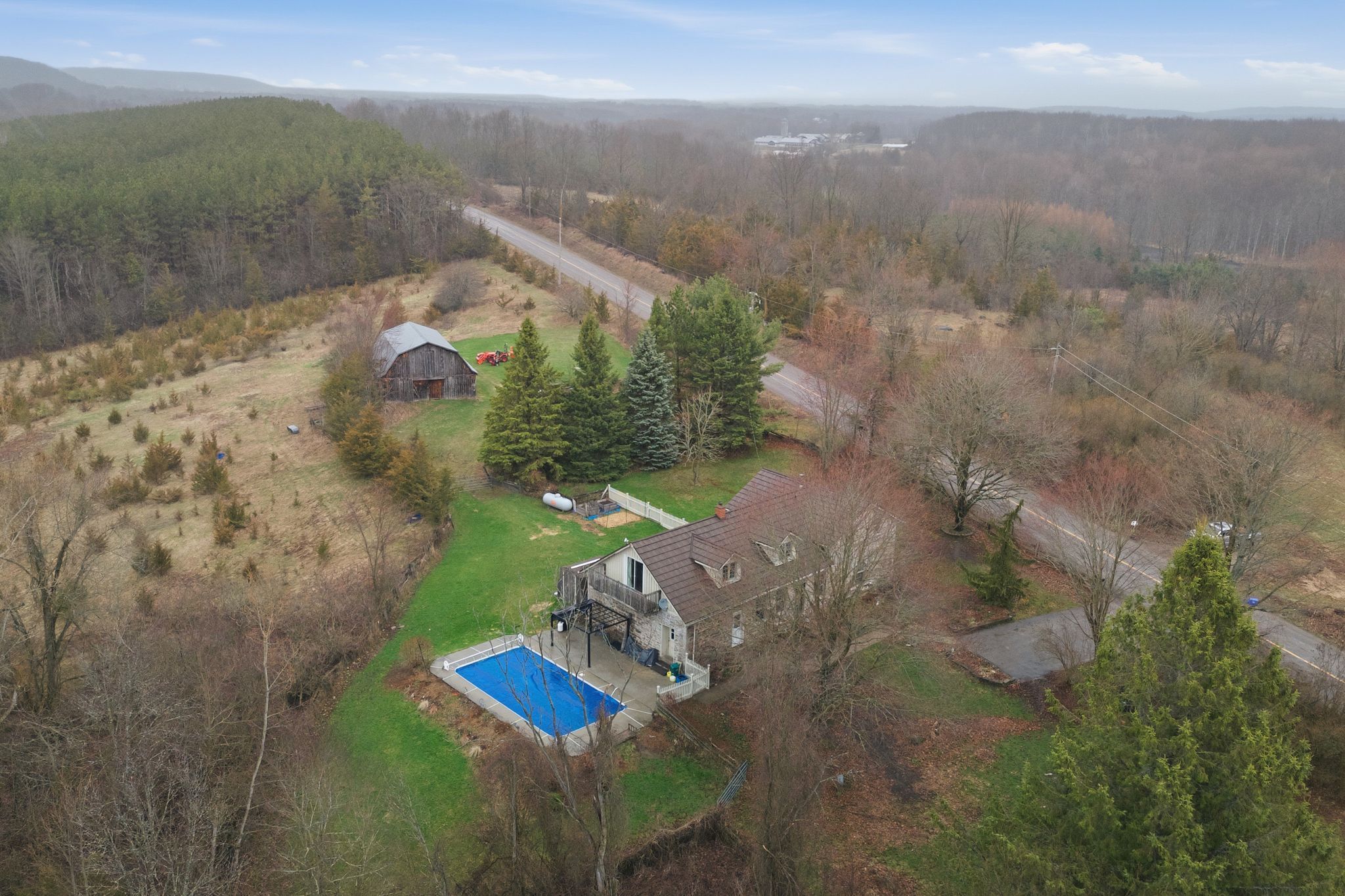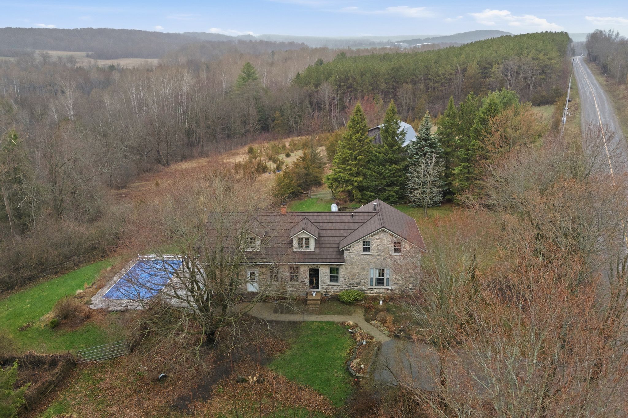 Step into a timeless countryside retreat where history and modern comfort blend seamlessly. This enchanting 1800's stone home sits on a picturesque 3. 63-acre wooded property, surrounded by protected land trust-offering lasting privacy with no future development nearby. Inside, you'll love the authentic charm-wide pine floors, exposed beam ceilings, and deep windows and mouldings that fill the home with warmth and light. The spacious layout features three main living areas, including a cozy living room with wood stove, a welcoming family room, and a versatile den-perfect for growing families. The updated cherry wood kitchen is the heart of the home, complete with a large island, vinyl flooring, and a generous dining area ideal for everyday living and entertaining. A main-floor 3-piece bath and laundry add convenience. Upstairs, the character continues with gleaming hardwood ash floors. The large primary suite offers a walk-out balcony with peaceful views of the trees and pool. Three additional bedrooms and a 3-piece bath with deep soaker tub provide plenty of space for family or guests. Outdoors, enjoy your own private oasis with a 16 x 32 inground pool and steel gazebo. The property is perfect for gardening, kids and pets, or simply enjoying nature. A barn/workshop with two stalls and a storage room adds incredible flexibility for storage. A rare opportunity for young families seeking a peaceful country lifestyle surrounded by nature, space, and endless possibilities.