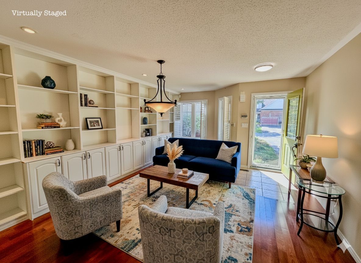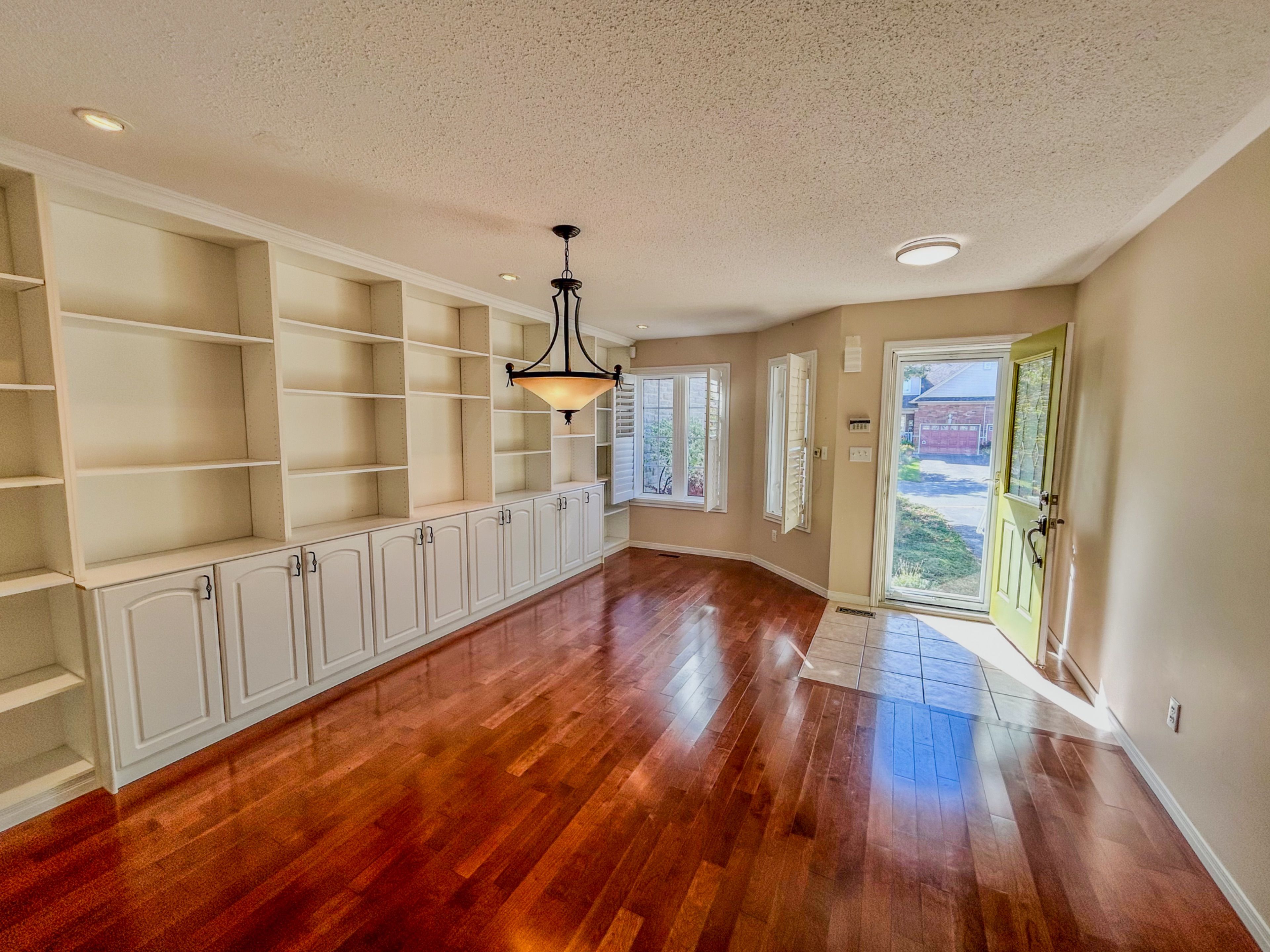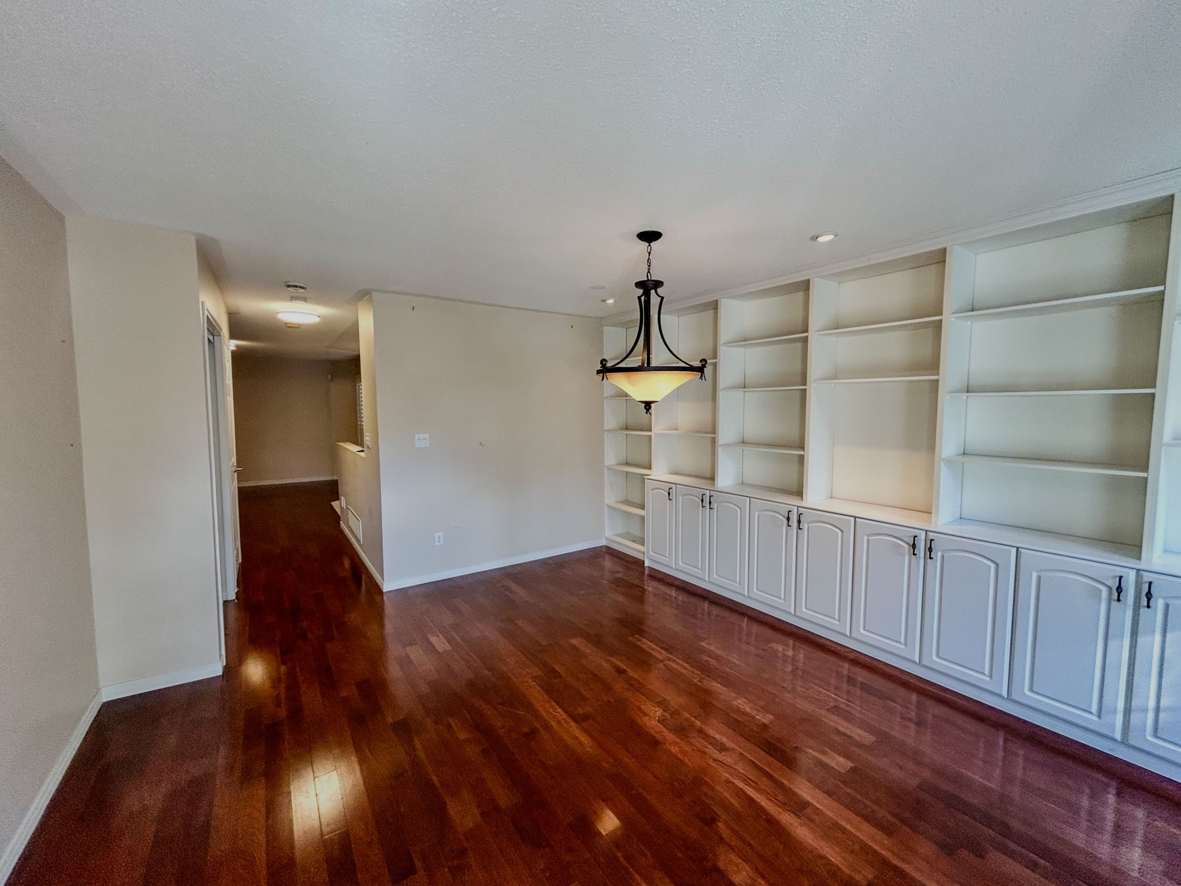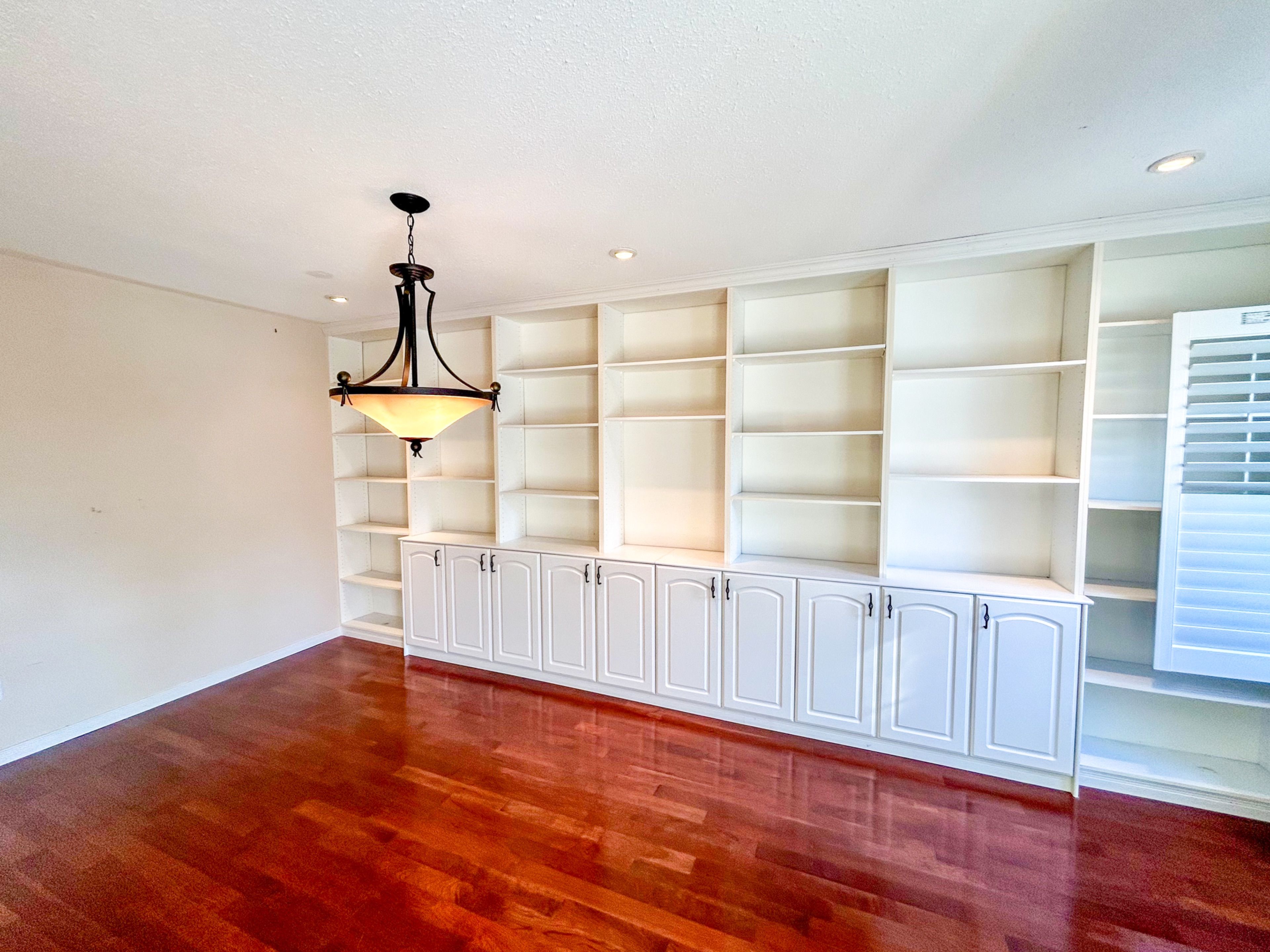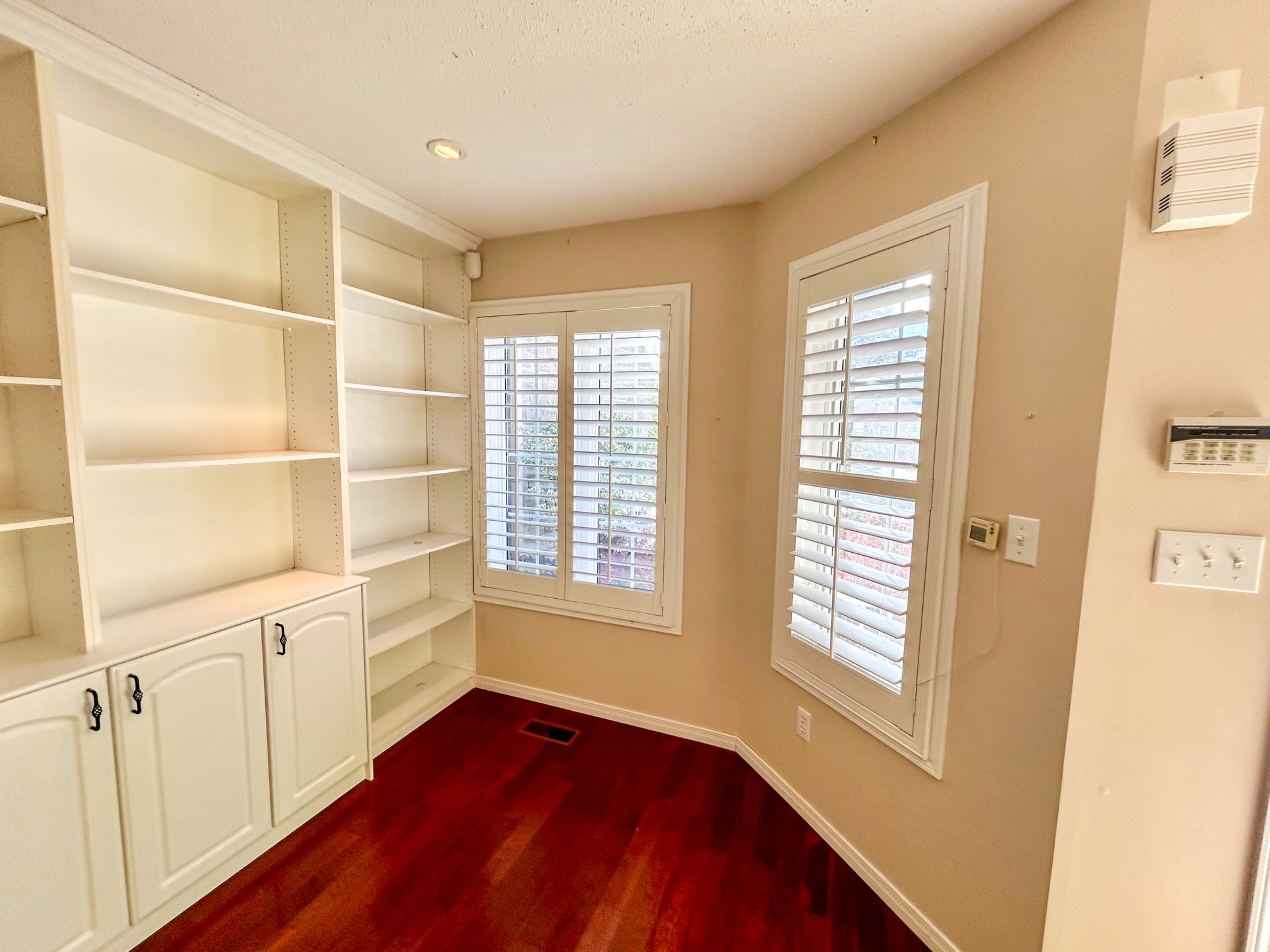 • Spacious dining room with natural light and built-in shelving.