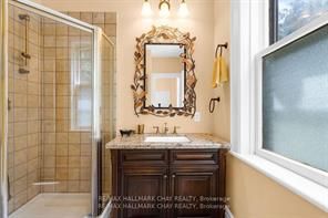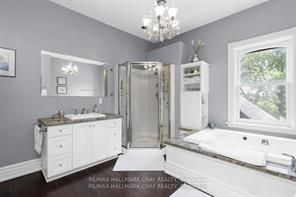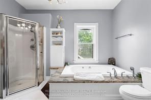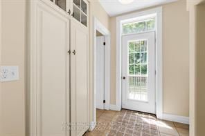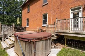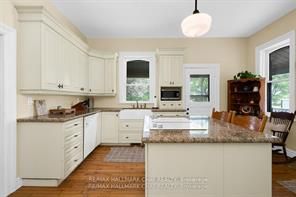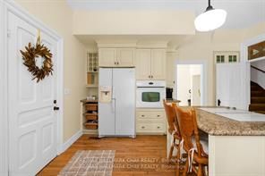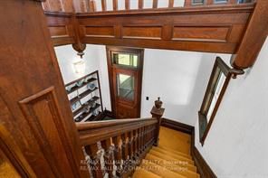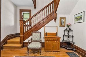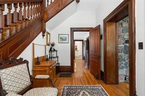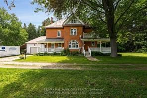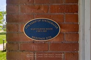 Welcome to martingrove! One of springwaters designated heritage homes. The handcrafted details are stunning, this home will call you... Built in 1906 on a private 2. 57 acre property surrounded by mature trees and backing and siding onto a farm field. Sound of birds and tanquility. Original wavy stained glass windows and stained glass transom windows with fleur-de-lis above doorways. Hardwood flooring on main and upper. Solid field stone wood fireplace surround. Two bathrooms 3 piece on main and very large spa size bathroom on upper. Updated electrical, metal roof. The hand crafted railing and balusters are breath taking. Back staircase from kitchen with a gorgeous amber glass fixture and fleur de lis transom window. Wrap around porch for serene outdoor seating. Hot tub off the back deck. Solar panel contract that draws income. This home is charming and grand.