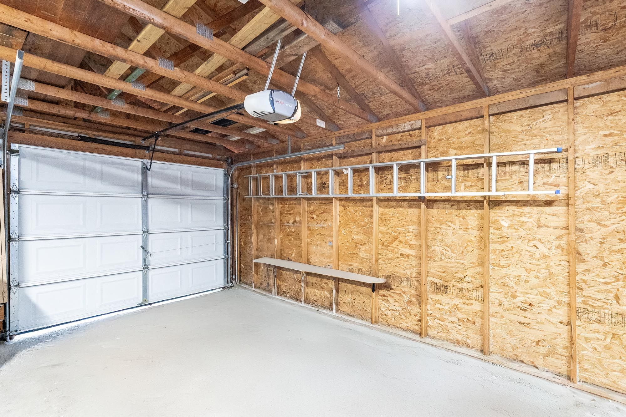 • Bright double detached garage with shelving, perfect for hobbies and storage.