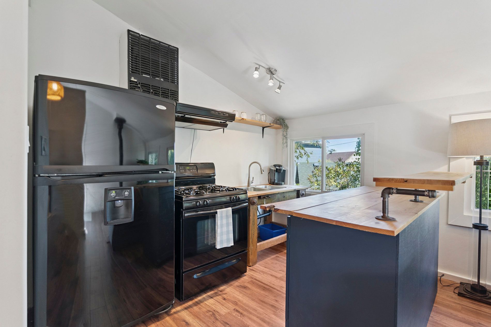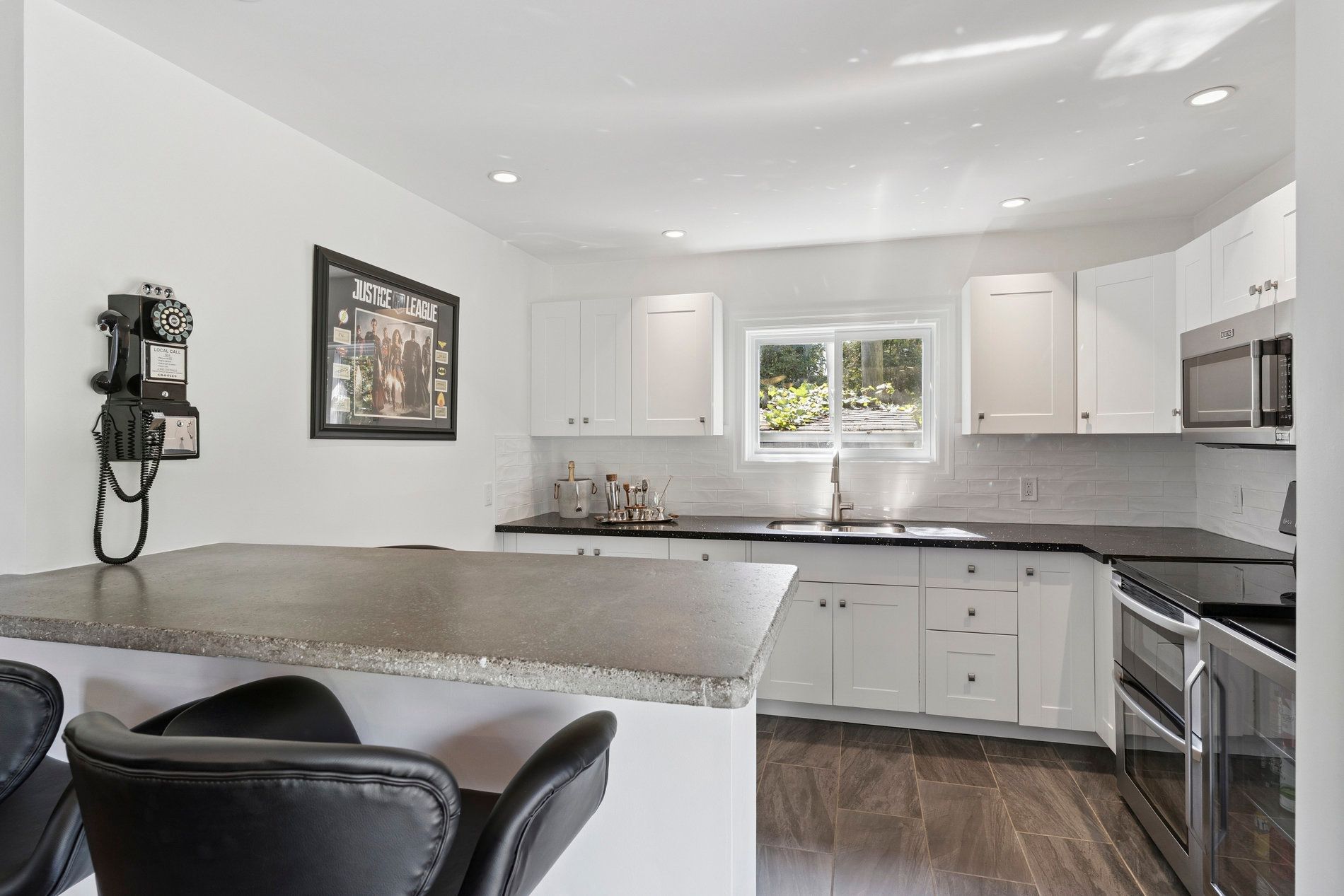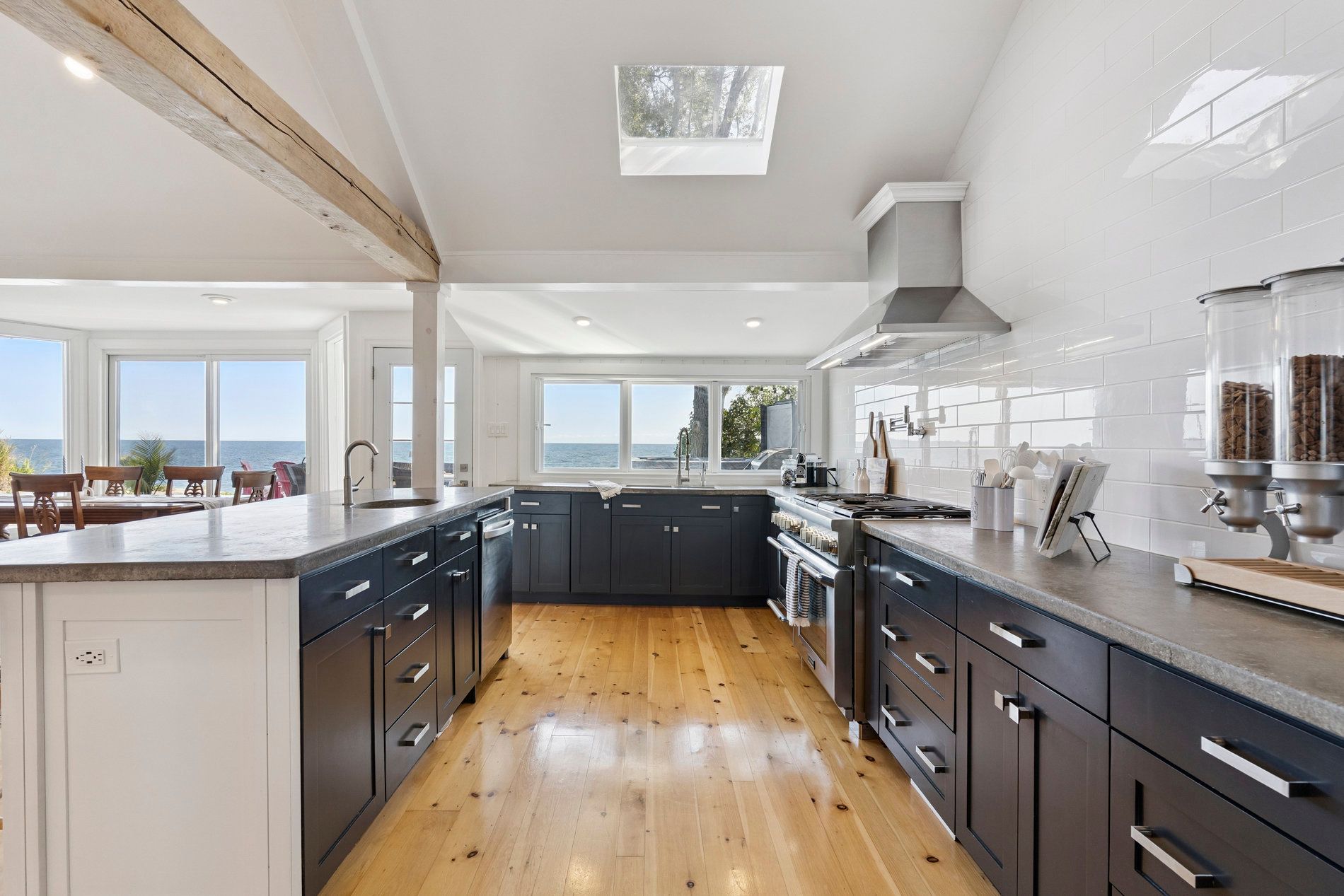 • Chef's kitchen featuring modern appliances and a pass-through window for convenience.