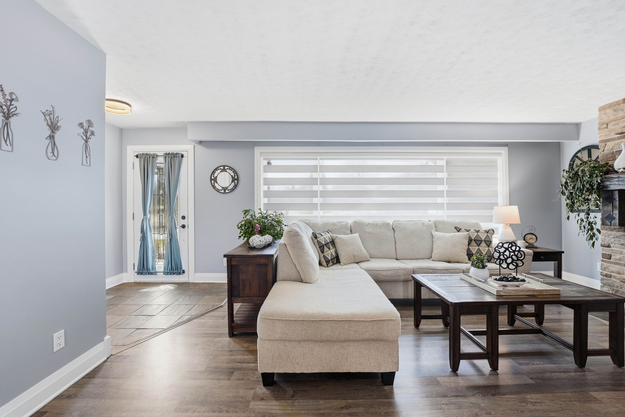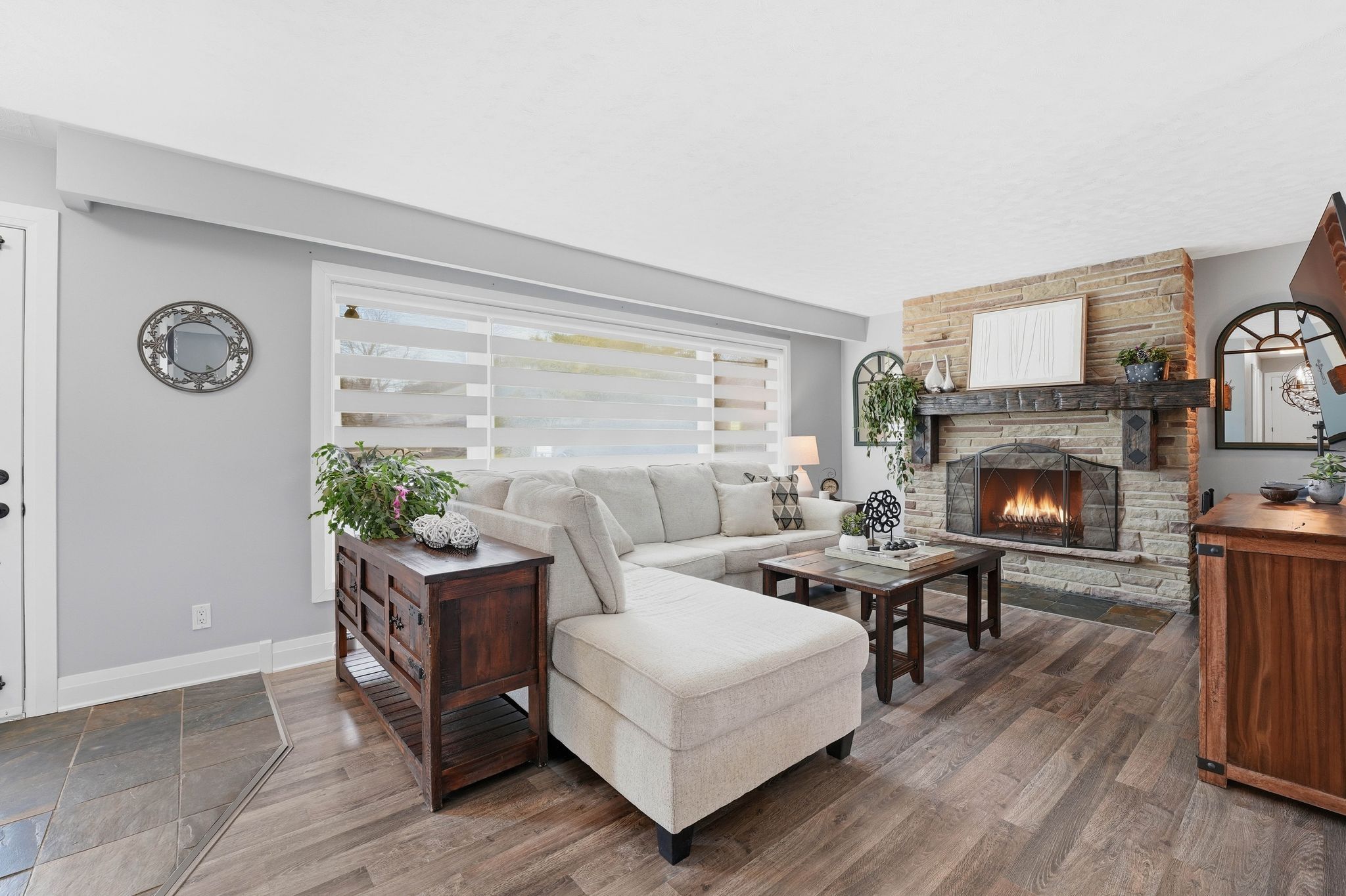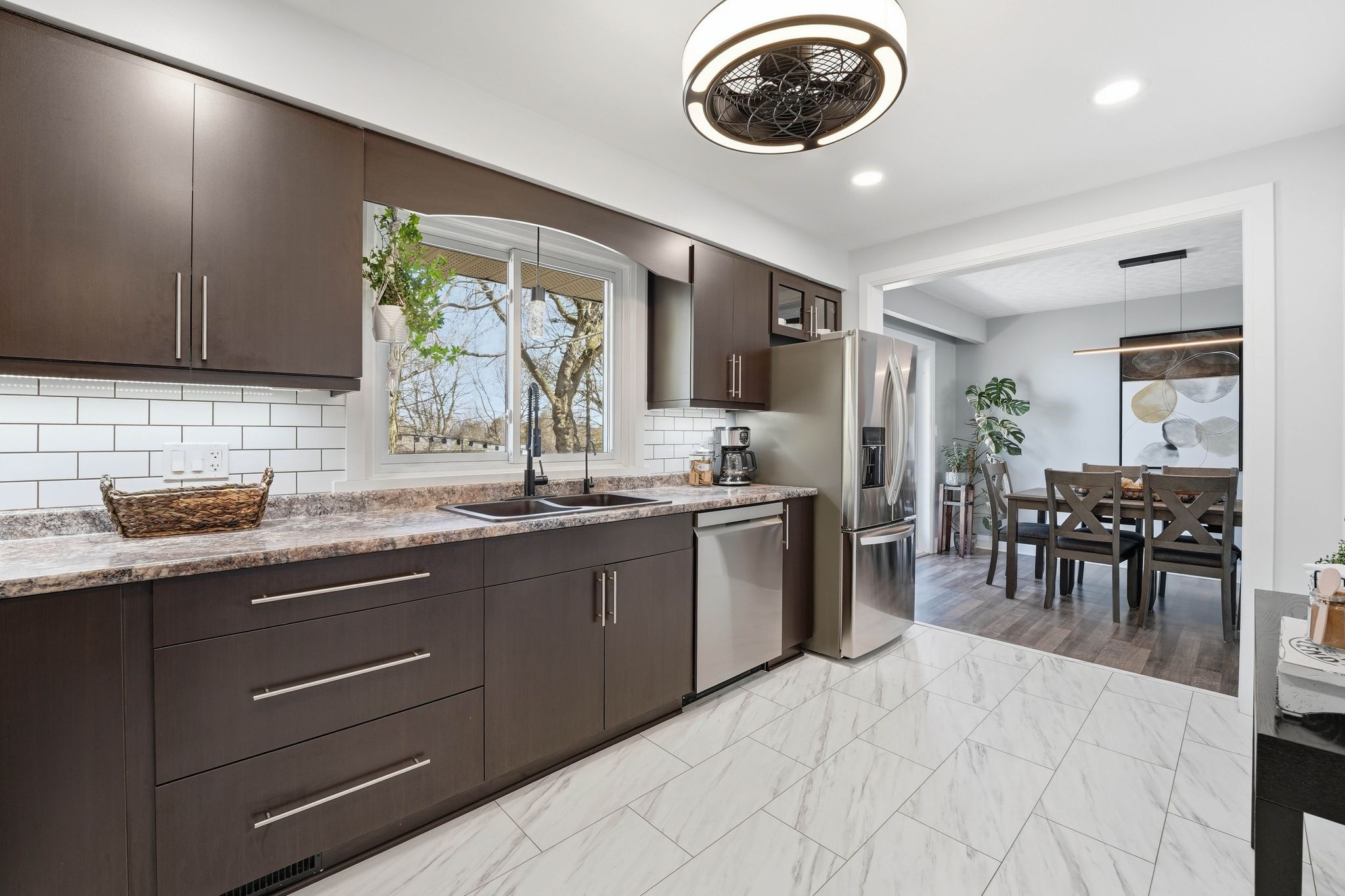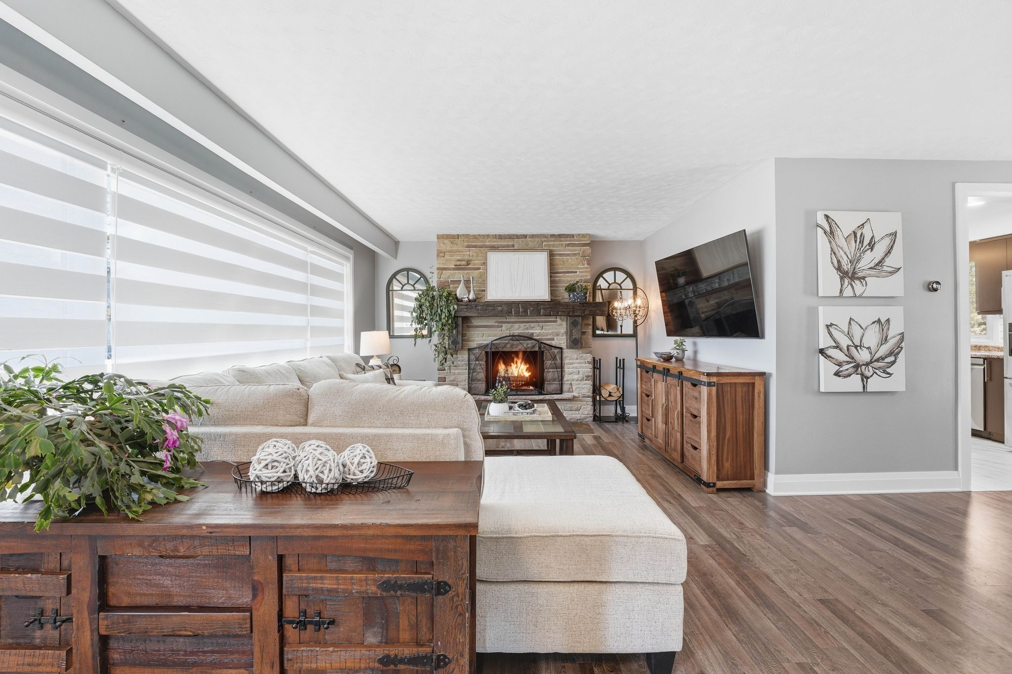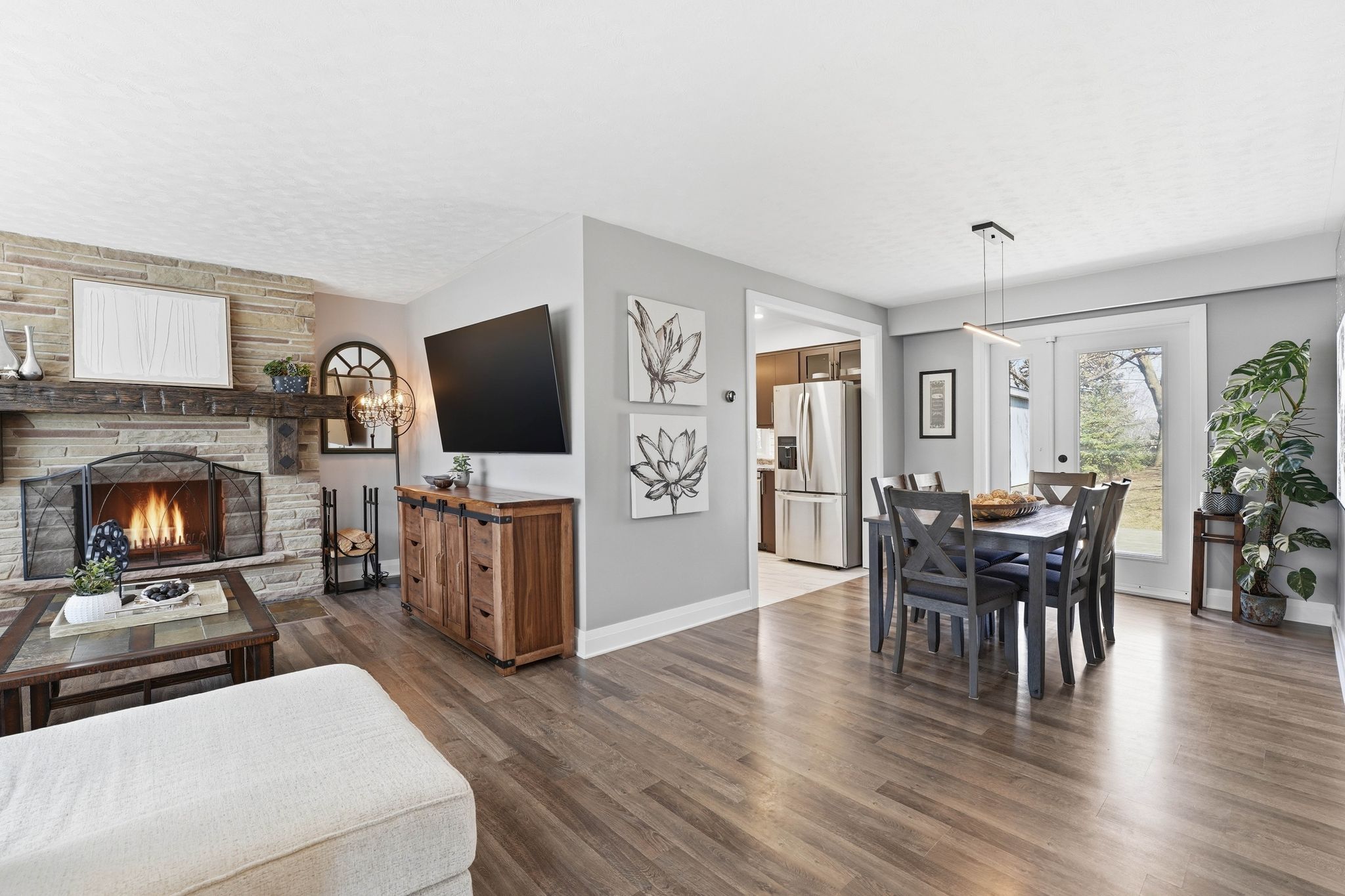 • Bright open-concept living area with a custom fireplace and dining space.