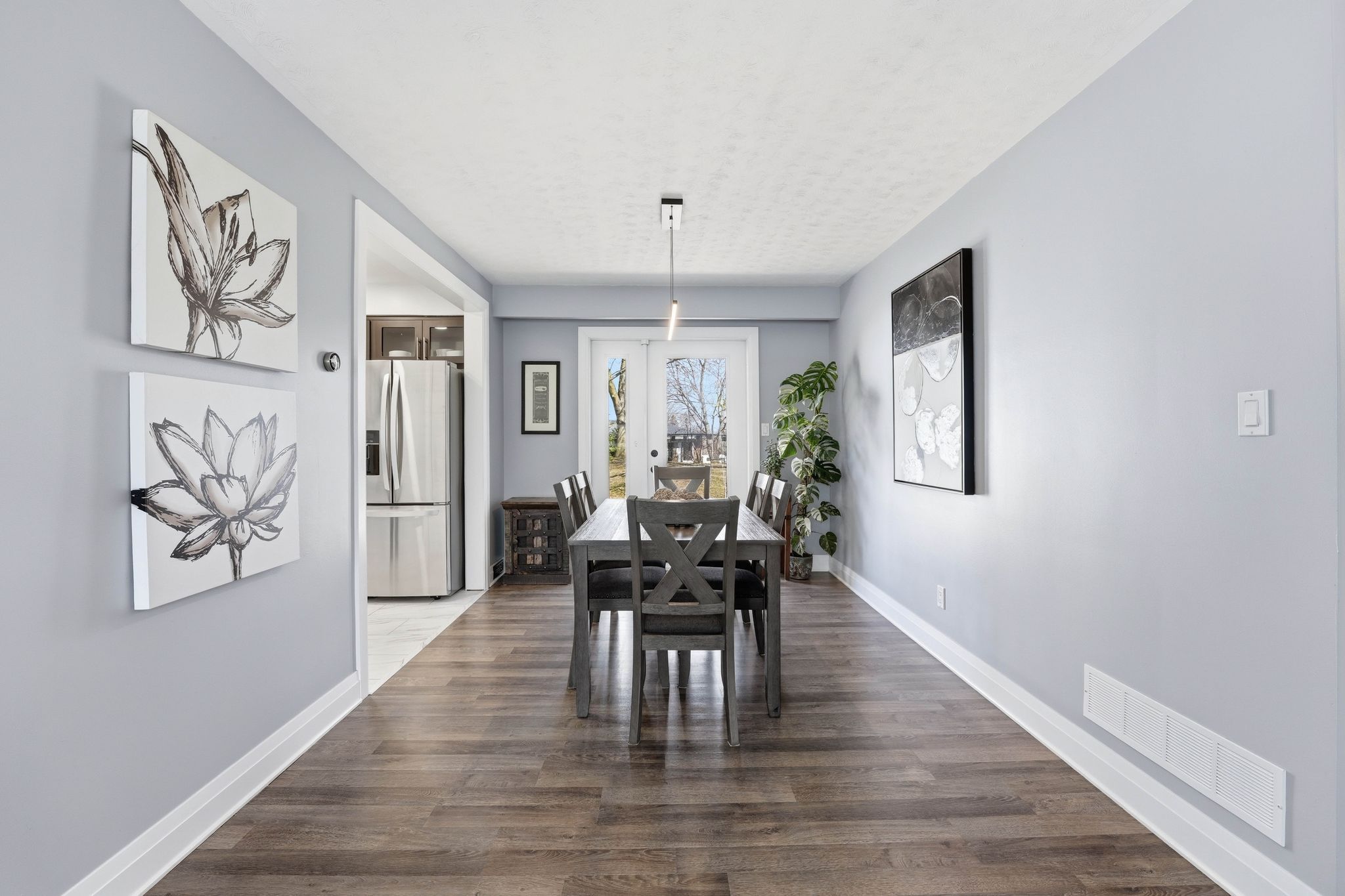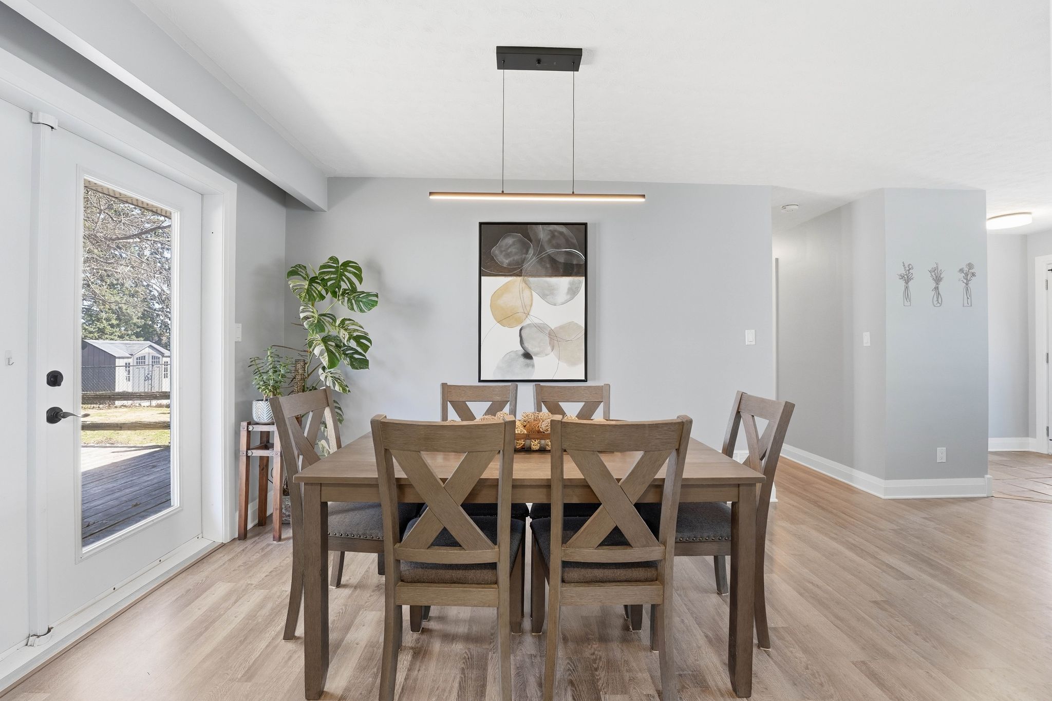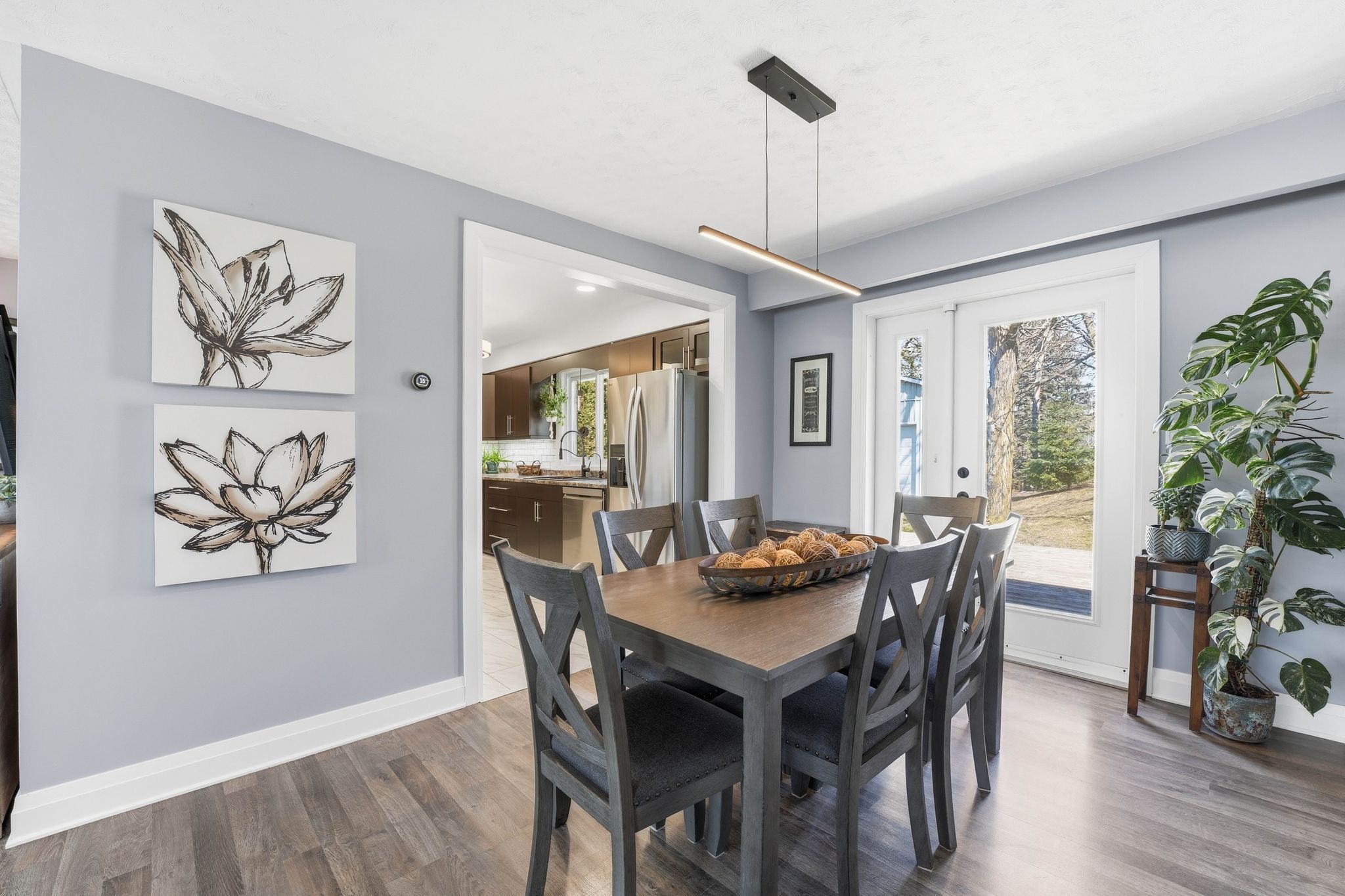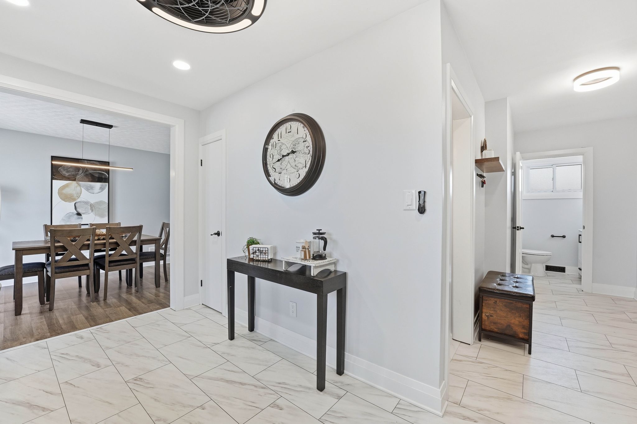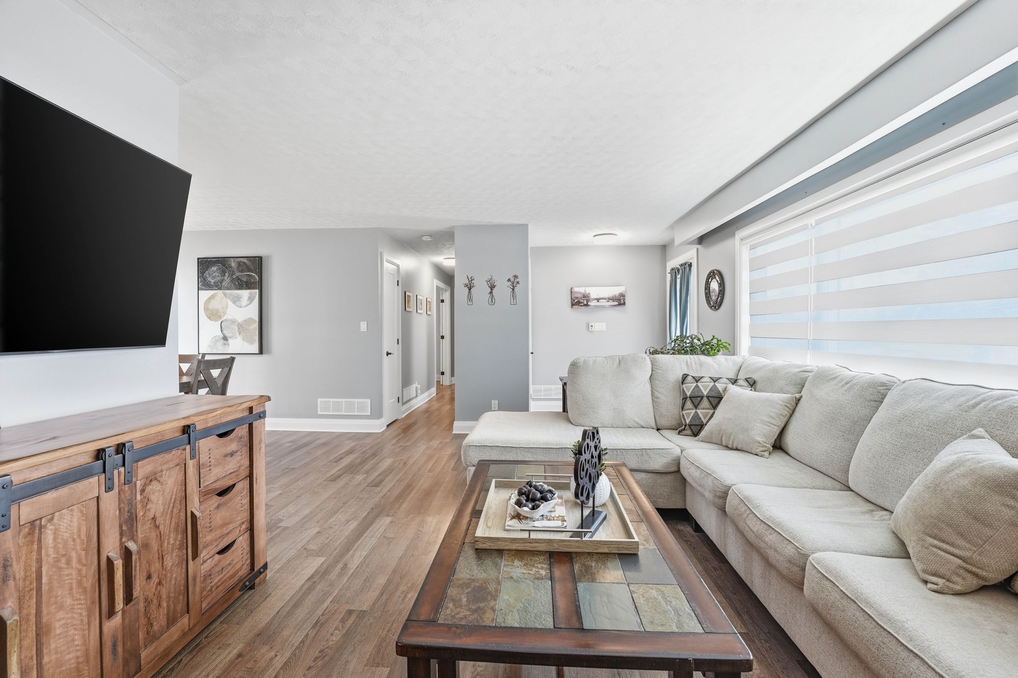 • Bright open-concept living area with a custom fireplace and dining space.
