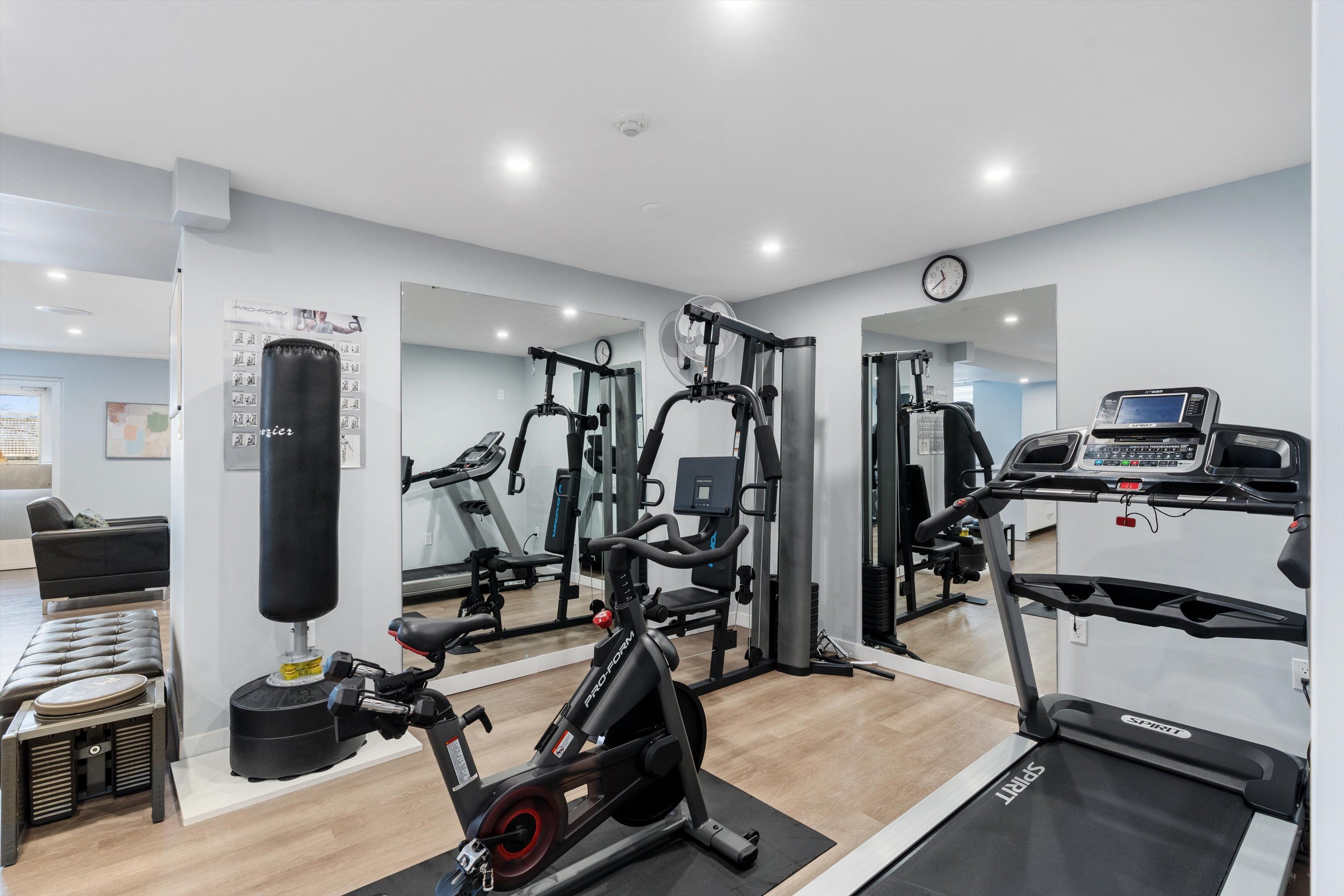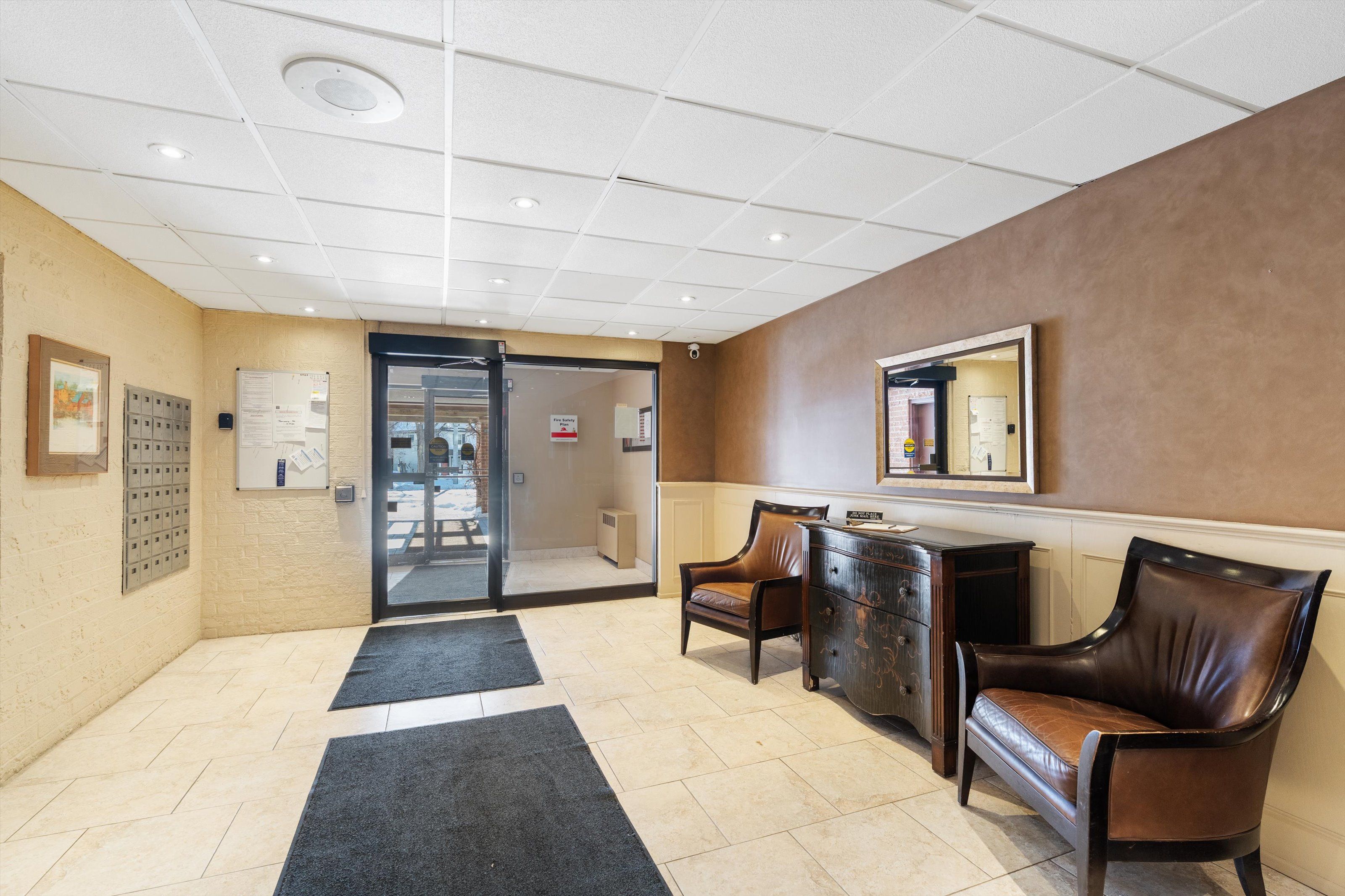 • Building amenities include gym, sauna, and convenient downtown location.