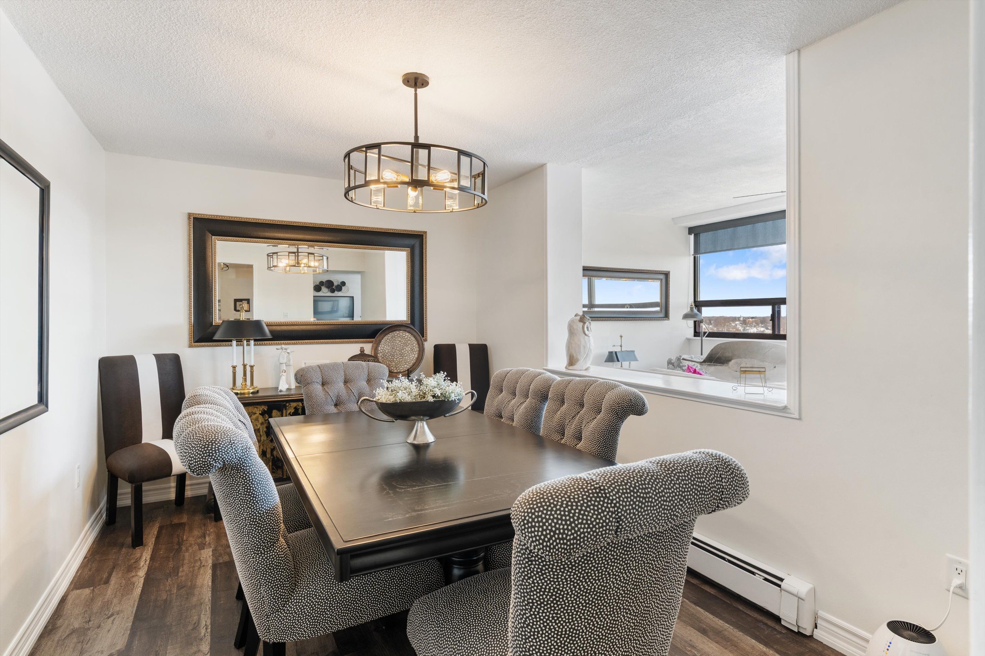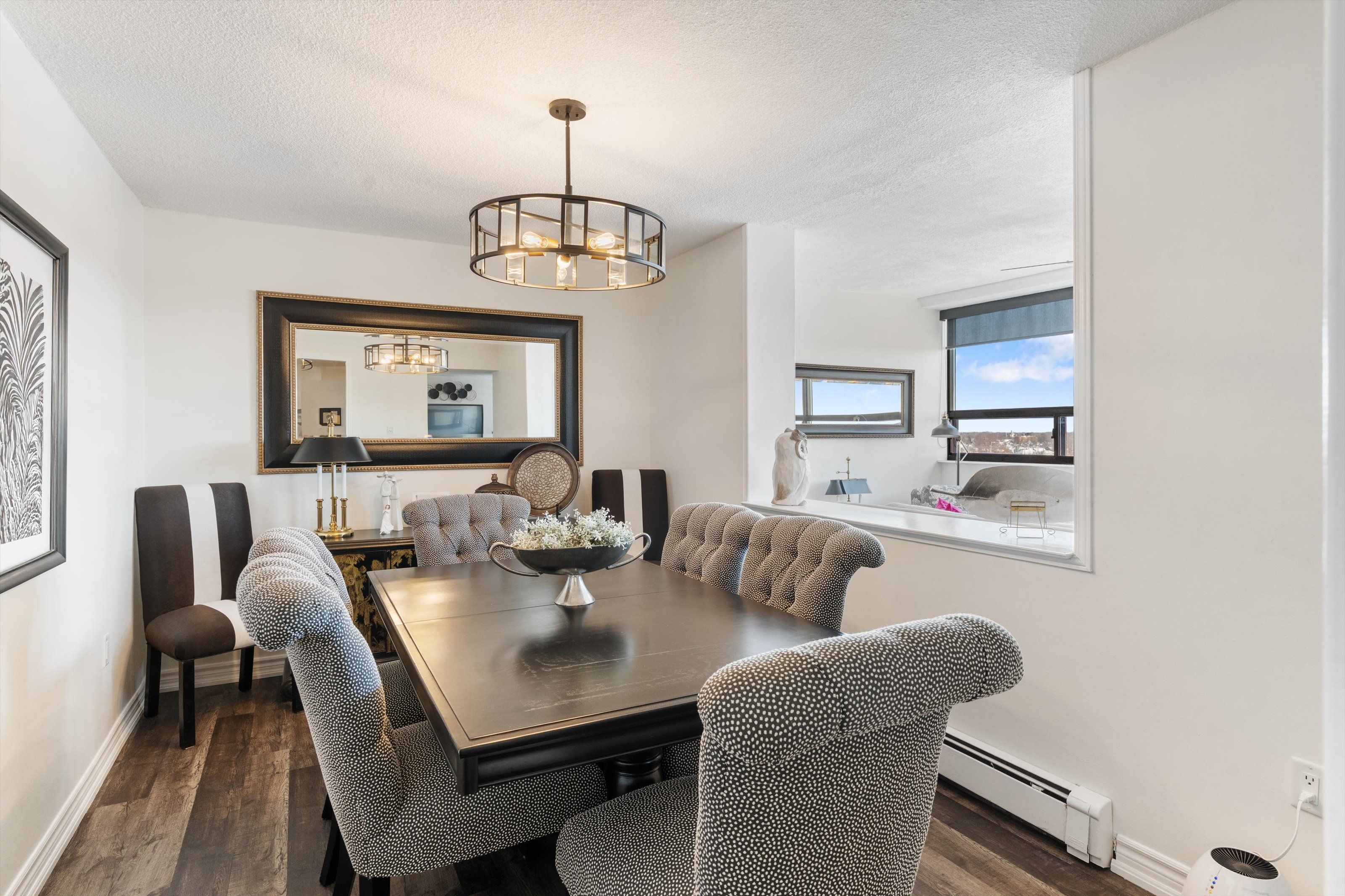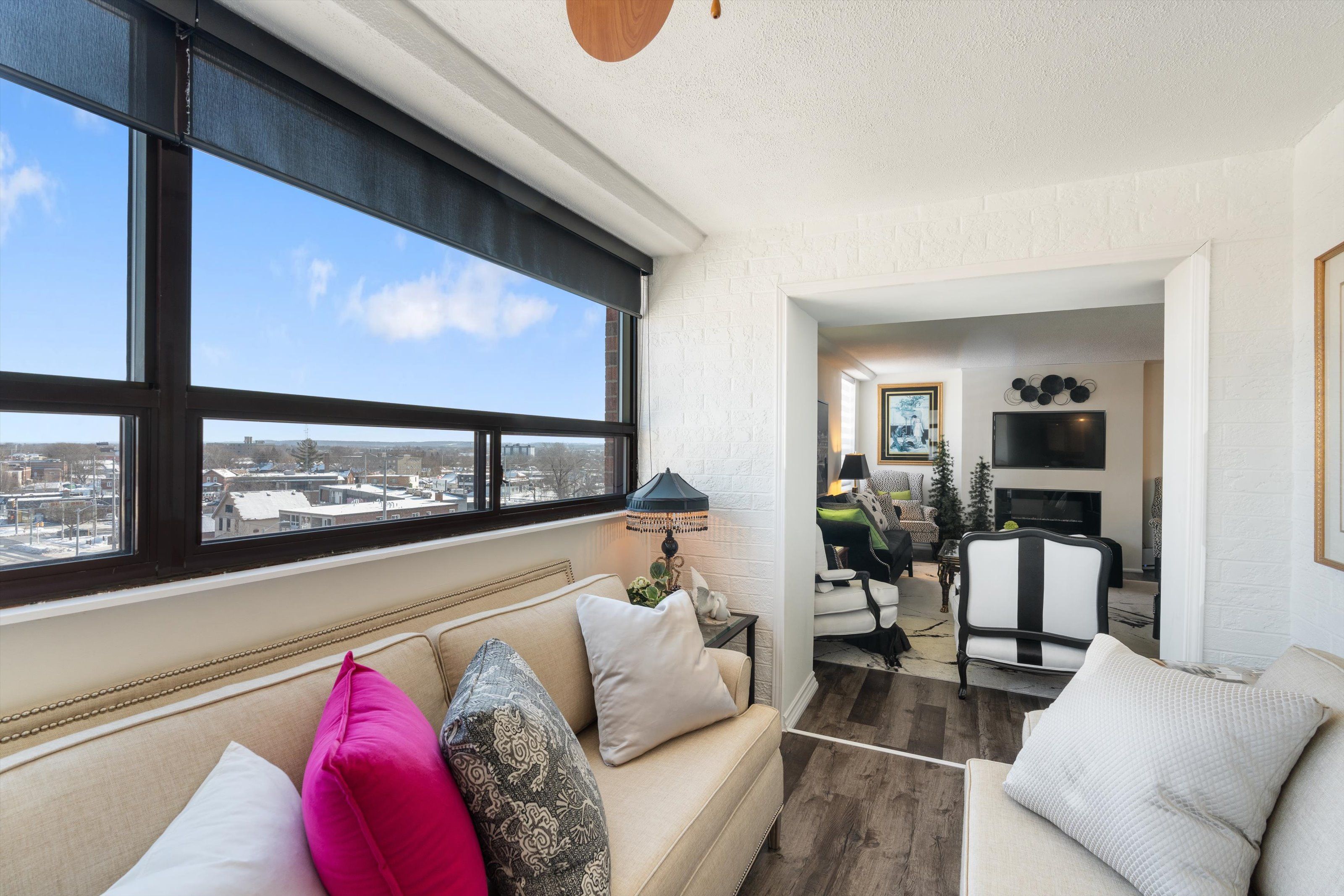 Style, space & affordability. This spacious 1400+ sq ft condo has numerous features that will check all the boxes for the discerning buyer. Having only 4 units on each floor gives the complex that exquisite boutique hotel feel. This corner unit offers two large bedrooms, (primary bedroom measures 19' x 11 1/2' & has a walk in closet), renovated main bathroom with accessible shower with glass doors, a powder room for guests, formal dining room opens to the extra sitting room where both rooms benefit from an abundance of natural light. Panoramic views can be enjoyed from the many windows of this 6th floor unit. The owner has recently installed a fireplace in the living room adding to the overall ambience of this elegant room. The modern black & white kitchen has newer appliances, open breakfast bar with plenty of seating, stylish ceramic backsplash, quartz counters and white cabinetry with some glass feature doors. Conveniently located, the utility closet has built in cabinetry perfect for storage of sundries. Improvements throughout include upgraded baseboards, trim, interior passage & closet doors, laminate flooring, built in cabinetry in many areas, custom blinds, etc. Included in the condo fees: hydro, heat, tv, wifi, parking, laundry, water, common areas & more. Building amenities include: gym, sauna, open deck with use of bbq, pergolas, outdoor furniture, community gardens, lounge/library, elevator, covered parking & more. Convenient downtown location is convenient to dining, performing arts centre, meridian centre, farmer's market, shopping, hwy access & so much more.