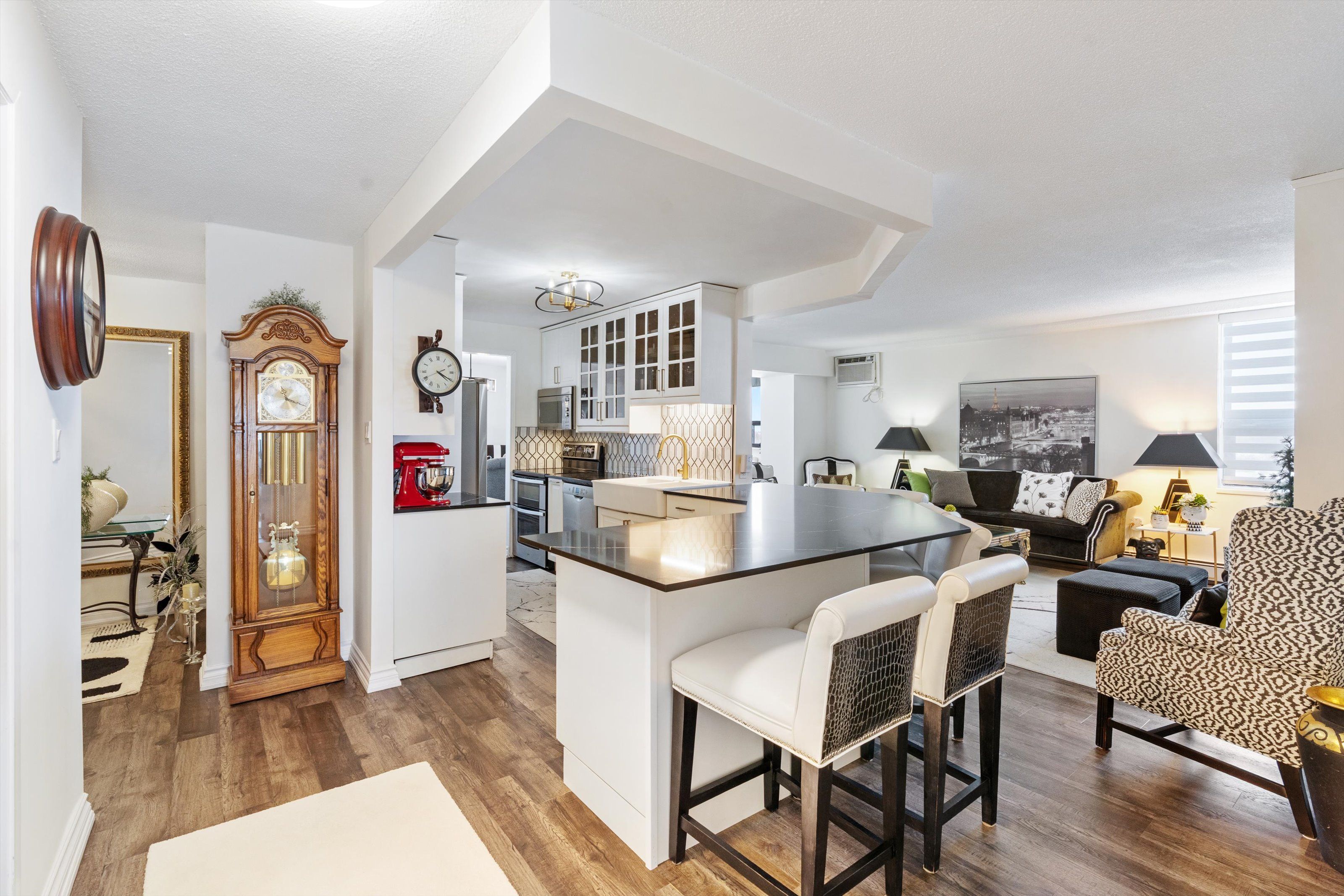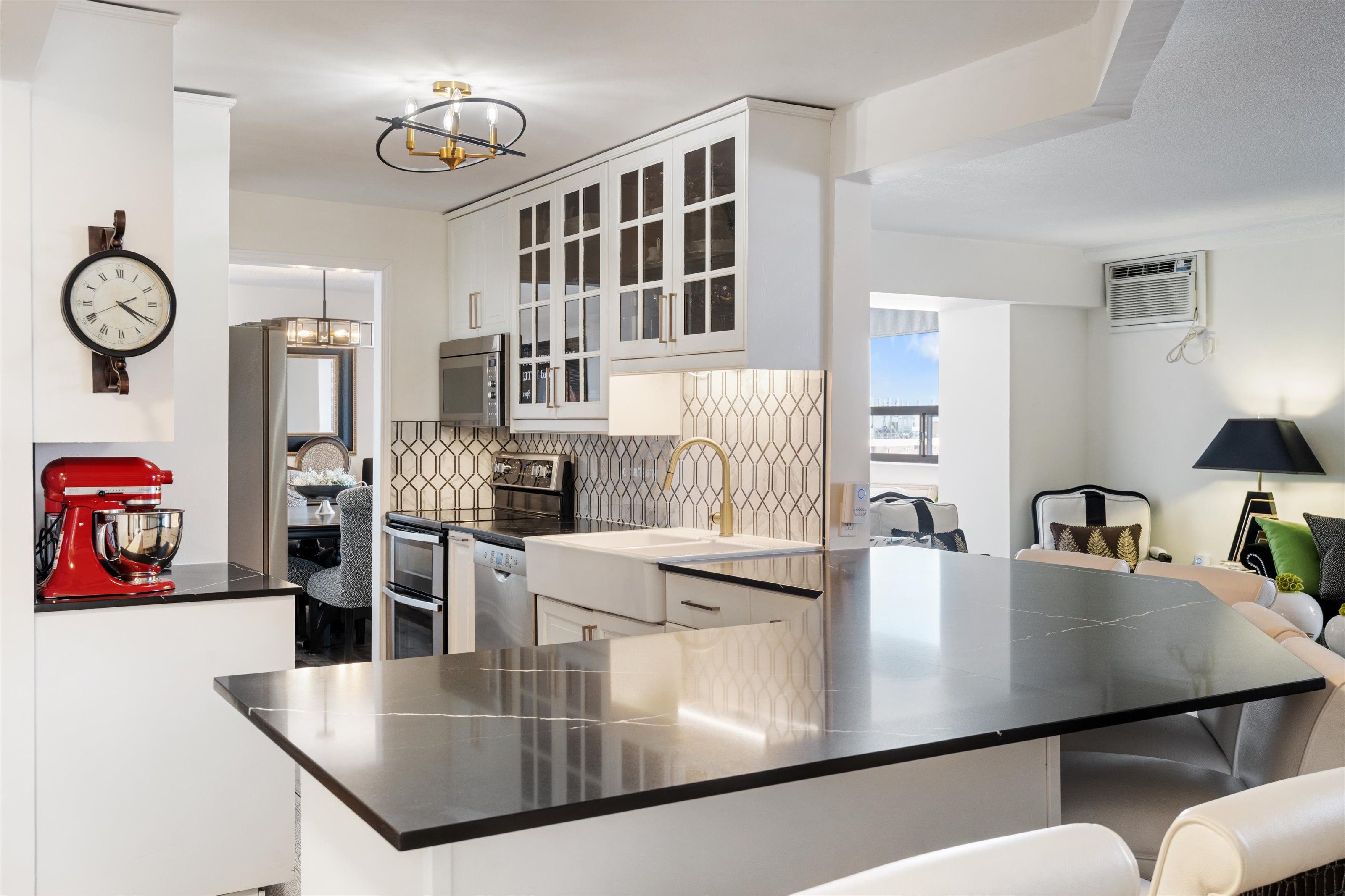 • Modern kitchen with newer appliances, breakfast bar, and stylish finishes.