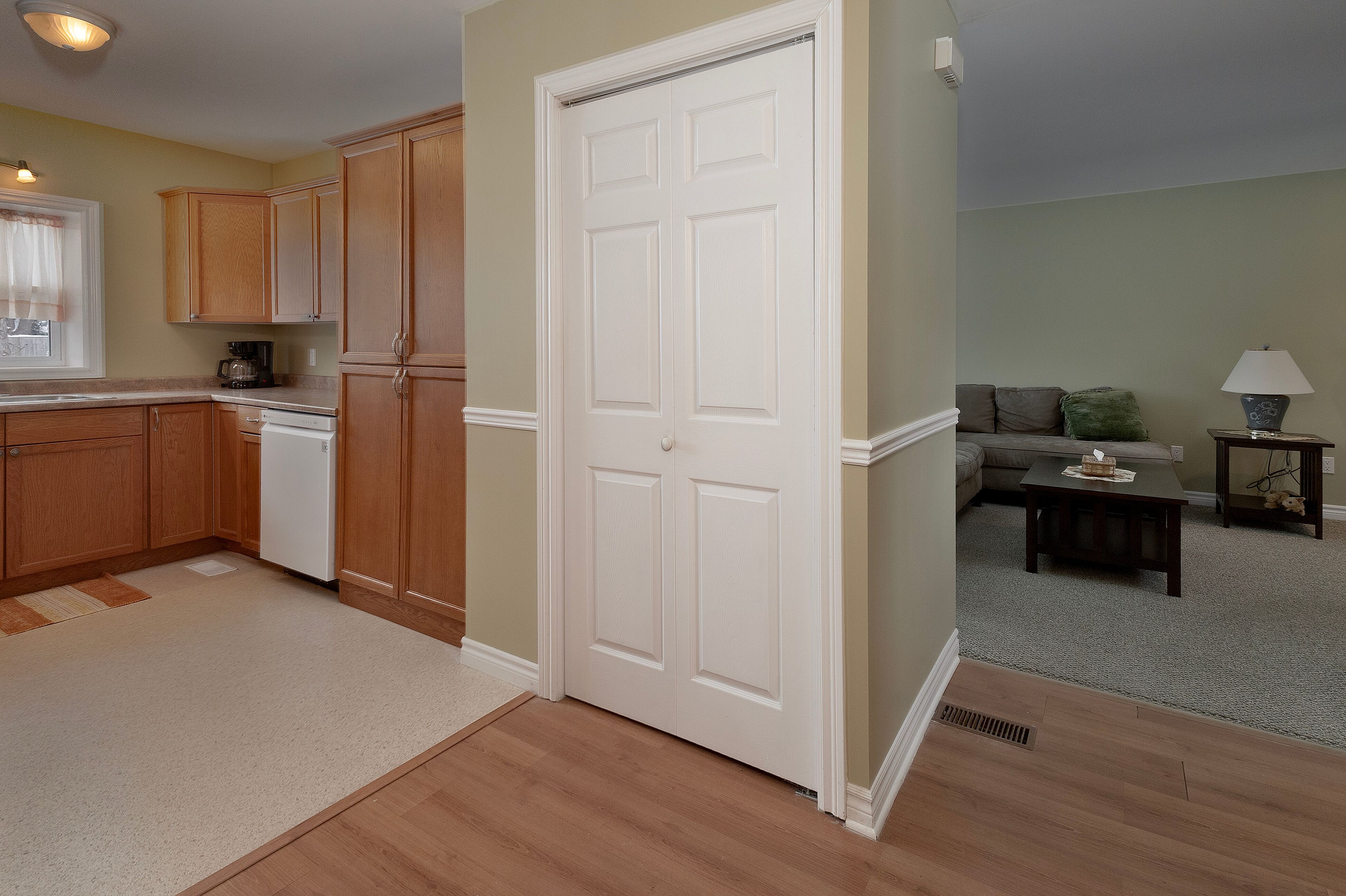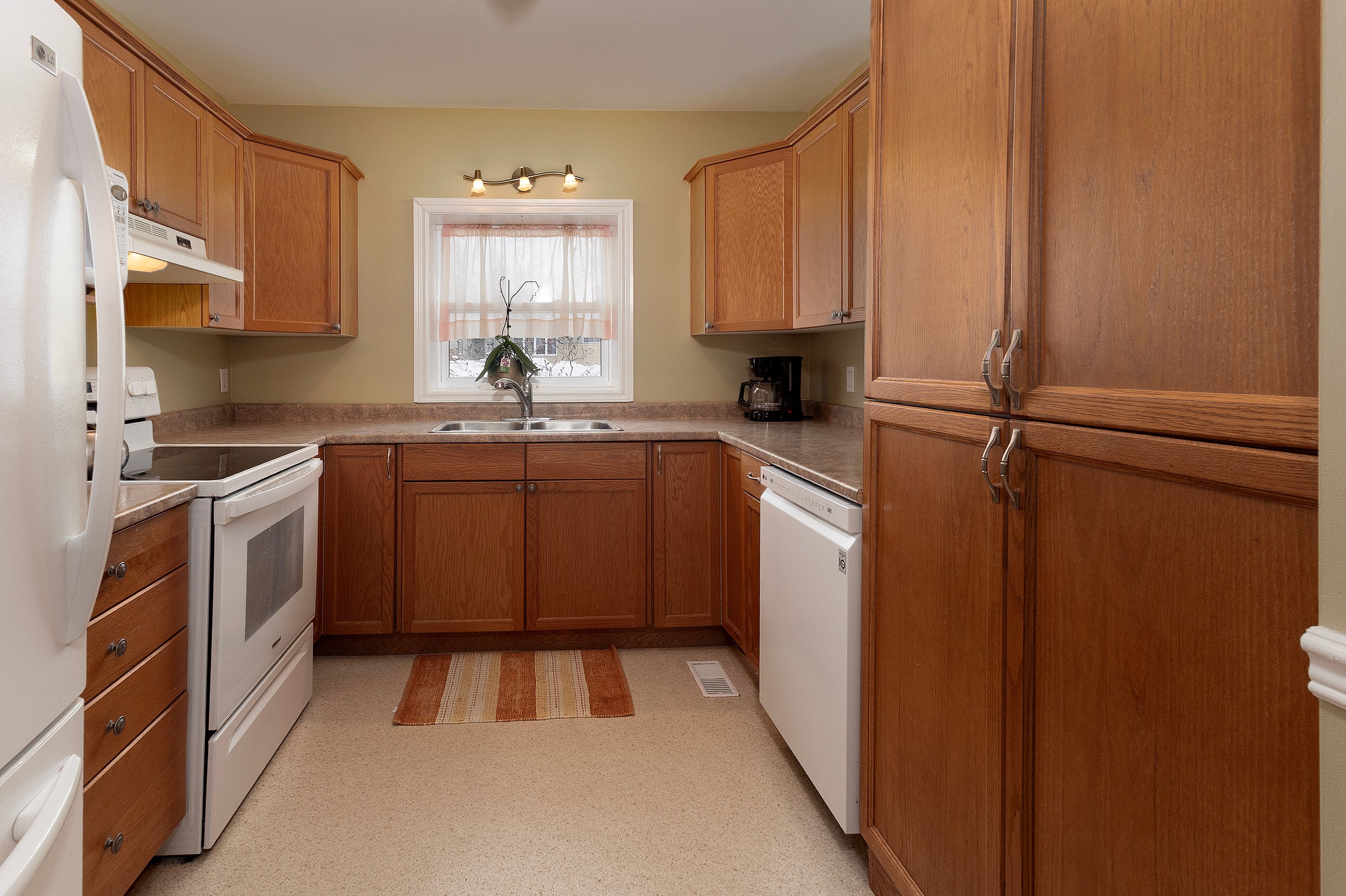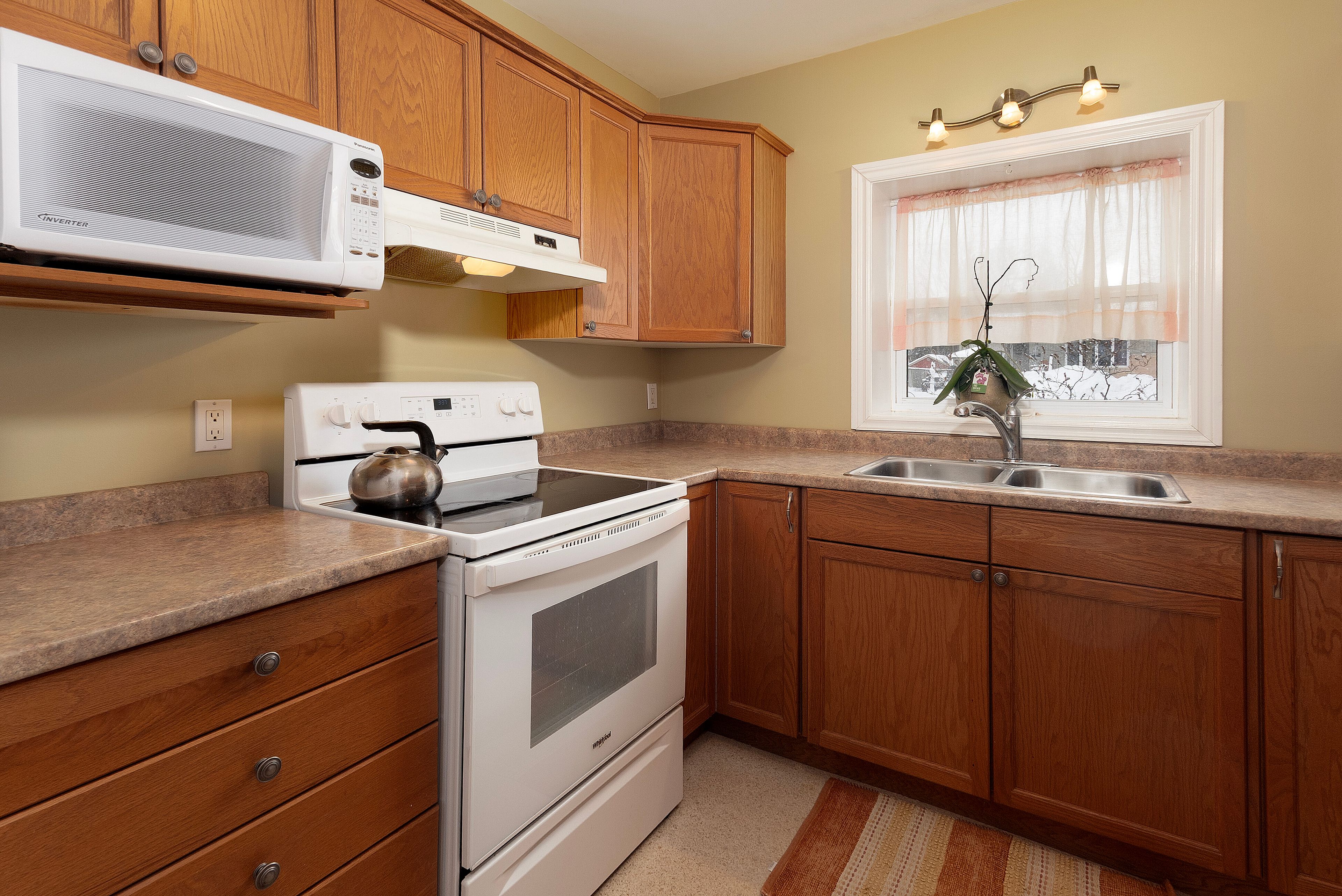 • Spacious kitchen with oak cabinets and two sets of patio doors to decks.
