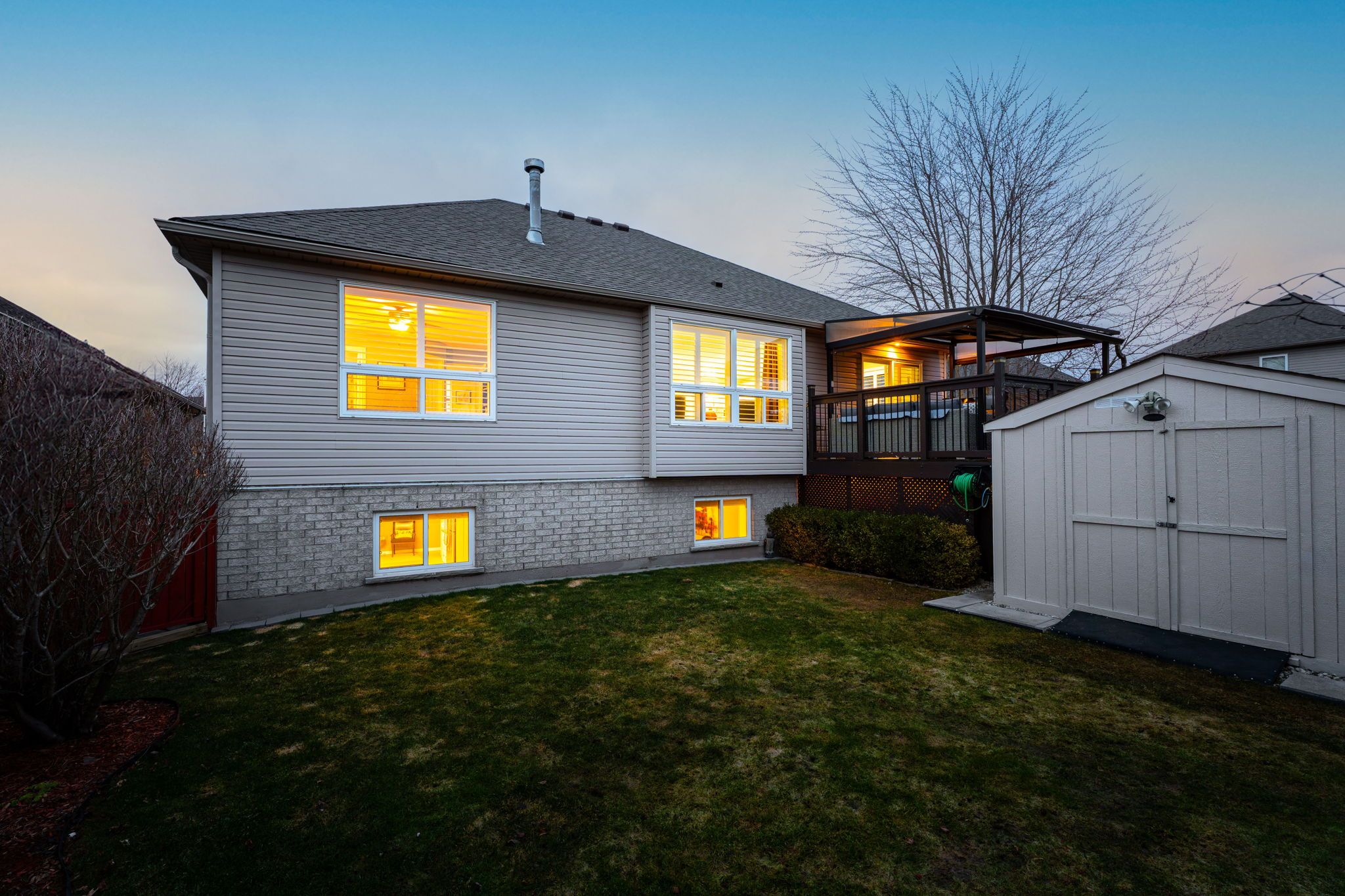 This meticulously maintained home offers a rare opportunity for those looking to downsize or accommodate a multigenerational family with ease. The main level features a stunning updated kitchen with granite countertops, stainless steel appliances, and a bright breakfast area that flows into a cozy family room anchored by a gas fireplace. Large picture windows showcase flows into a cozy family room anchored by a gas fireplace. Large picture windows showcase serene views of the lush gardens and open space, as there are no neighbors behind the property. The primary suite is a private retreat with bamboo flooring, california shutters, and a 4-piece ensuite, complemented by two additional main-floor bedrooms and a separate dining room. Adding incredible value is the bright lower level, which features above-grade windows that ensure the space never feels like a basement. This level is fully equipped with a second kitchen, a large living area, two more bedrooms, and a full bath-making it the perfect setup for in-laws or guests. Outside, the property is an entertainer's dream, featuring a walk-out gazebo with a retractable roof and sunshades. The exterior is rounded out by an aggregate/asphalt driveway with french curbs providing parking for six, all located on a premium lot with no sidewalks to maintain. Completing this exceptional property is a two-car garage that is truly a car lover's dream, featuring finished floors, custom wall cabinets for organization, and a dedicated gas heater for year-round comfort.