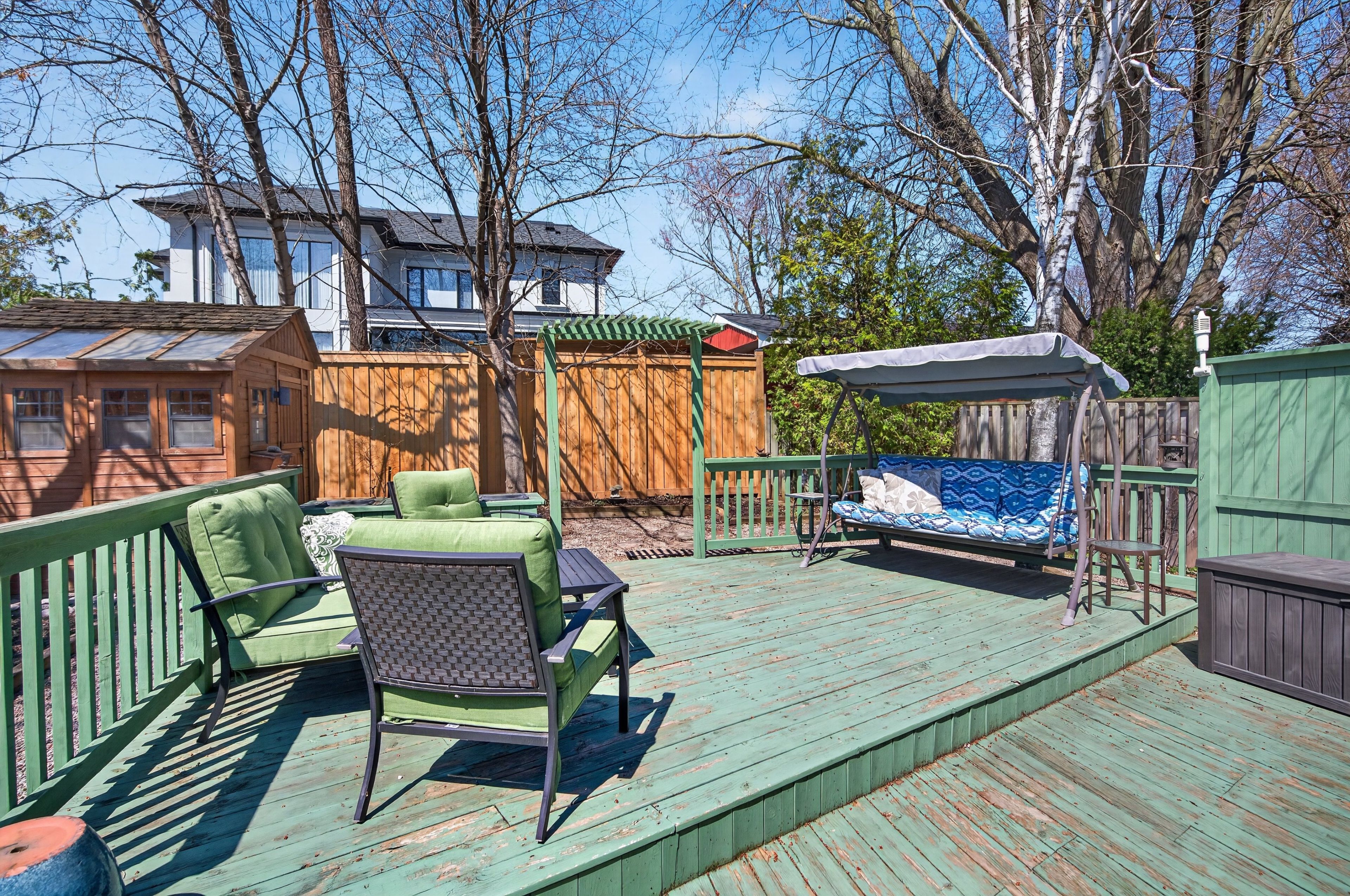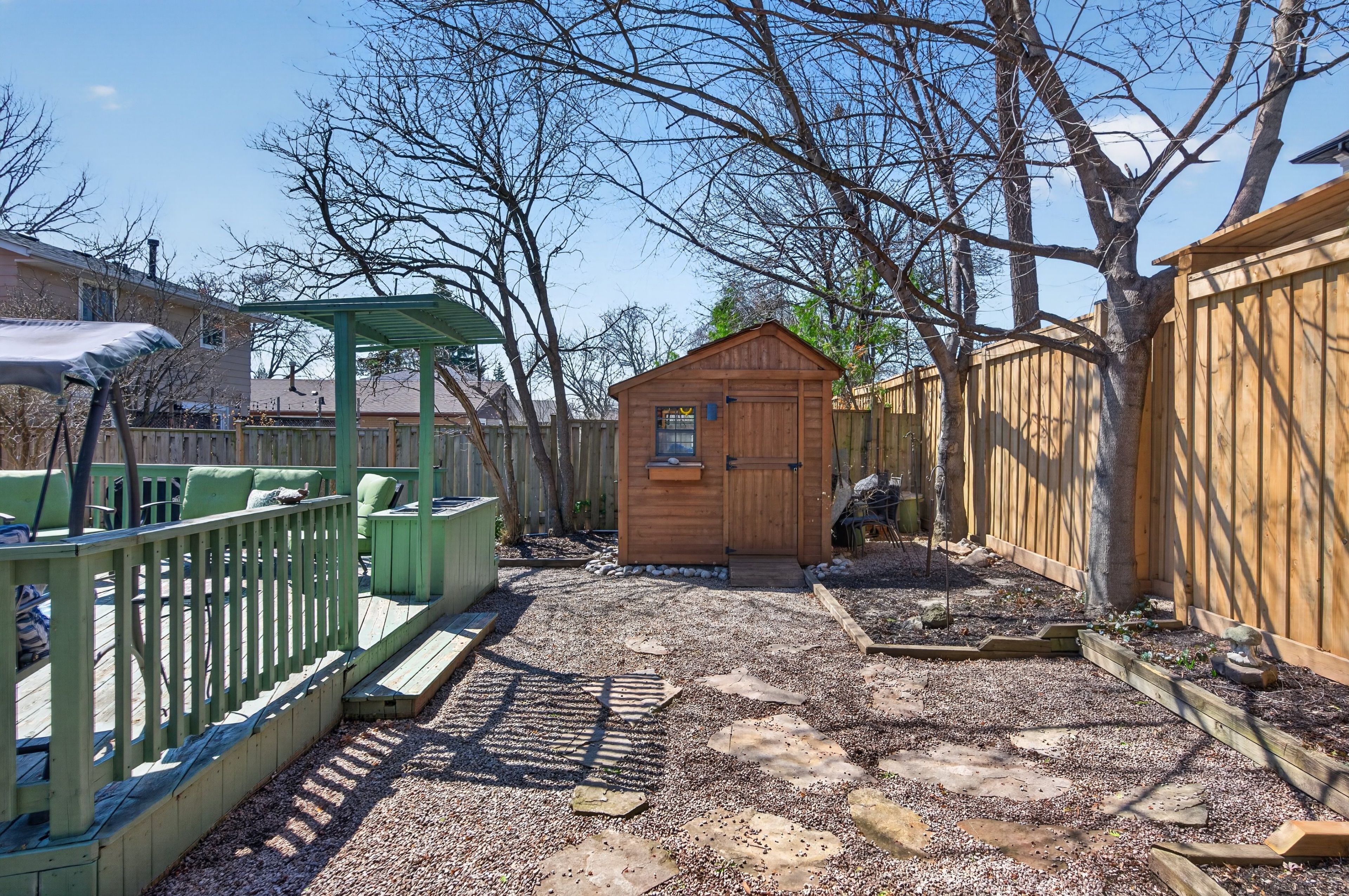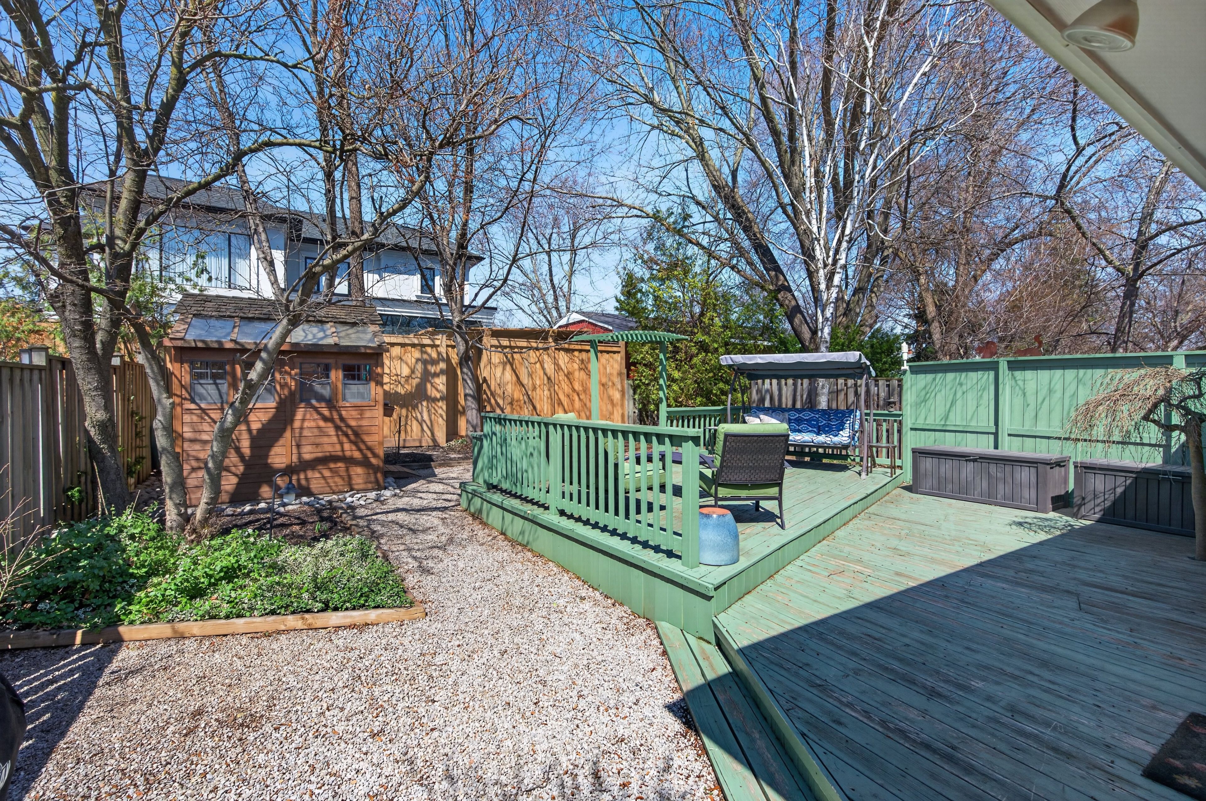 • Private backyard with a spacious deck and two garden sheds.