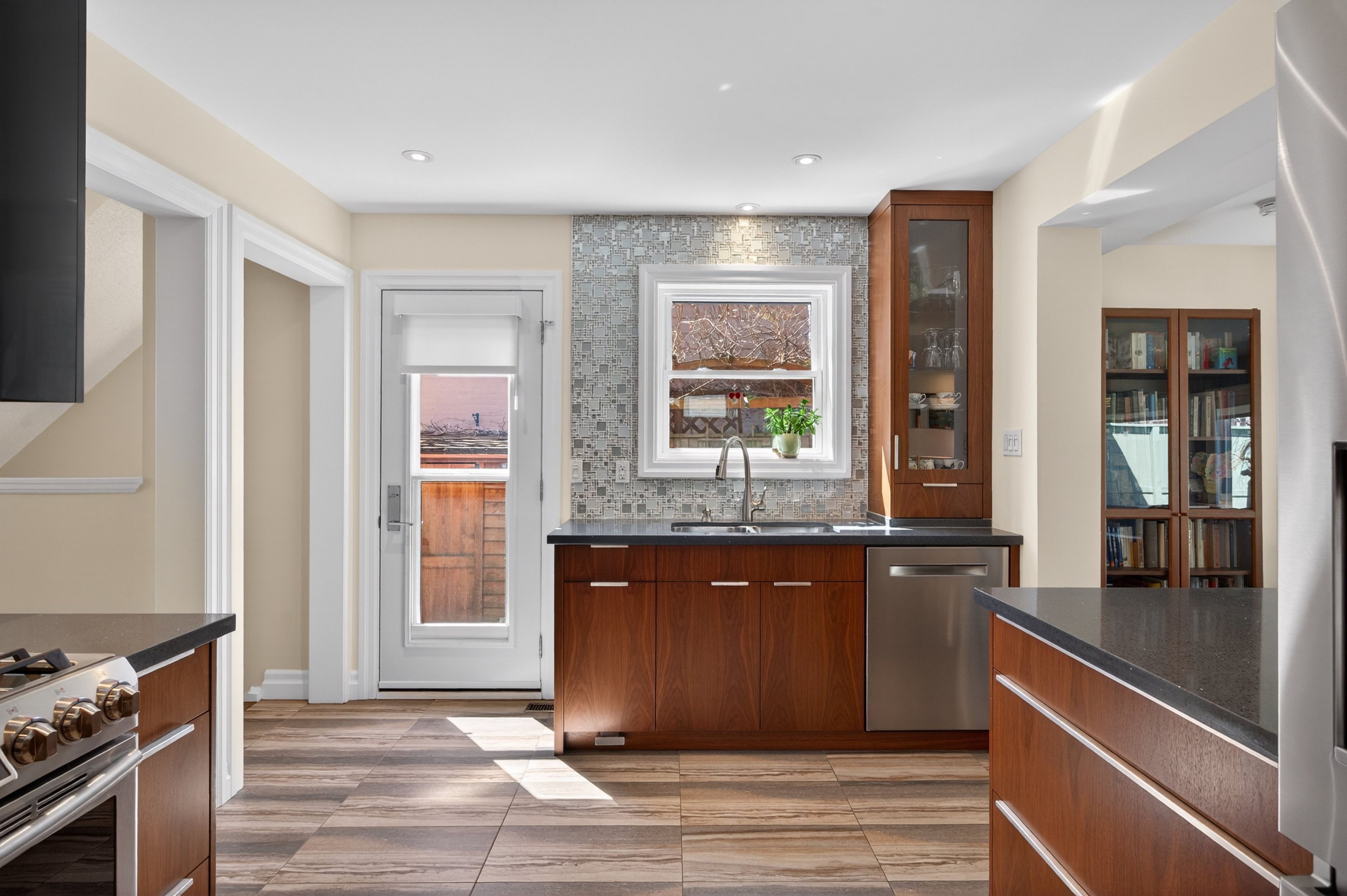 • Custom kitchen with stainless steel appliances and quartz counters.