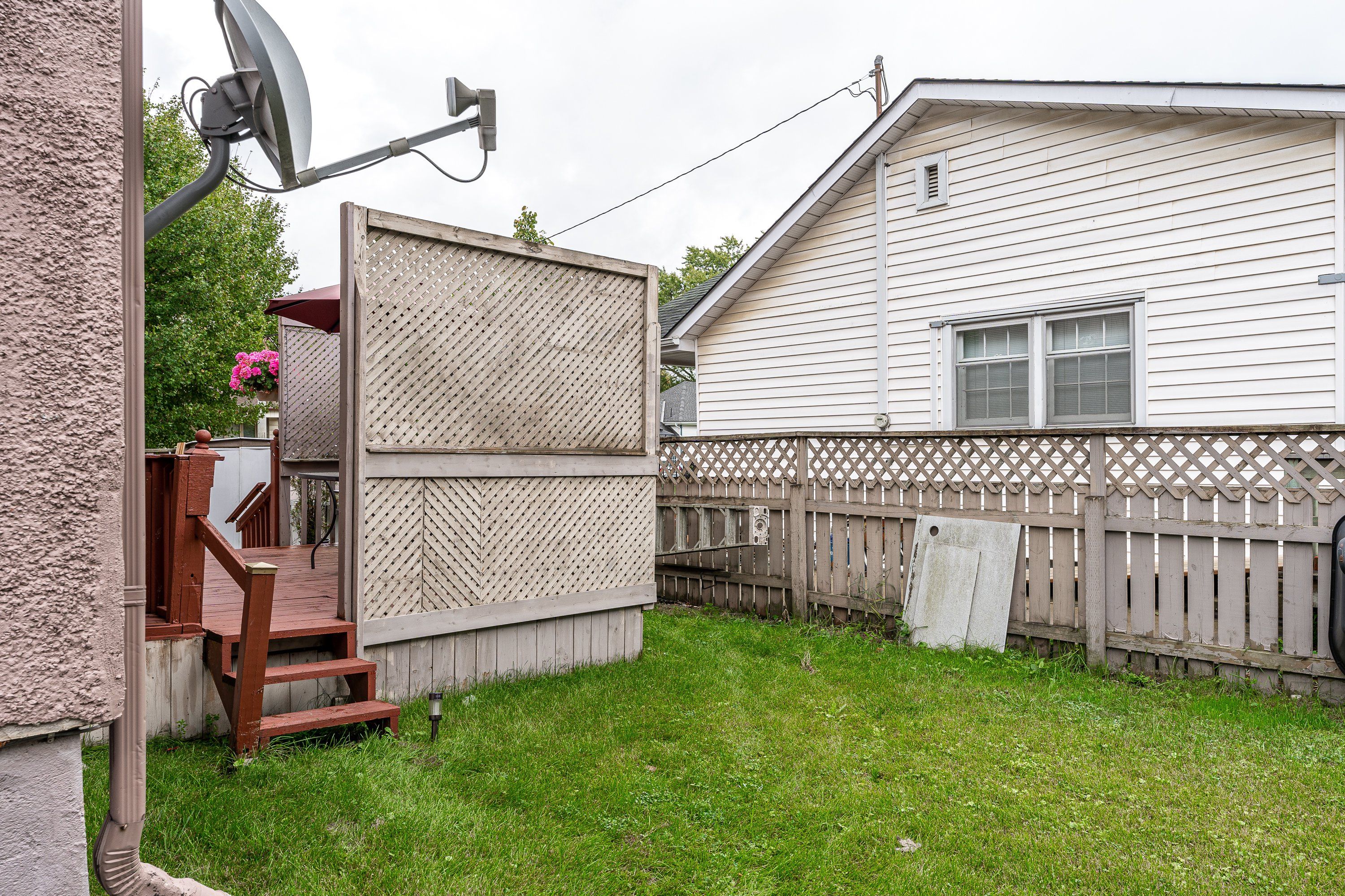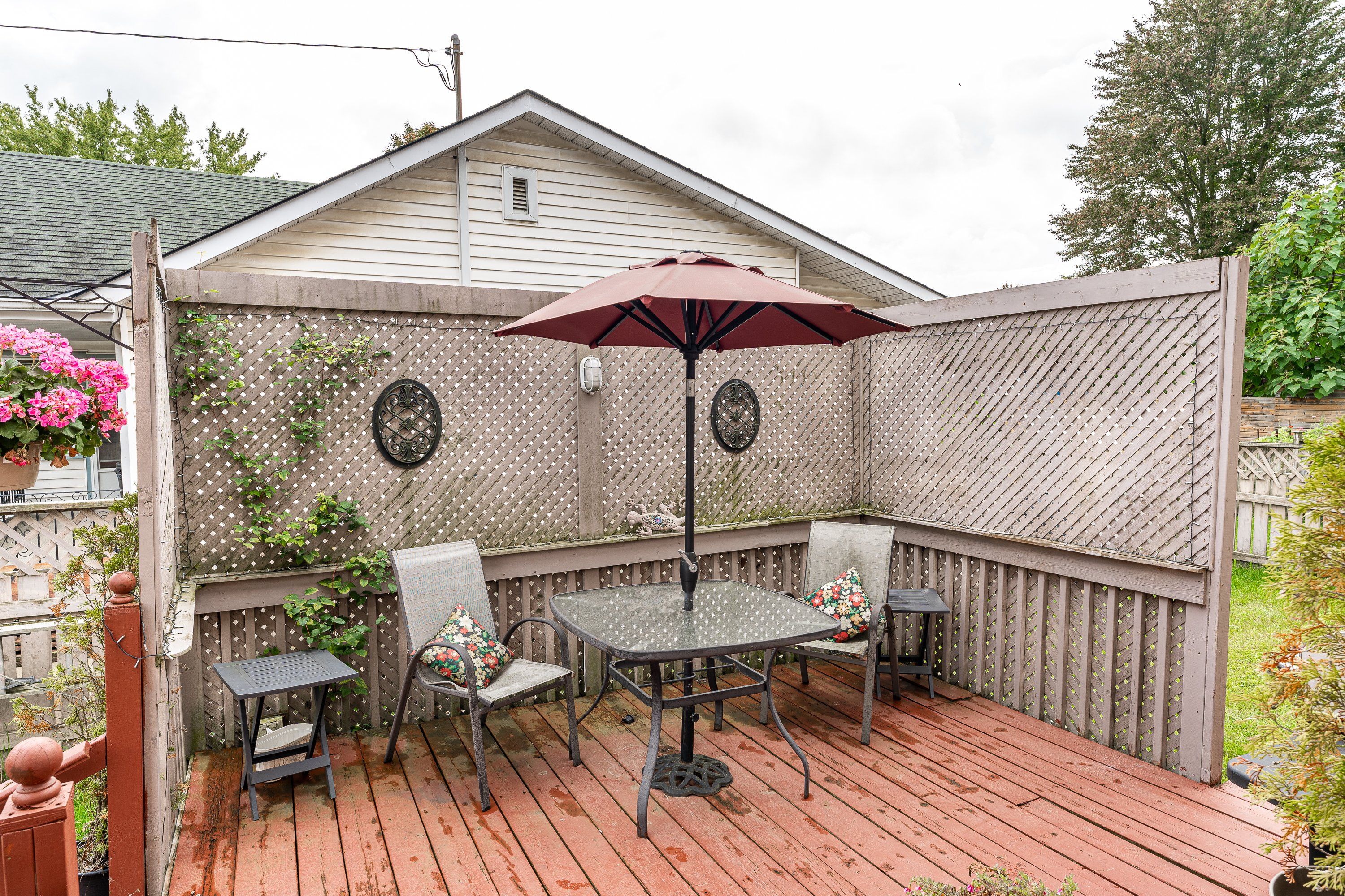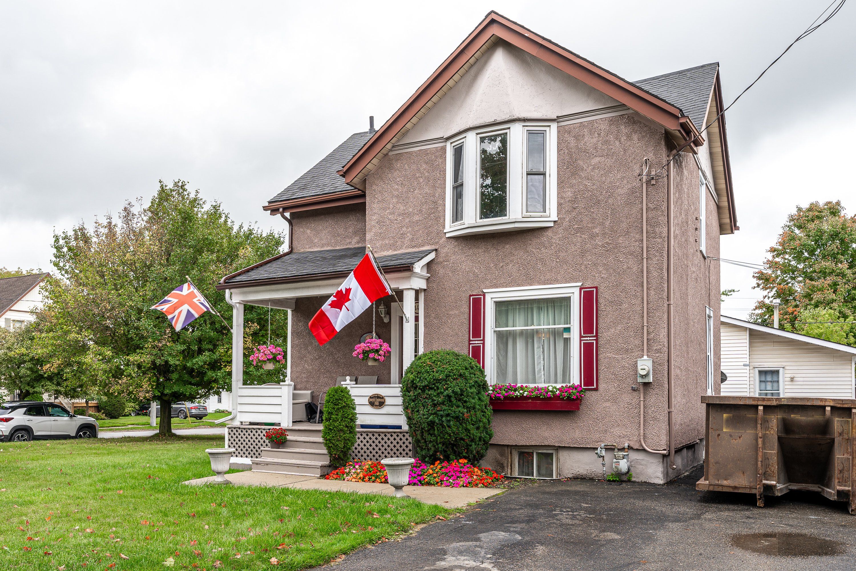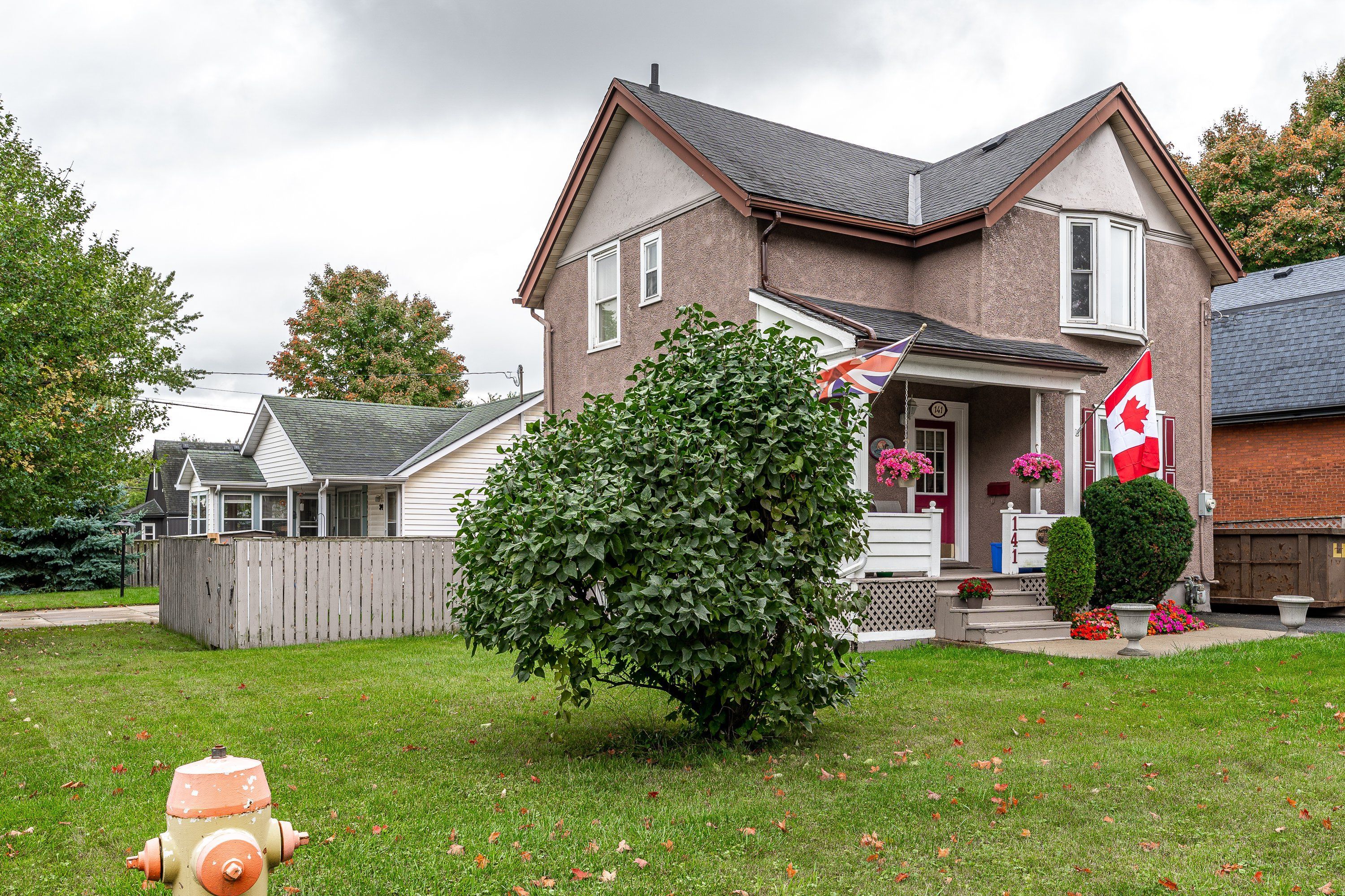 Grab your golf bag and stroll to the municipal golf course. Set up a road hockey game on the quiet street. This solid 3 bedroom home is a must see. Enjoy bbq on the deck off of the kitchen with ceramic tile leading to gracious living room dining room with cozy wood surface and high ceilings. Upstairs 3 bedrooms with 4 piece bath. Large paved driveway with room for 4 cars or 2 cars and rv with external power outlets. New roof in 2017 decorative shutters and flower box at front window, beside dining room table, newer windows and hardwood floors, private fenced in area behind and beside house with concrete patio furniture with a 12 x 15 pad. Entry to deck from sliding patio doors from kitchen. Safe and enclosed for small children or pets. Full security privacy screening, perfect for barbecue area and future hot tub. Front entry has a poured concrete sidewalk with floral urns for spring autumn flowers. Oak hanover custom kitchen with oak chair rail, updated and extended in 2015 with new countertop and island with seating, plus pantry with storage, features double patio door includes five stainless steel appliances fridge, stove, range hood, dishwasher and microwave lower level has fully finished family room, ruud high efficiency furnace, 100 amp service 2 baths. This house with bronze plaque, first occupied by joseph eastwood a ww1 vet, who worked at the grand trunk railway and managed the greenhouse there. Nice family home!