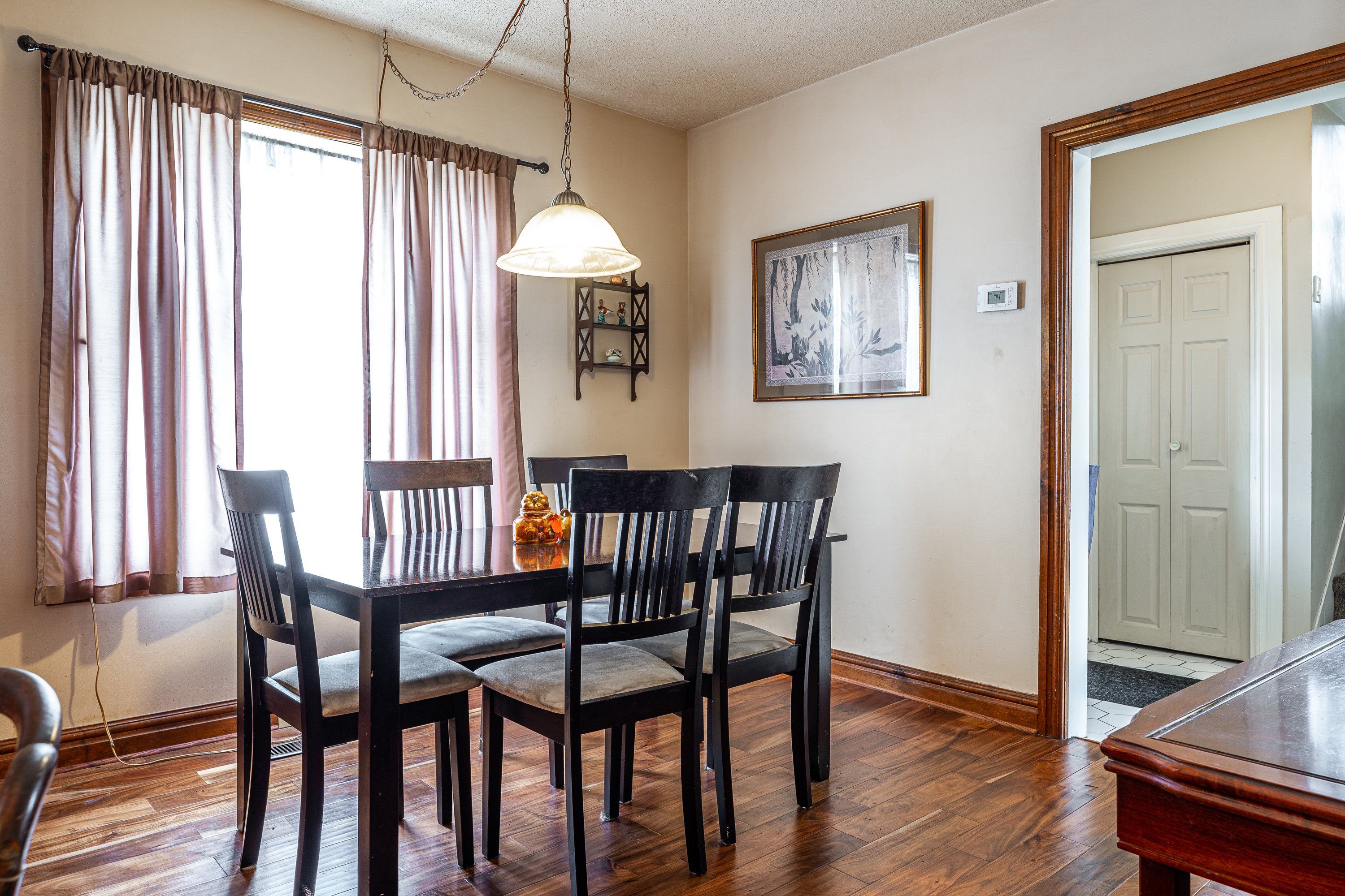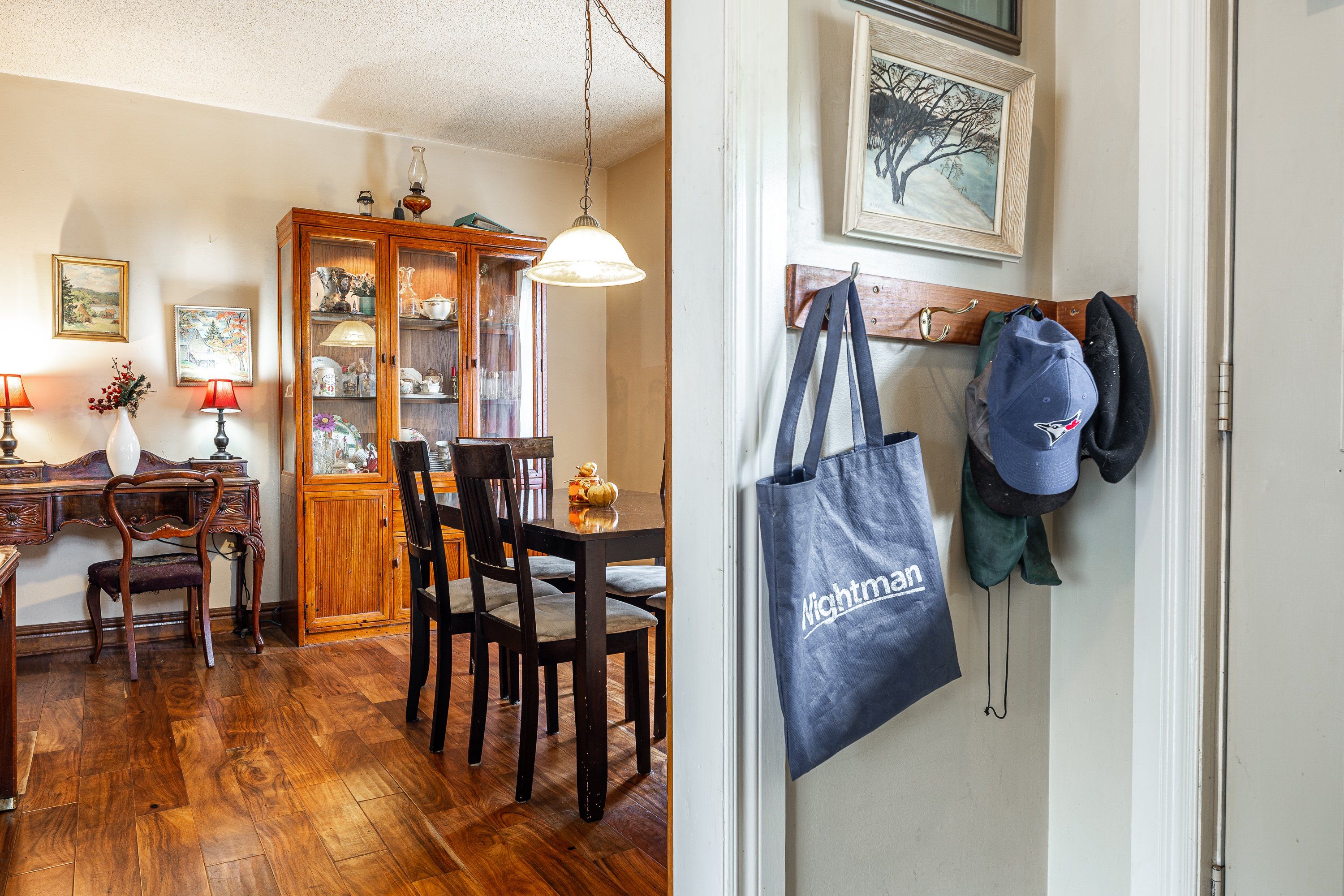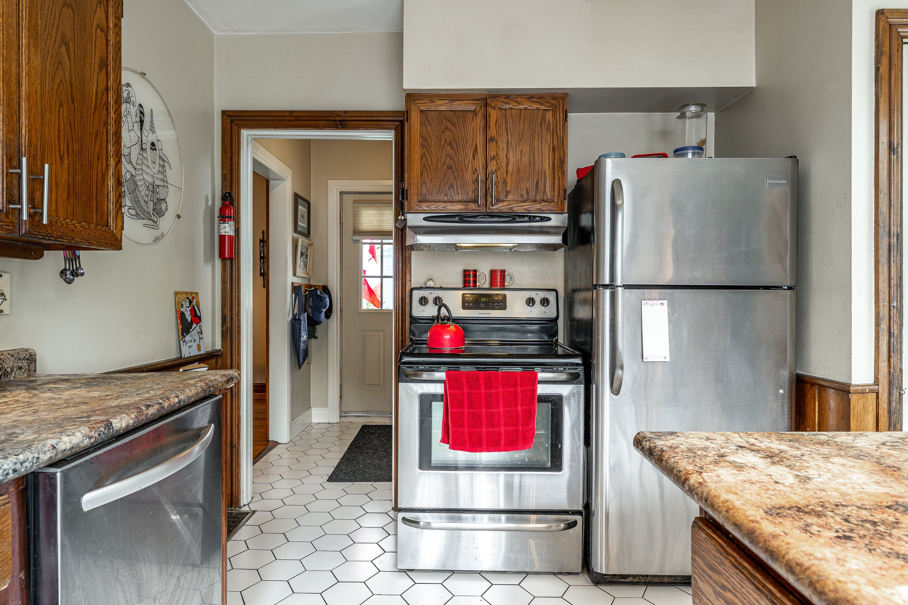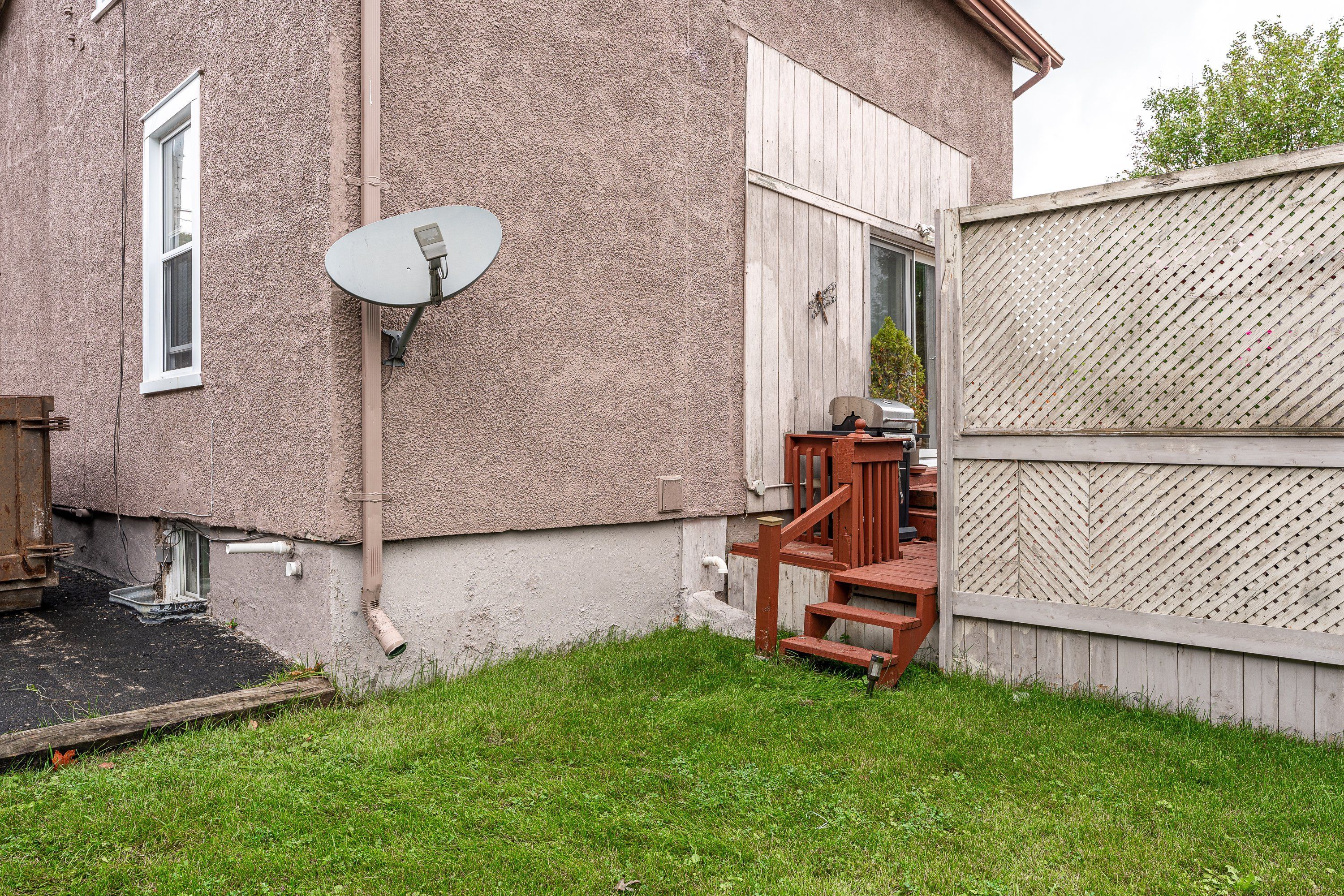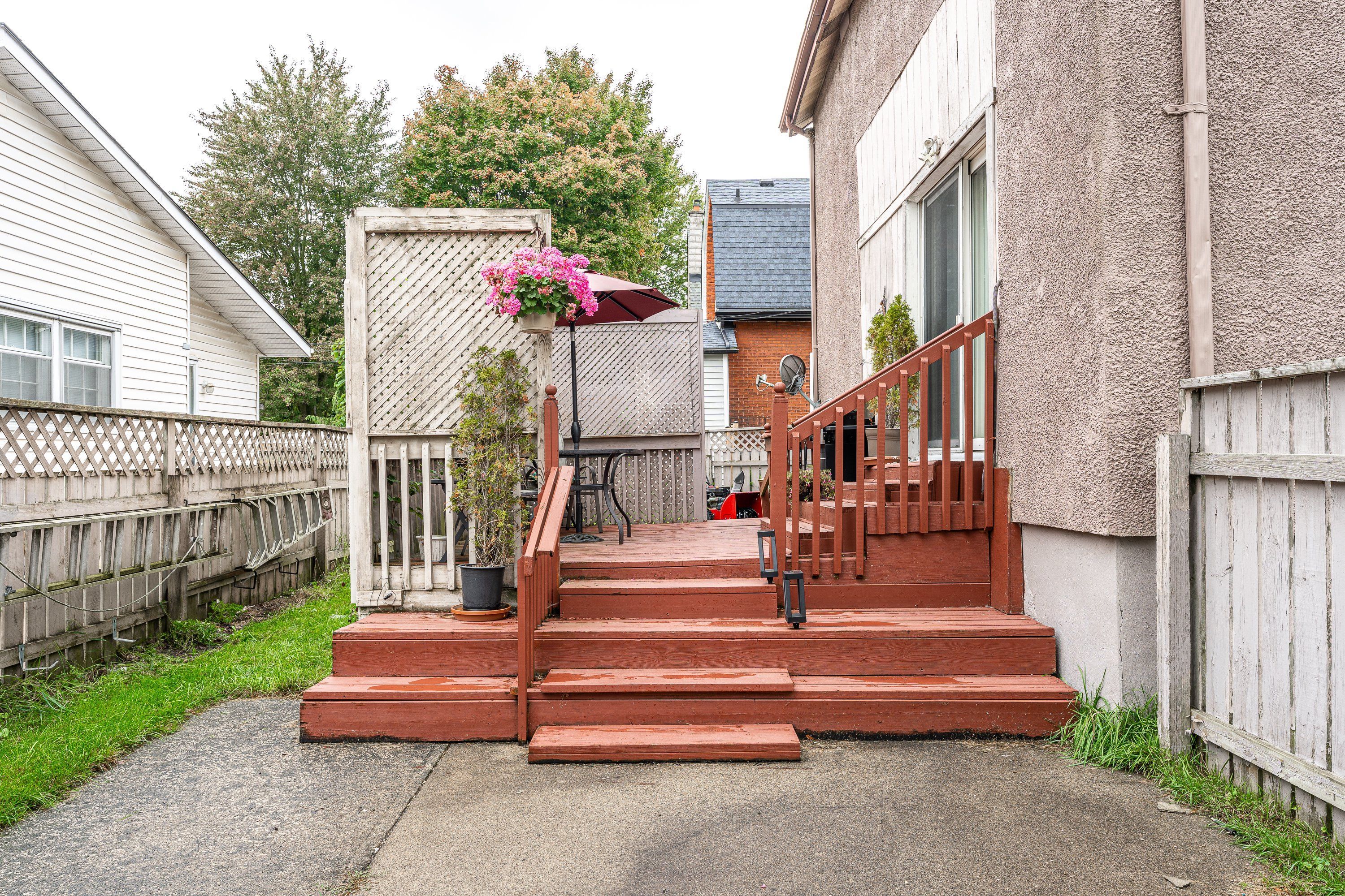 Grab your golf bag and stroll to the municipal golf course. Set up a road hockey game on the quiet street. This solid 3 bedroom home is a must see. Enjoy bbq on the deck off of the kitchen with ceramic tile leading to gracious living room dining room with cozy wood surface and high ceilings. Upstairs 3 bedrooms with 4 piece bath. Large paved driveway with room for 4 cars or 2 cars and rv with external power outlets. New roof in 2017 decorative shutters and flower box at front window, beside dining room table, newer windows and hardwood floors, private fenced in area behind and beside house with concrete patio furniture with a 12 x 15 pad. Entry to deck from sliding patio doors from kitchen. Safe and enclosed for small children or pets. Full security privacy screening, perfect for barbecue area and future hot tub. Front entry has a poured concrete sidewalk with floral urns for spring autumn flowers. Oak hanover custom kitchen with oak chair rail, updated and extended in 2015 with new countertop and island with seating, plus pantry with storage, features double patio door includes five stainless steel appliances fridge, stove, range hood, dishwasher and microwave lower level has fully finished family room, ruud high efficiency furnace, 100 amp service 2 baths. This house with bronze plaque, first occupied by joseph eastwood a ww1 vet, who worked at the grand trunk railway and managed the greenhouse there. Nice family home!