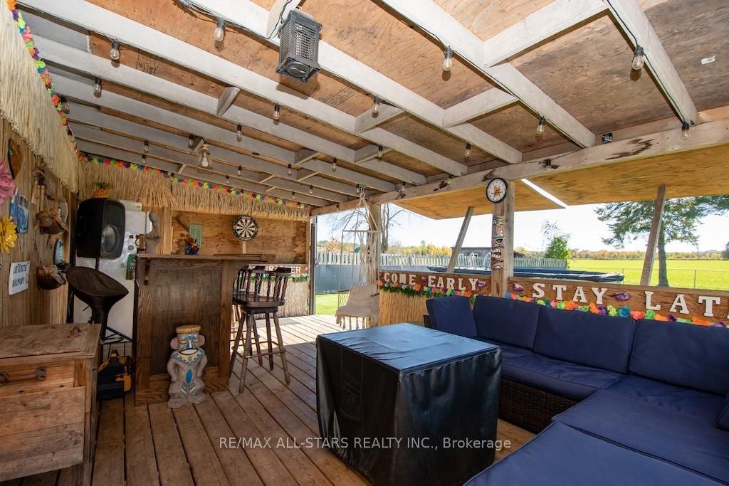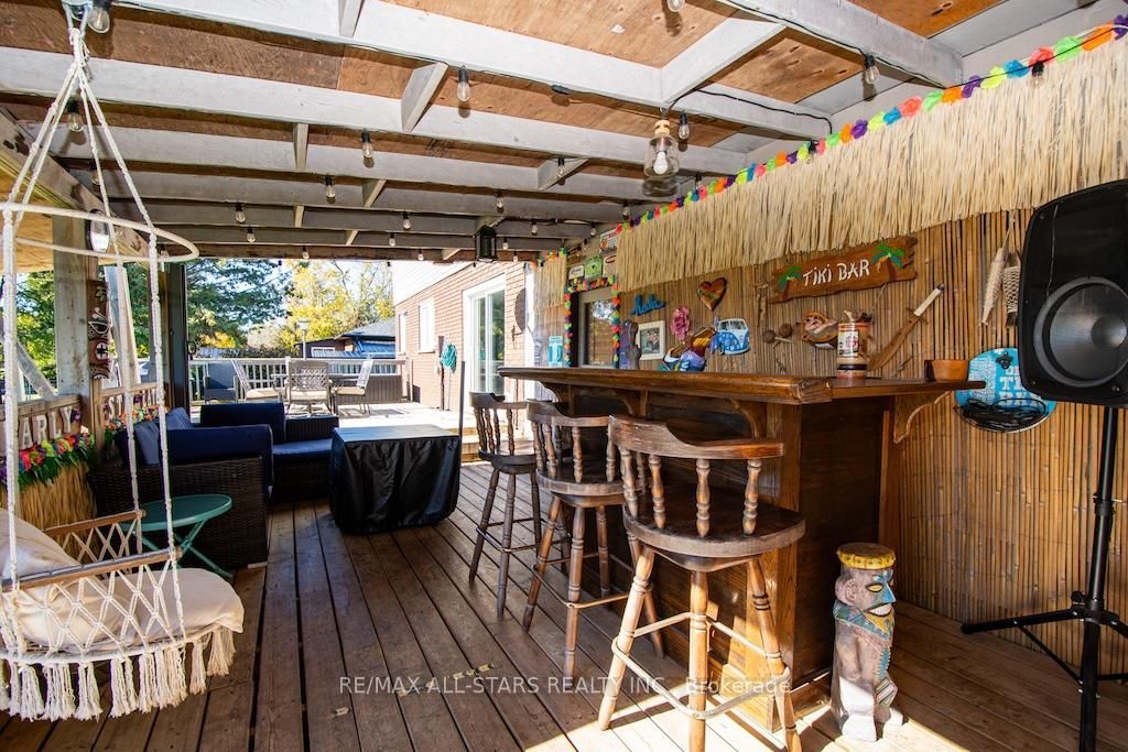 • Backyard features covered porch, bar, fire pit, and above-ground pool.