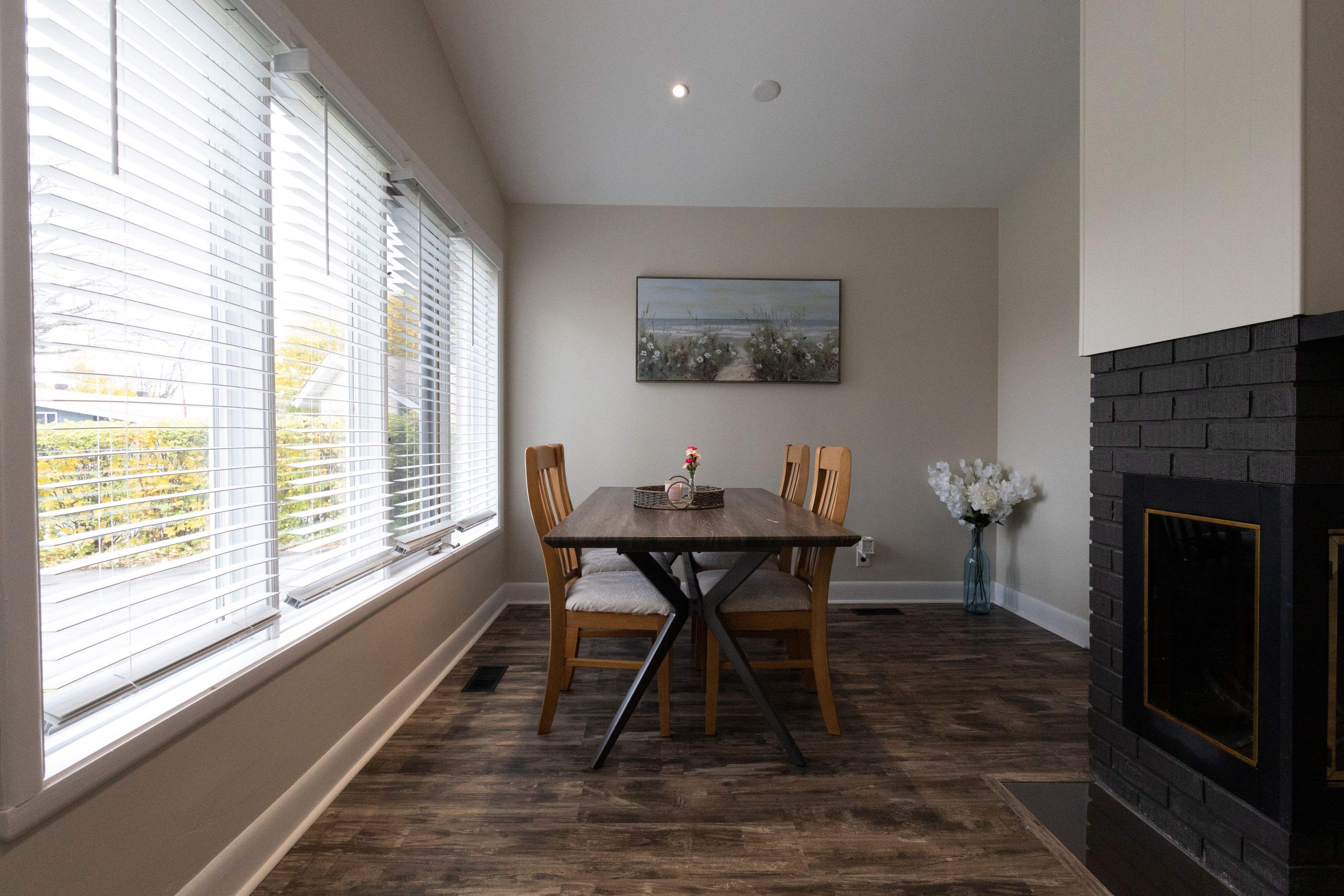 • Bright, spacious living and dining areas with cathedral ceilings and fireplace.