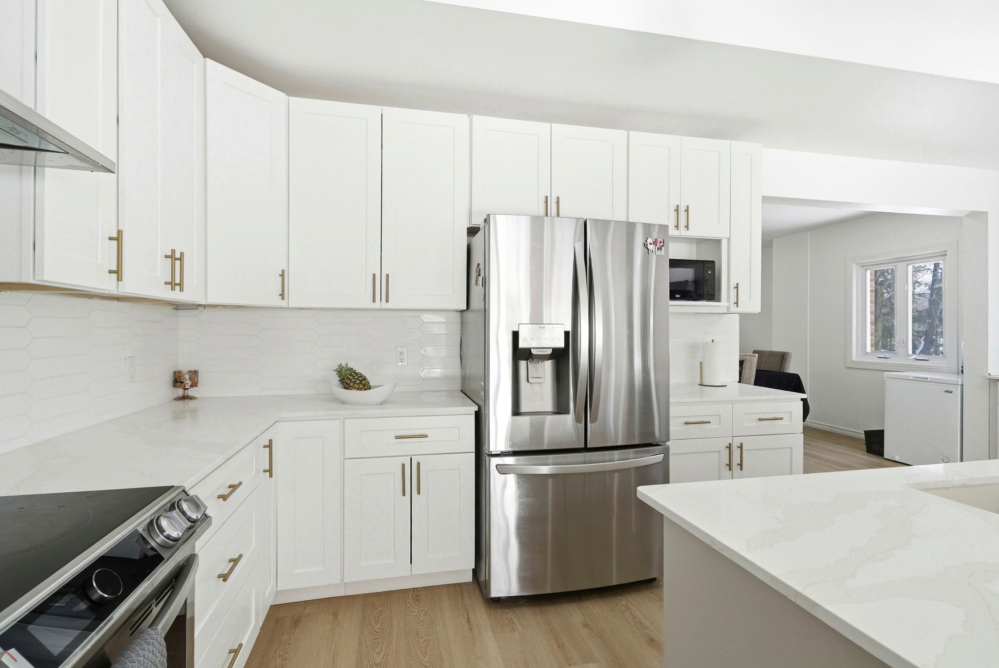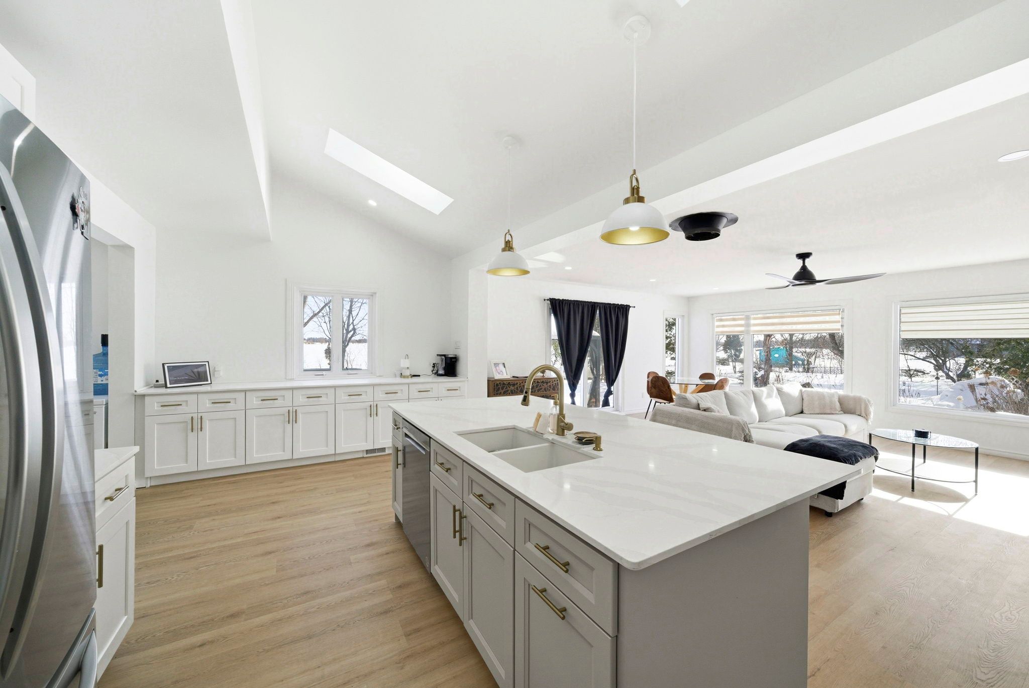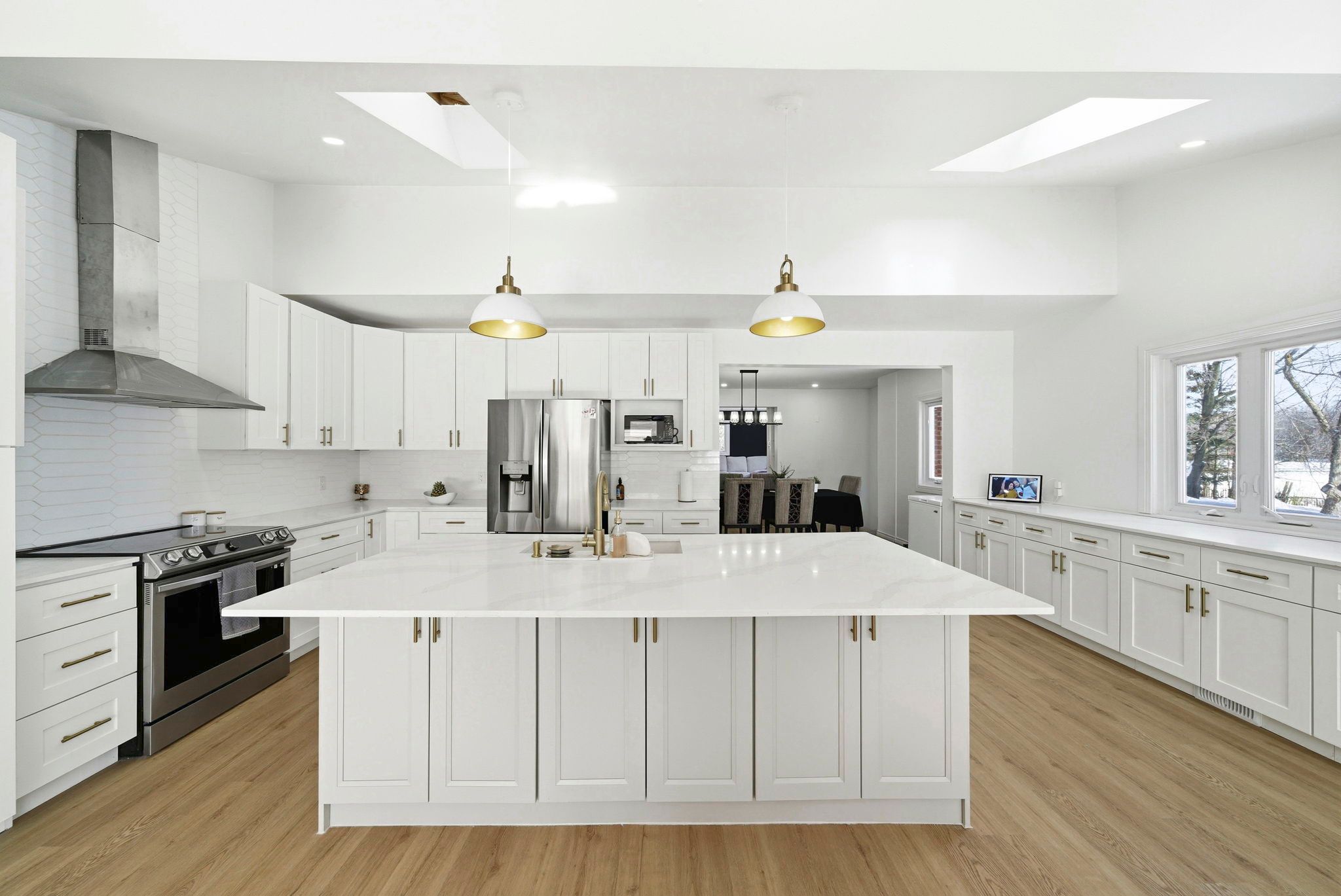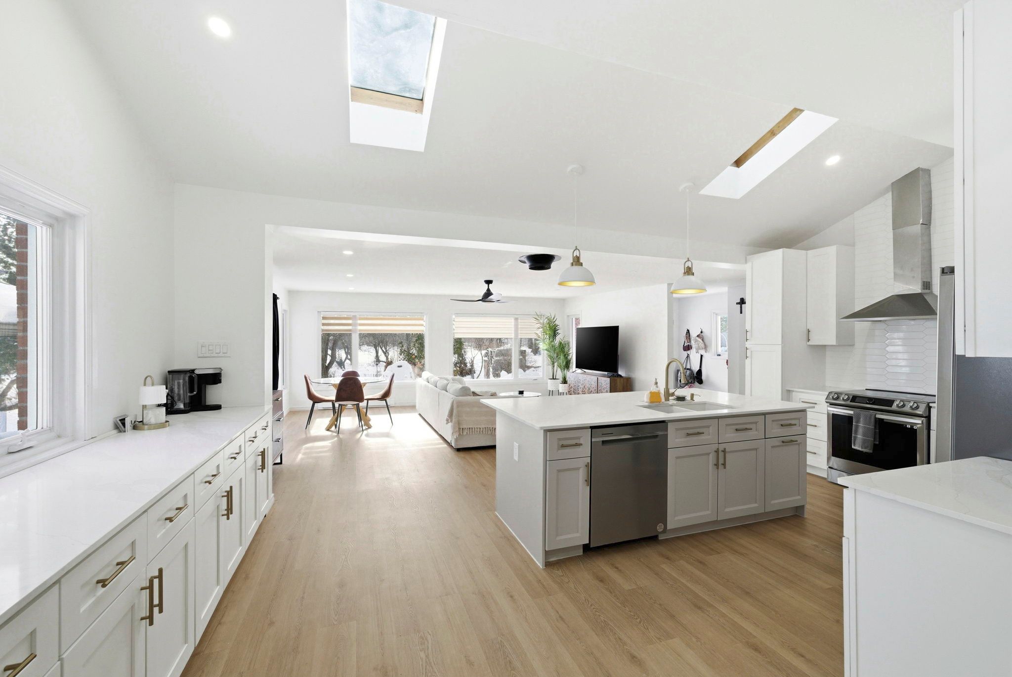 • Brand-new kitchen with quartz island, stainless steel appliances, and skylights.