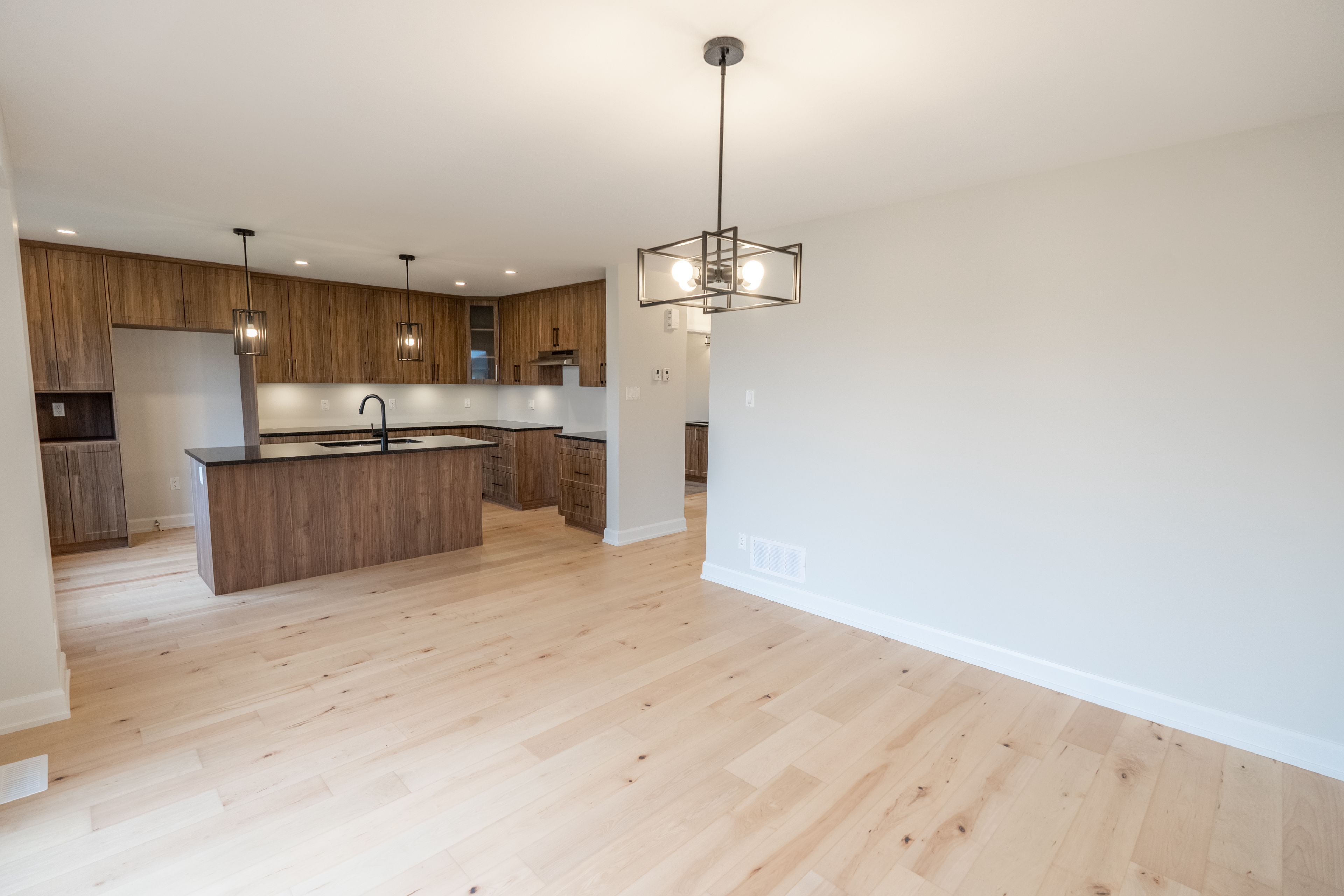 • Spacious open concept dining and kitchen area with a breakfast counter.