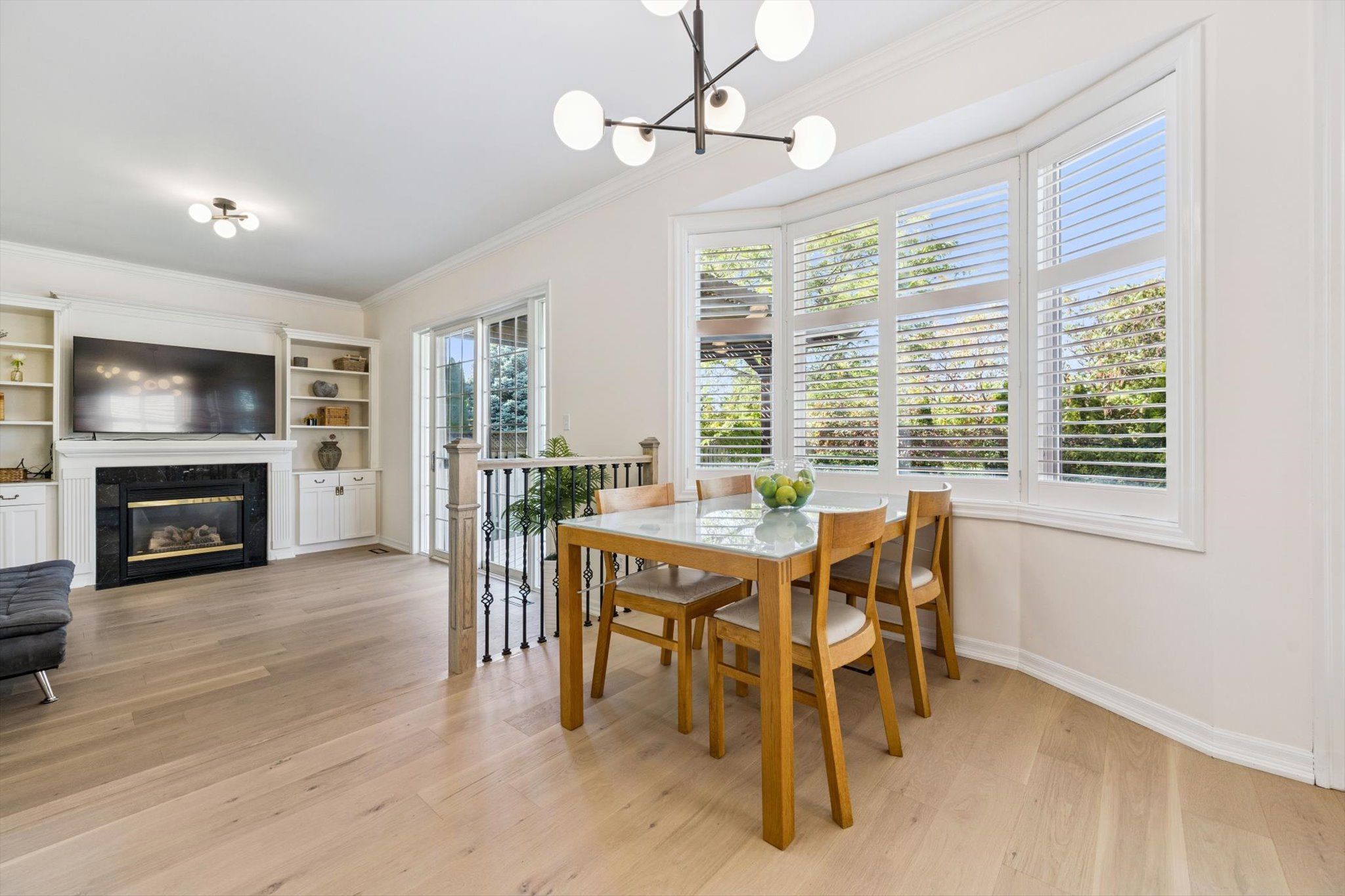 • Bright family room with gas fireplace and custom built-ins for comfort.