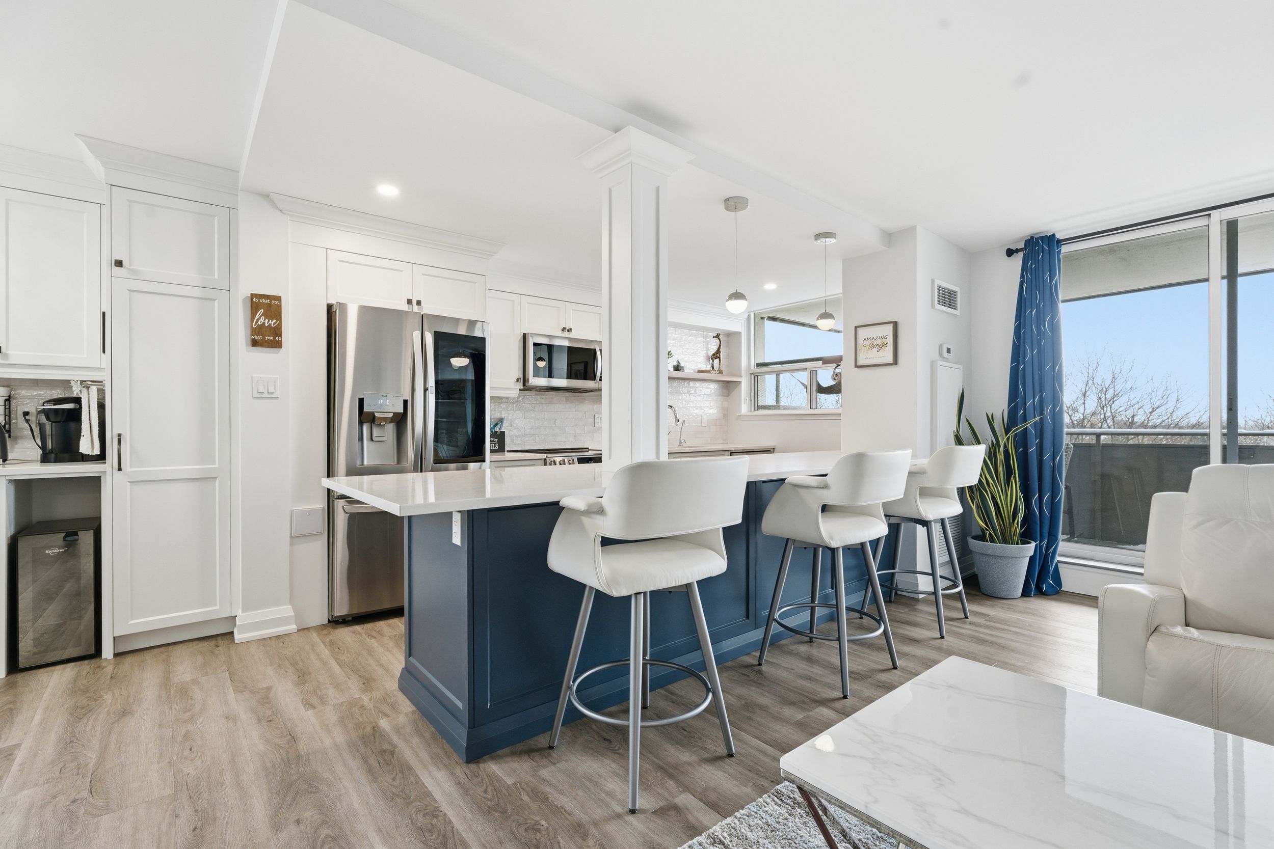 Unbelievable value with condo fees that include heat, hydro, water, gas, cable, internet, and full building maintenance! Then there's the indoor pool, gym, library, two woodworking shops, three bicycle rooms, car wash, underground parking, and a vibrant community that hosts euchre, bridge, christmas dinners, and more. A convenience store is located directly across the street. This stunning suite has been extensively renovated with a complete $125,000 renovation in 2022 and is truly move in ready. The custom high-end kitchen is stunning, featuring high end multi-tone cabinetry, quartz countertops, deep upgraded sink and faucet with bar seating, lg appliances, and a dedicated coffee/tea/alcohol barista bar. Both bathrooms have been beautifully updated with high end vanities, finishes and an oversized shower. Gorgeous flooring throughout includes an upgraded noise reduction underlay for added comfort. A gorgeous home office has been built in, complete with matching cabinetry and a built-in desk that complements the kitchen perfectly. And there is still room to put in a table when needed. Both bedrooms are generously sized, with the primary bedroom offering a walk-in closet and a 2 pc ensuite both with chandeliers. In suite laundry and an exceptionally handy in-suite storage room add to the functionality of this space. Upgraded light fixtures throughout including the storage room. Oversized balcony facing lake ontario. Gorgeous 20 minute walk to lakeshore blvd. Spacious, modern, and impeccably finished, this suite is located close to downtown, with easy highway access and an abundance of shopping nearby. Ample visitor parking in the rear of the building and clean, well-lit underground parking for the the owner. All appliances are 3 years old.