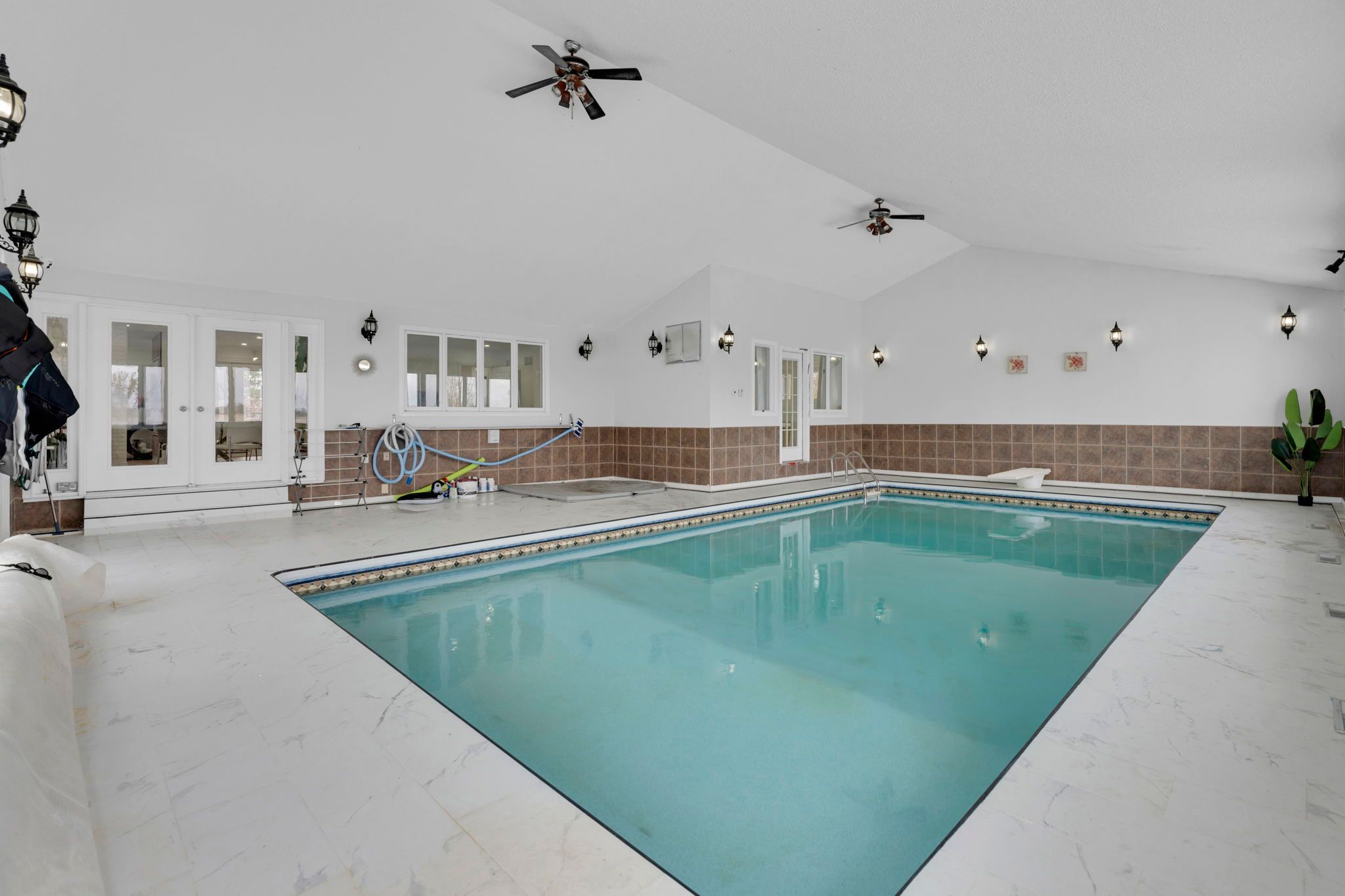 • Indoor heated pool and expansive driveway for ample parking.