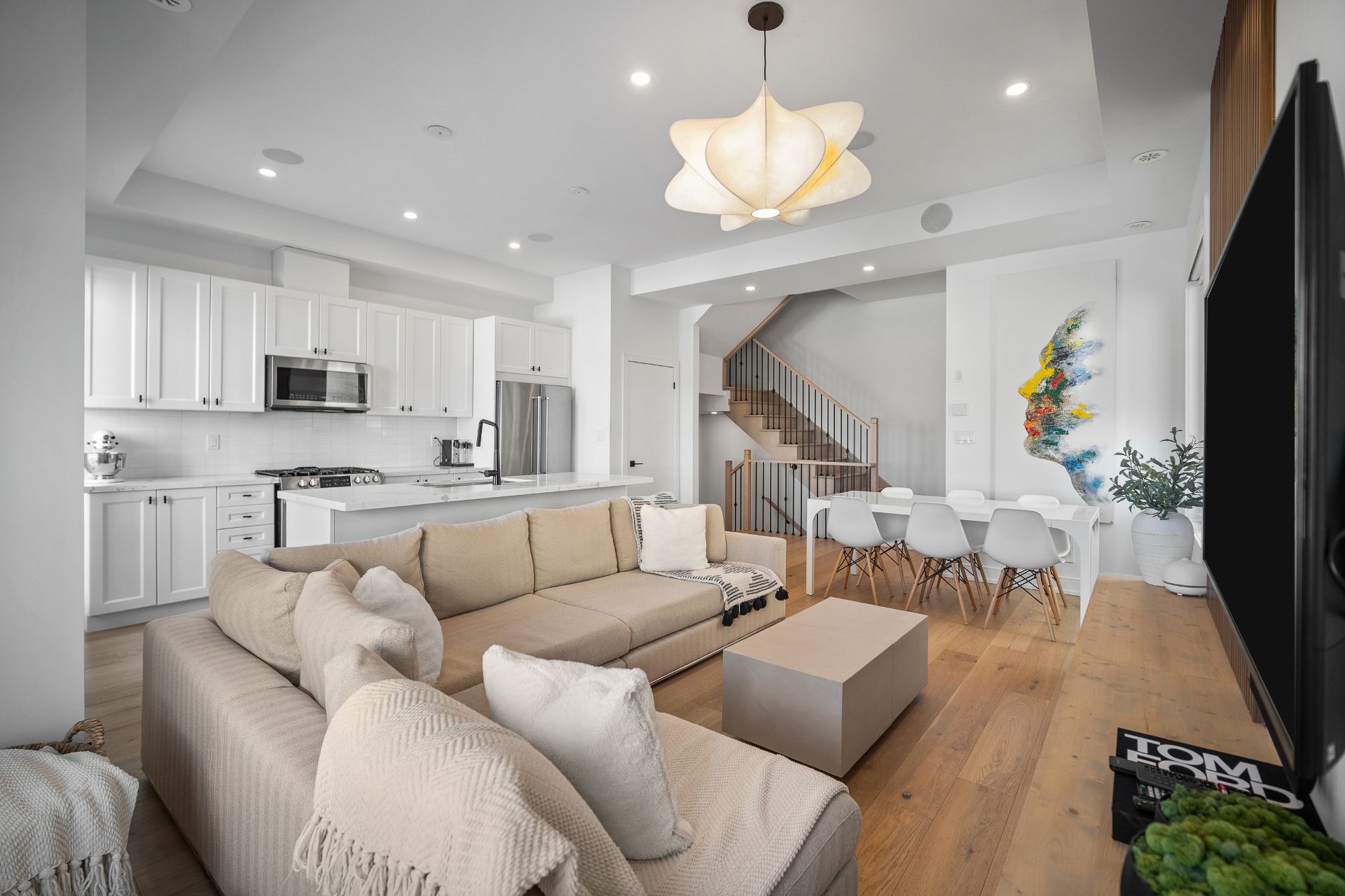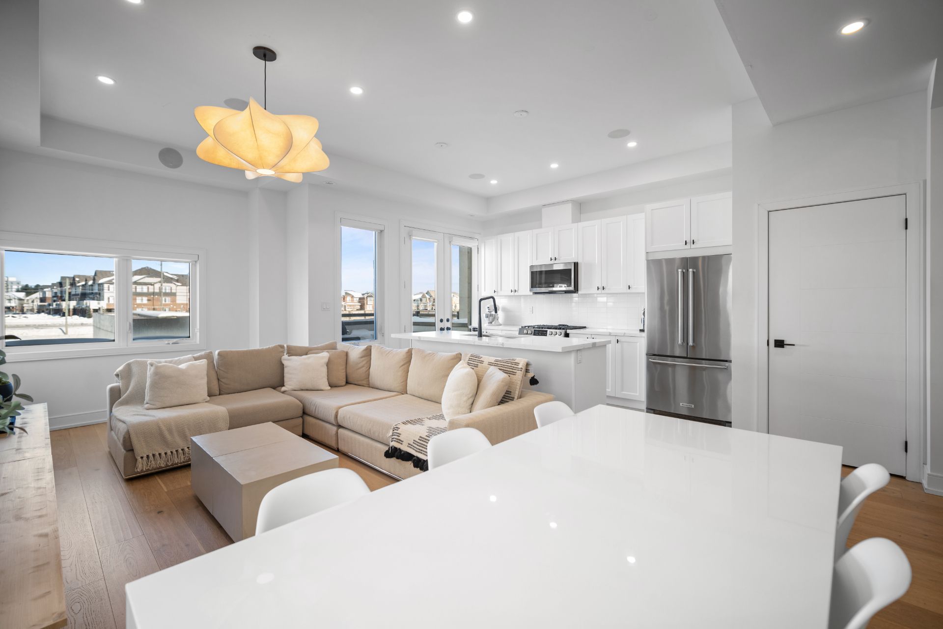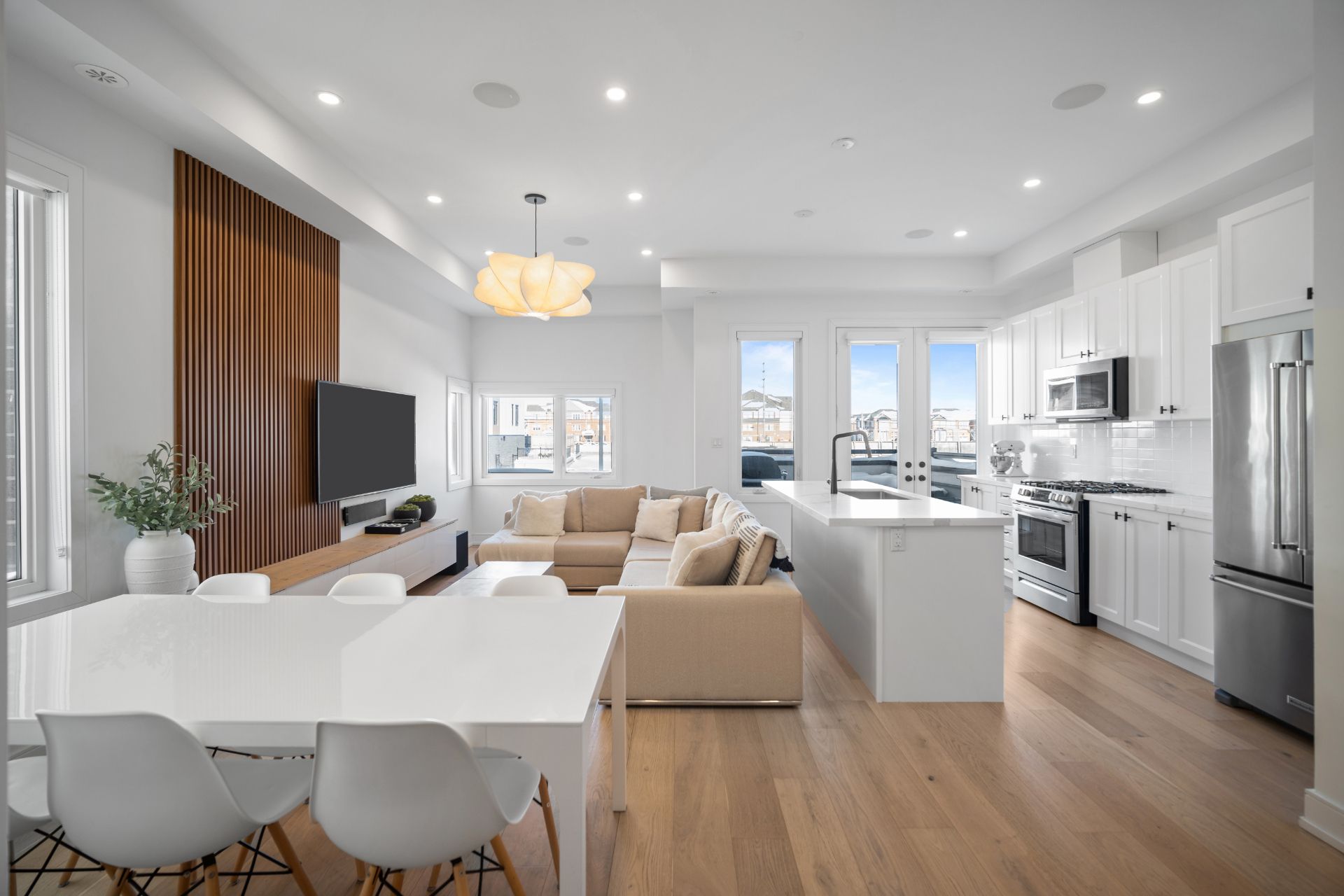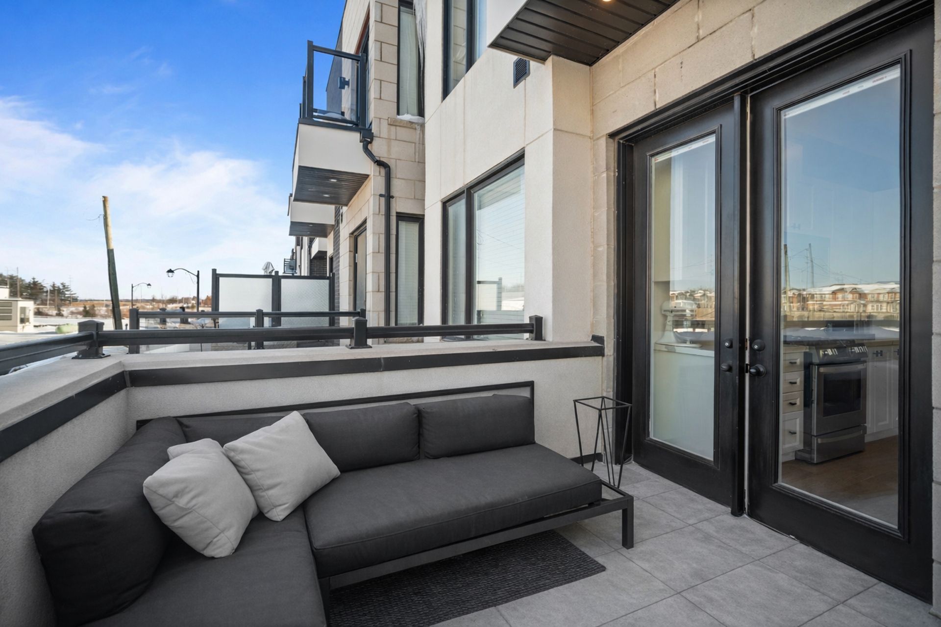 Freehold end-unit townhouse that feels like a 5 star resort as soon as you walk in! This sun-drenched home features wide-plank hardwood flooring throughout and an open-concept layout designed for both comfort and style. Soaring 10-ft ceilings on the main level enhance the sense of space, while thoughtful details include custom built-in closets in every bedroom, main floor built in speakers and designer lighting throughout. This home offers three spacious bedrooms and three well-appointed bathrooms. Enjoy seamless indoor-outdoor living with a large private balcony, complete with a gas line for summer bbqs and entertaining. A truly move-in-ready residence that blends simplicity, function, and beauty in one exceptional package.