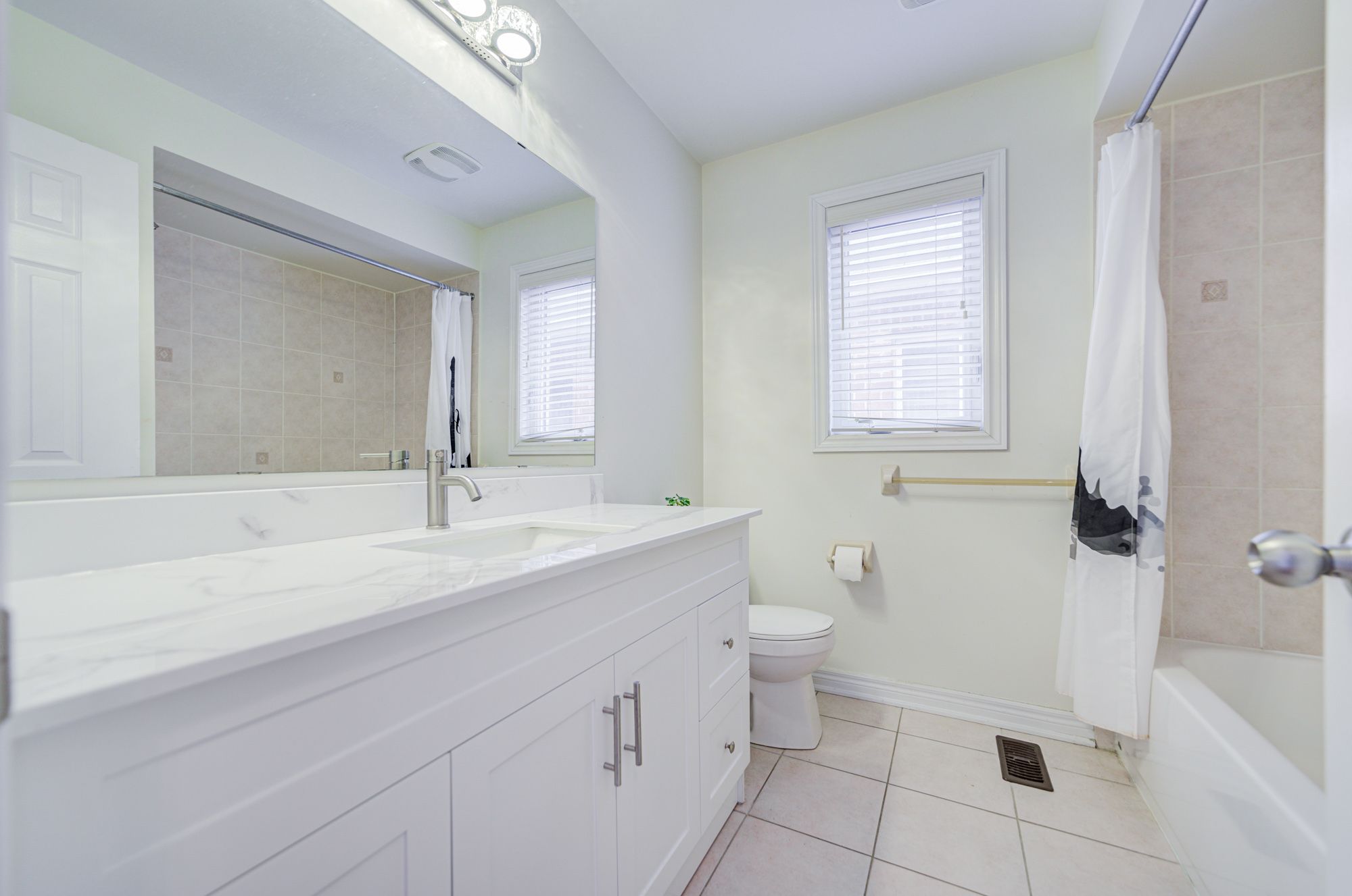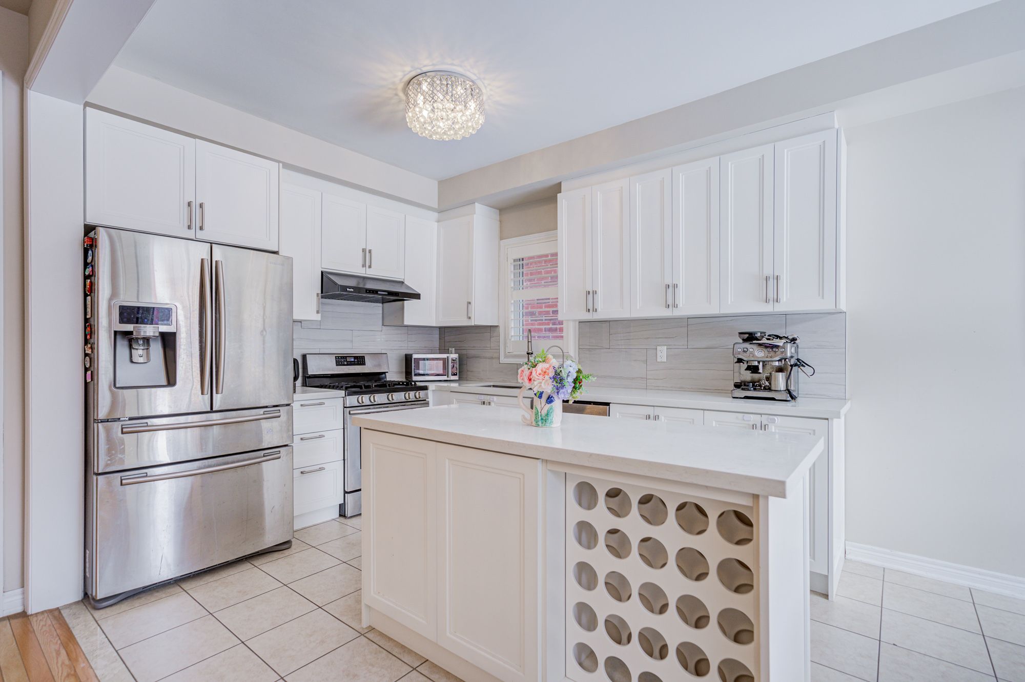 • Renovated kitchen features modern cabinets, quartz countertops and an island.