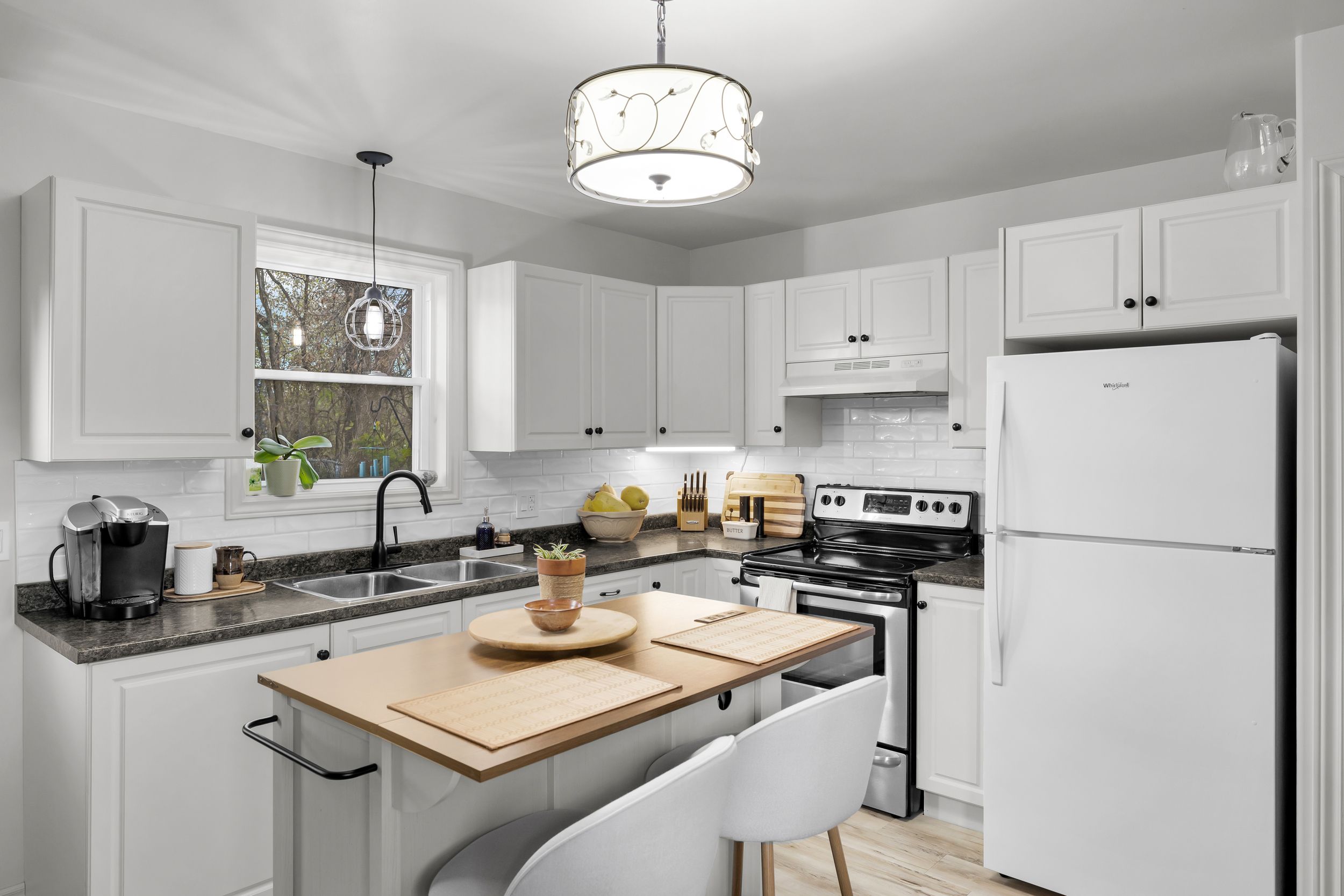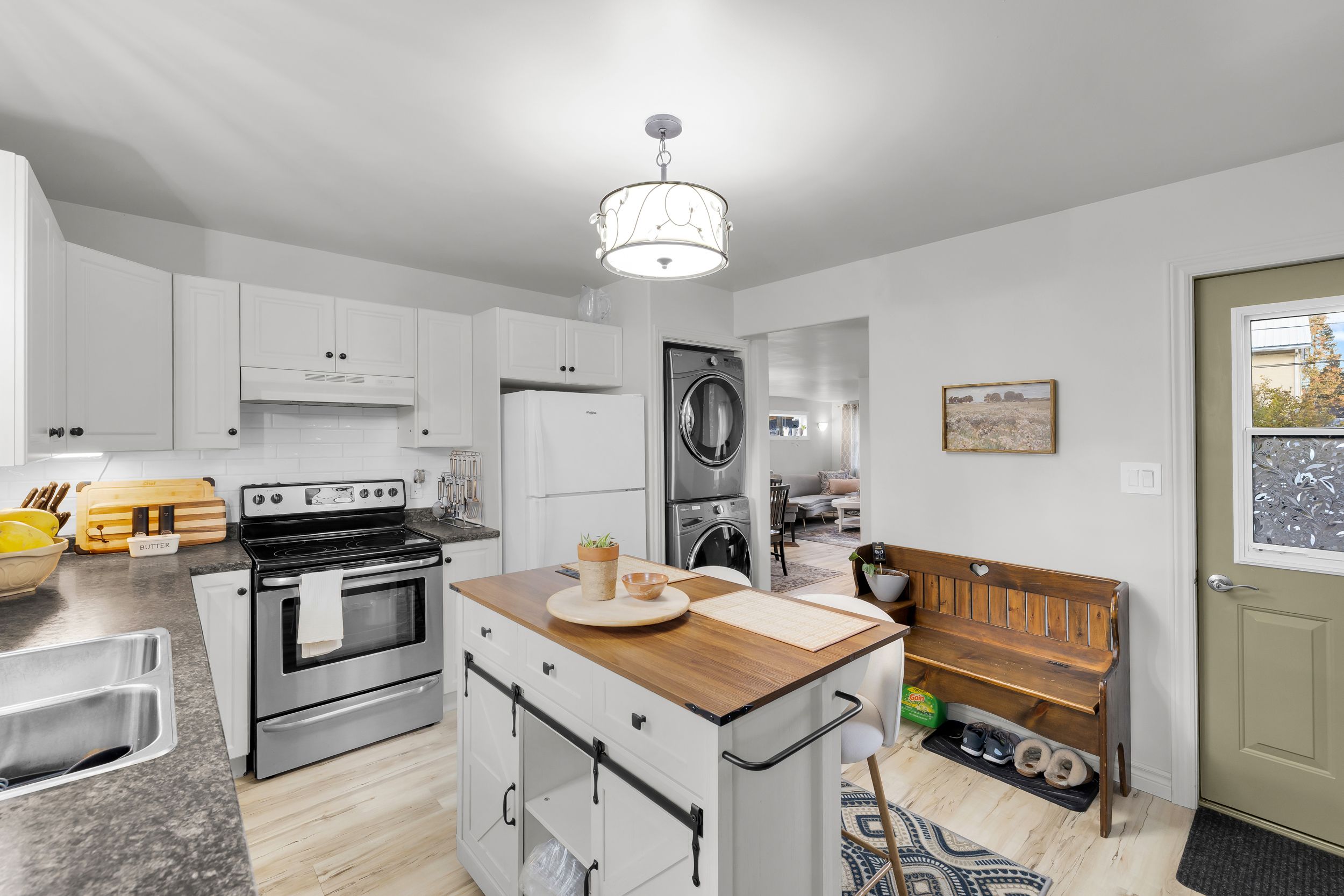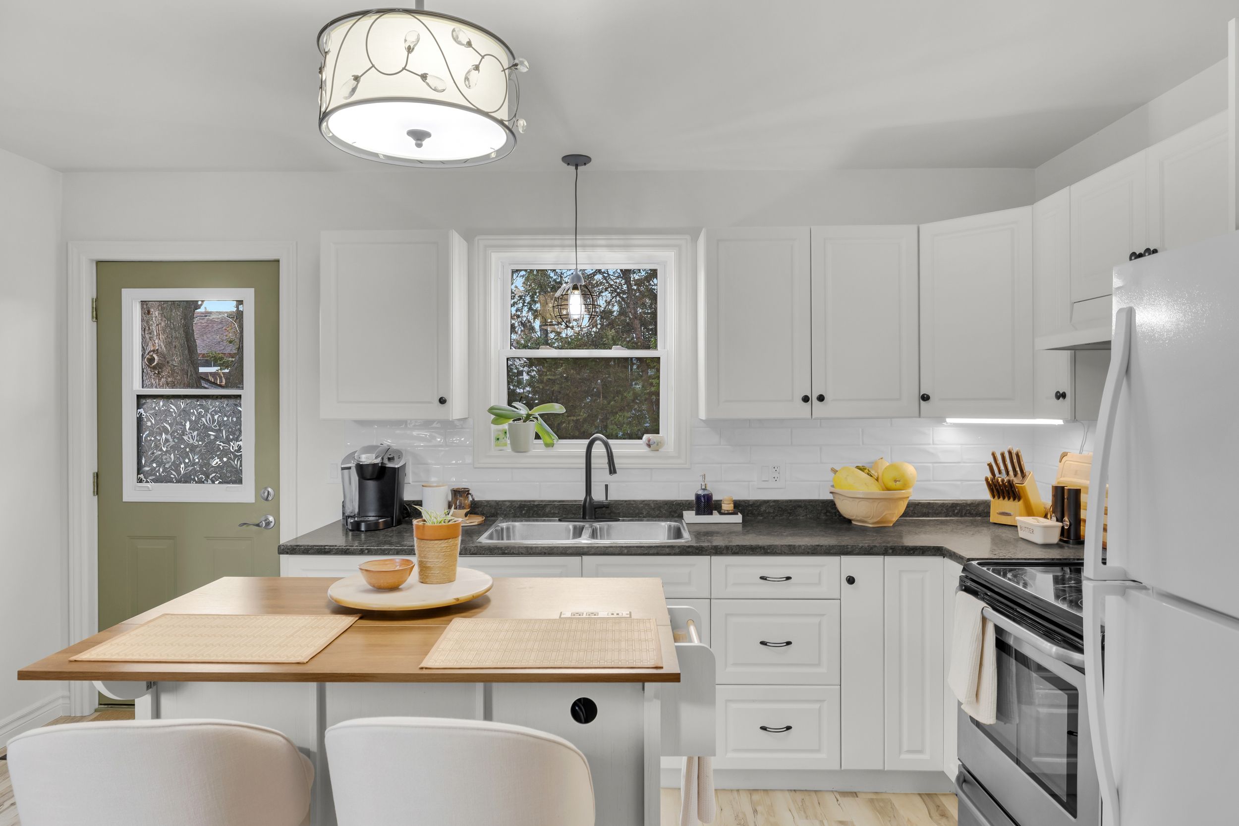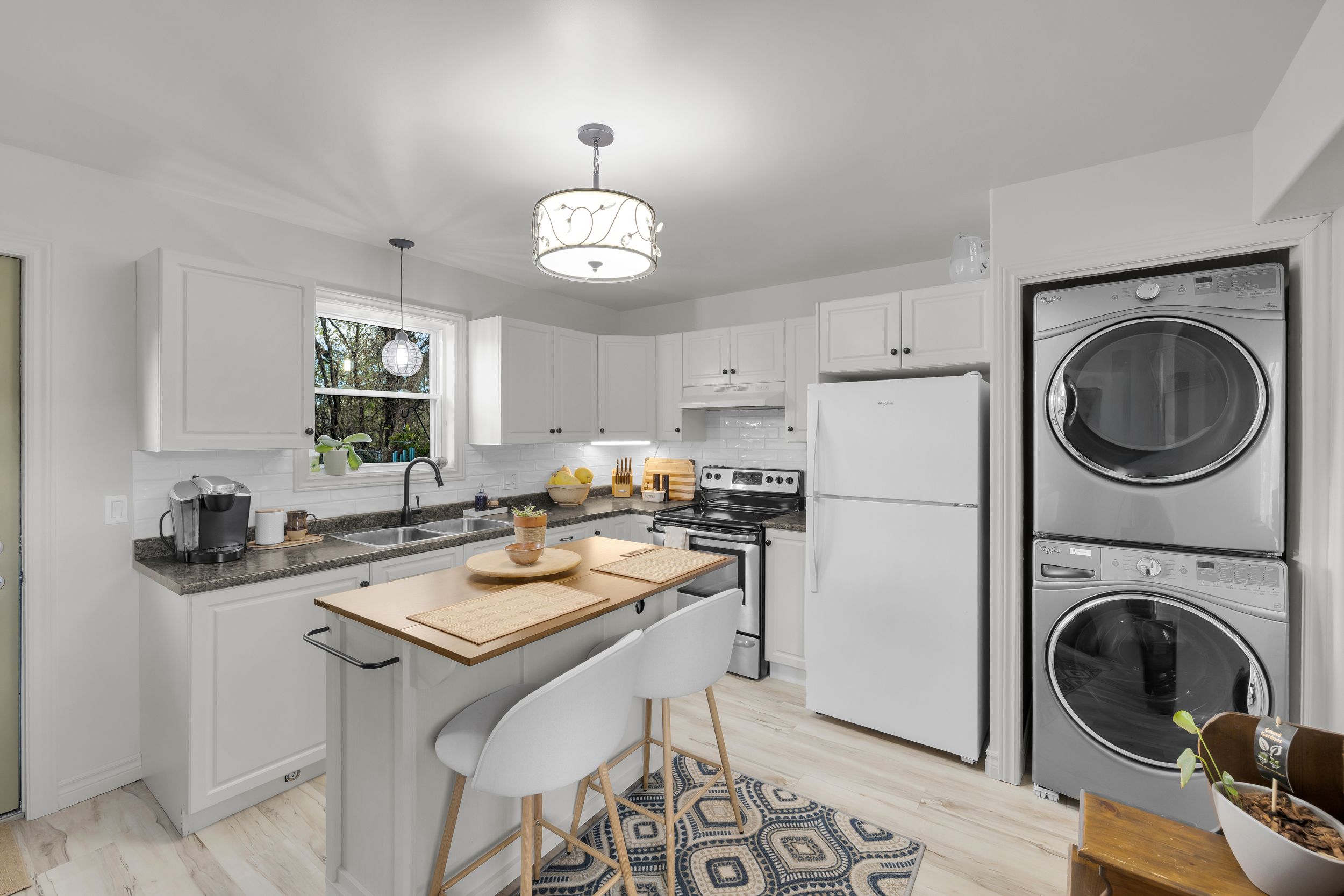 • Stylish kitchen with clean finishes and open dining/living space.