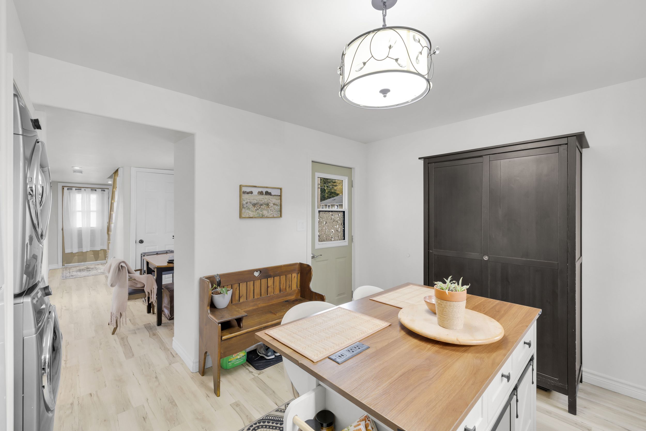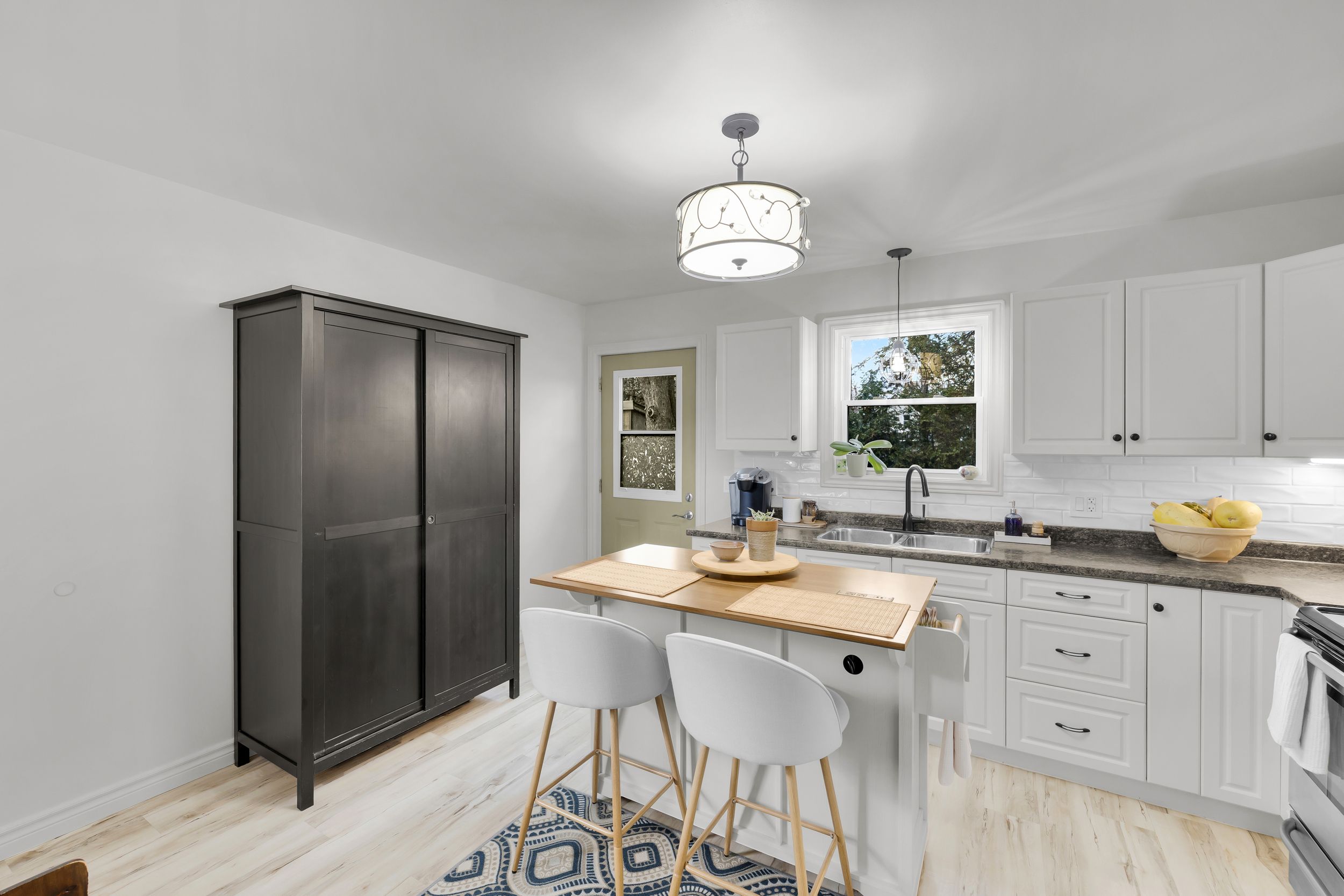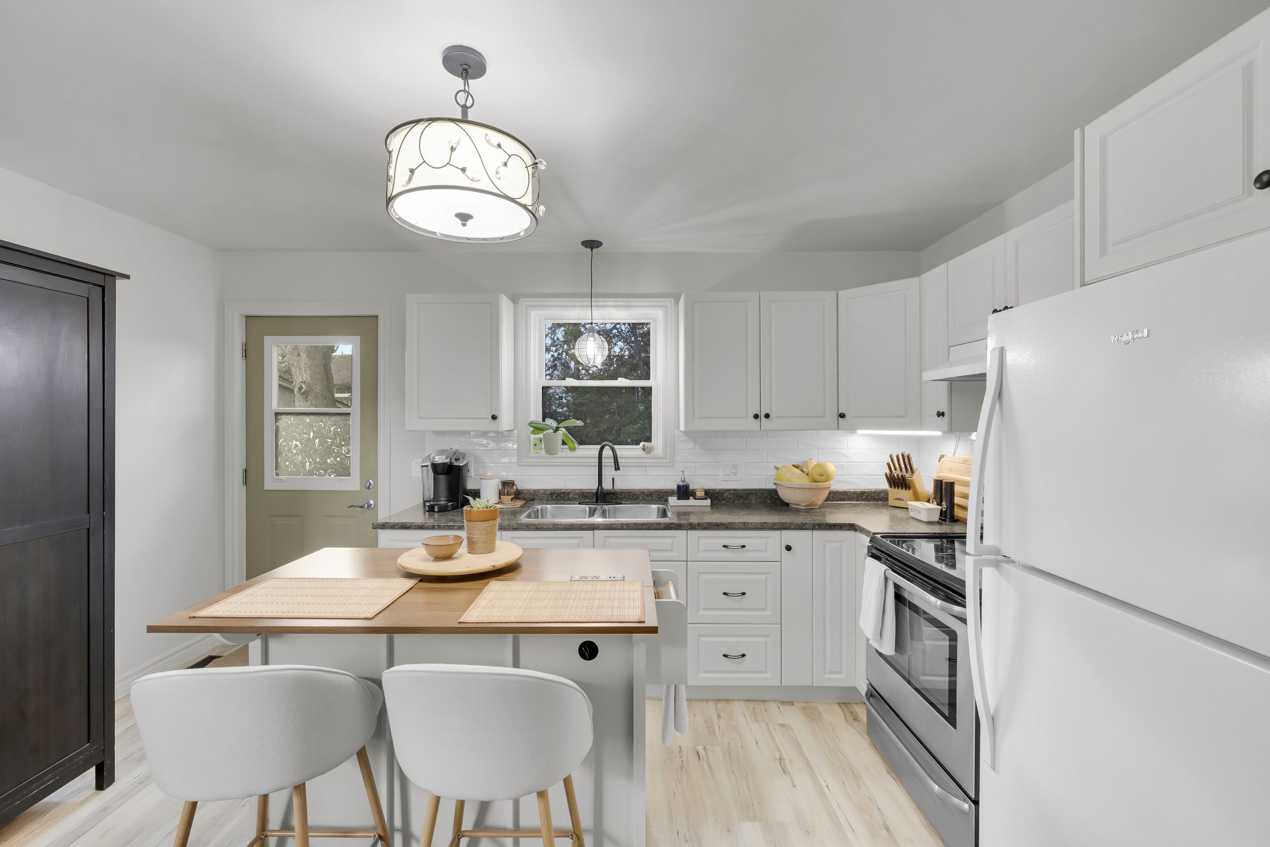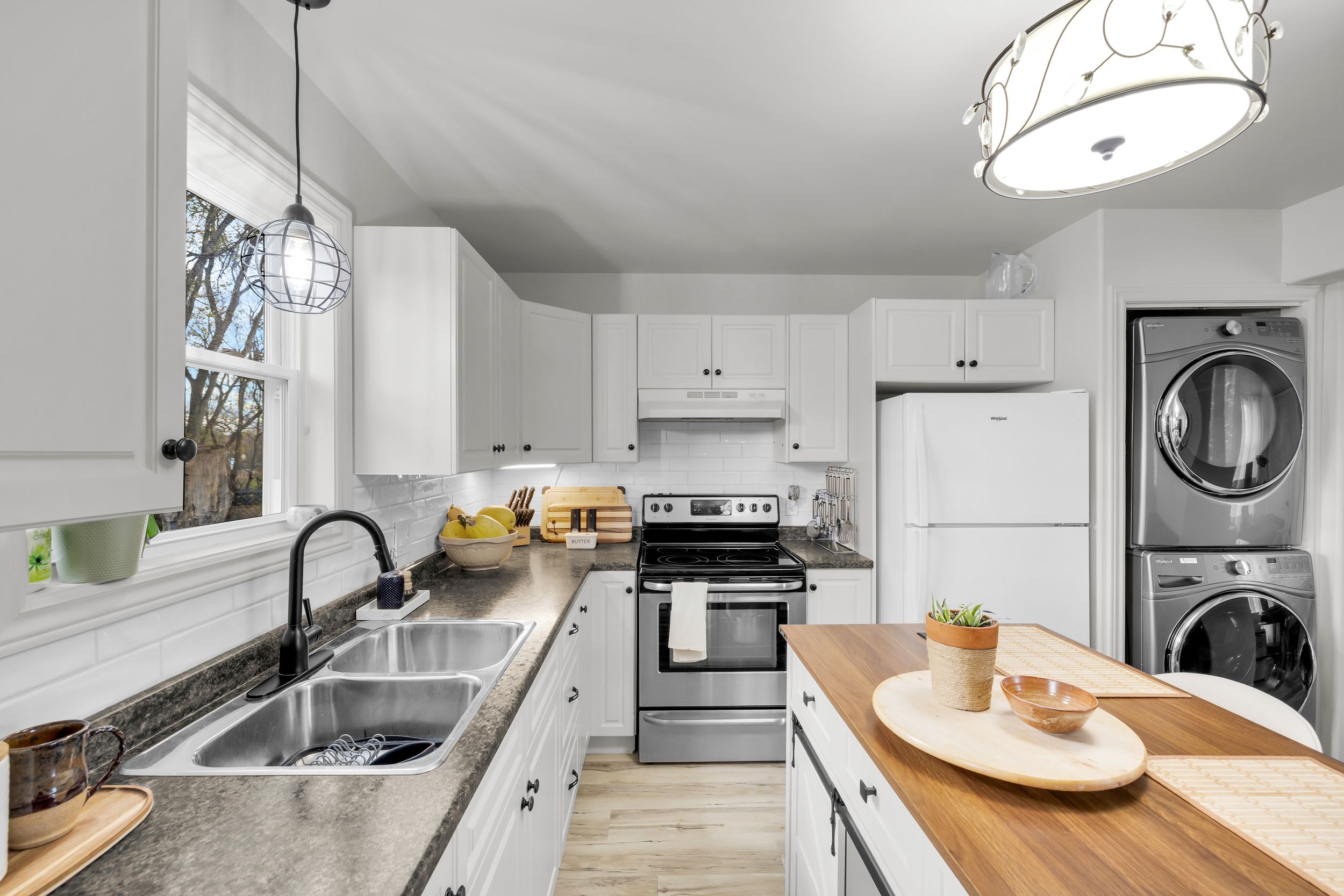 • Stylish kitchen with clean finishes and open dining/living space.
