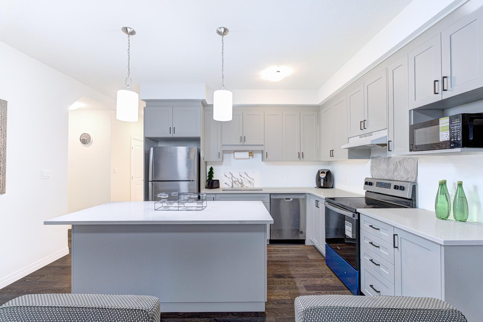 • Modern kitchen featuring a large island and quartz countertops.