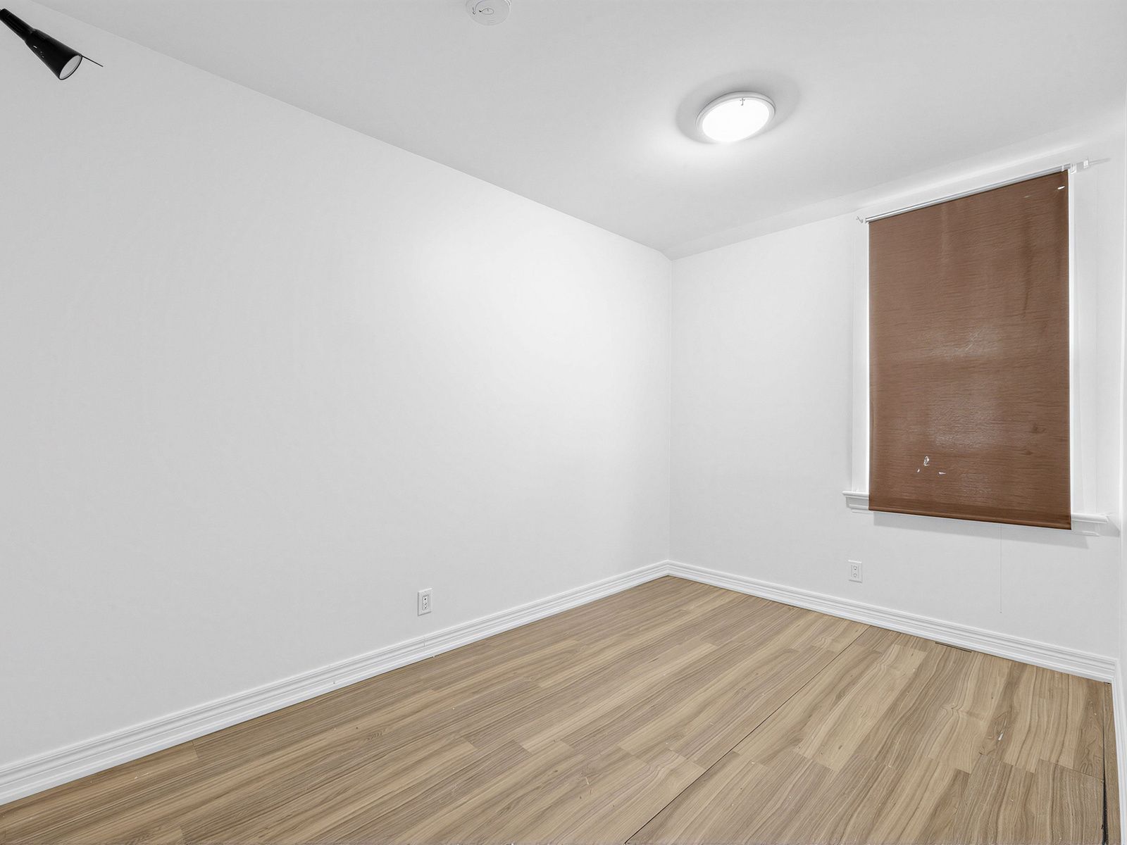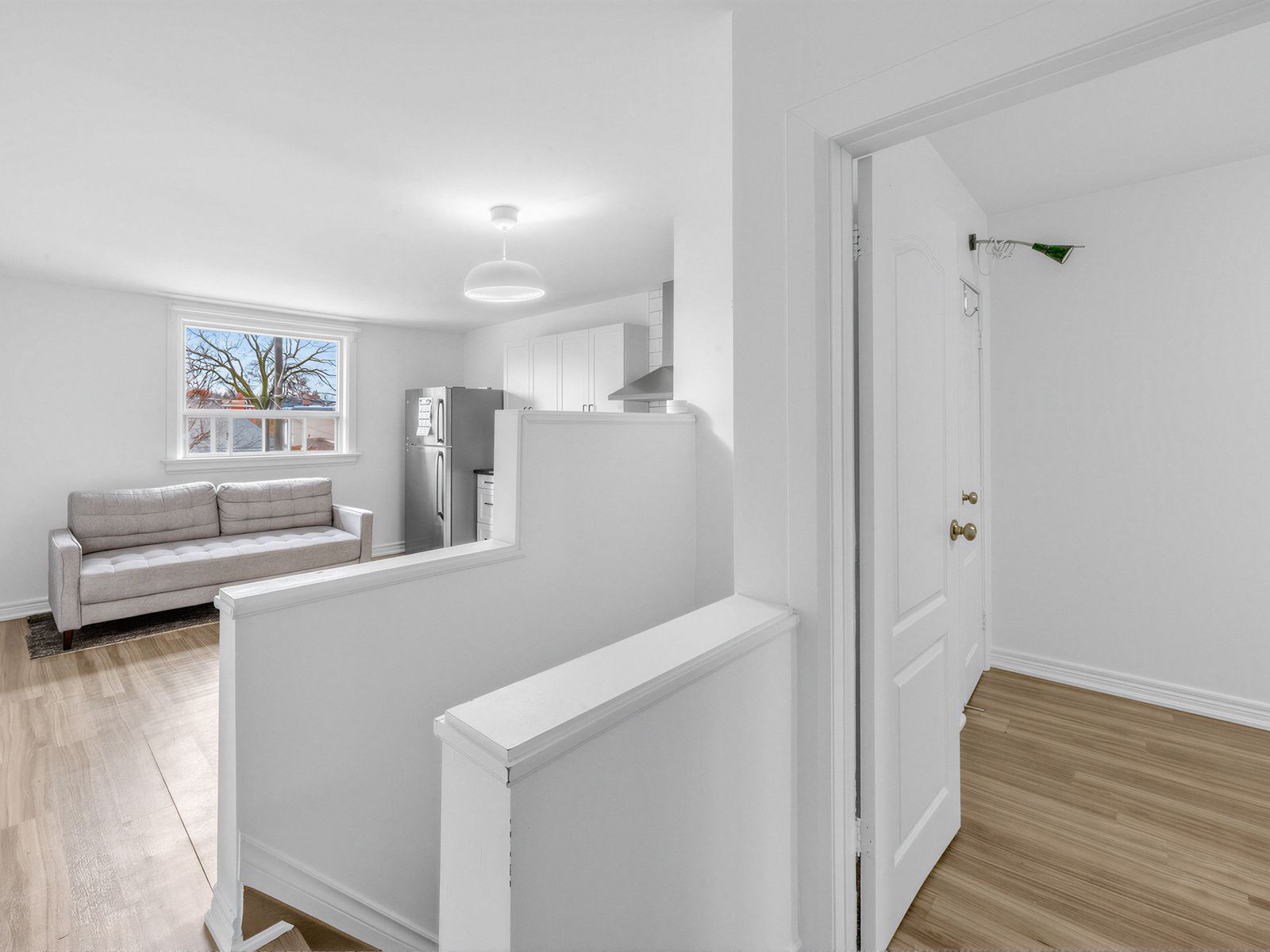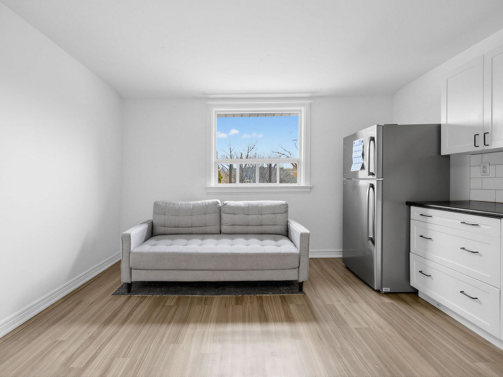 • Bright upper-level 1-bedroom apartment with large windows and laminate floors.